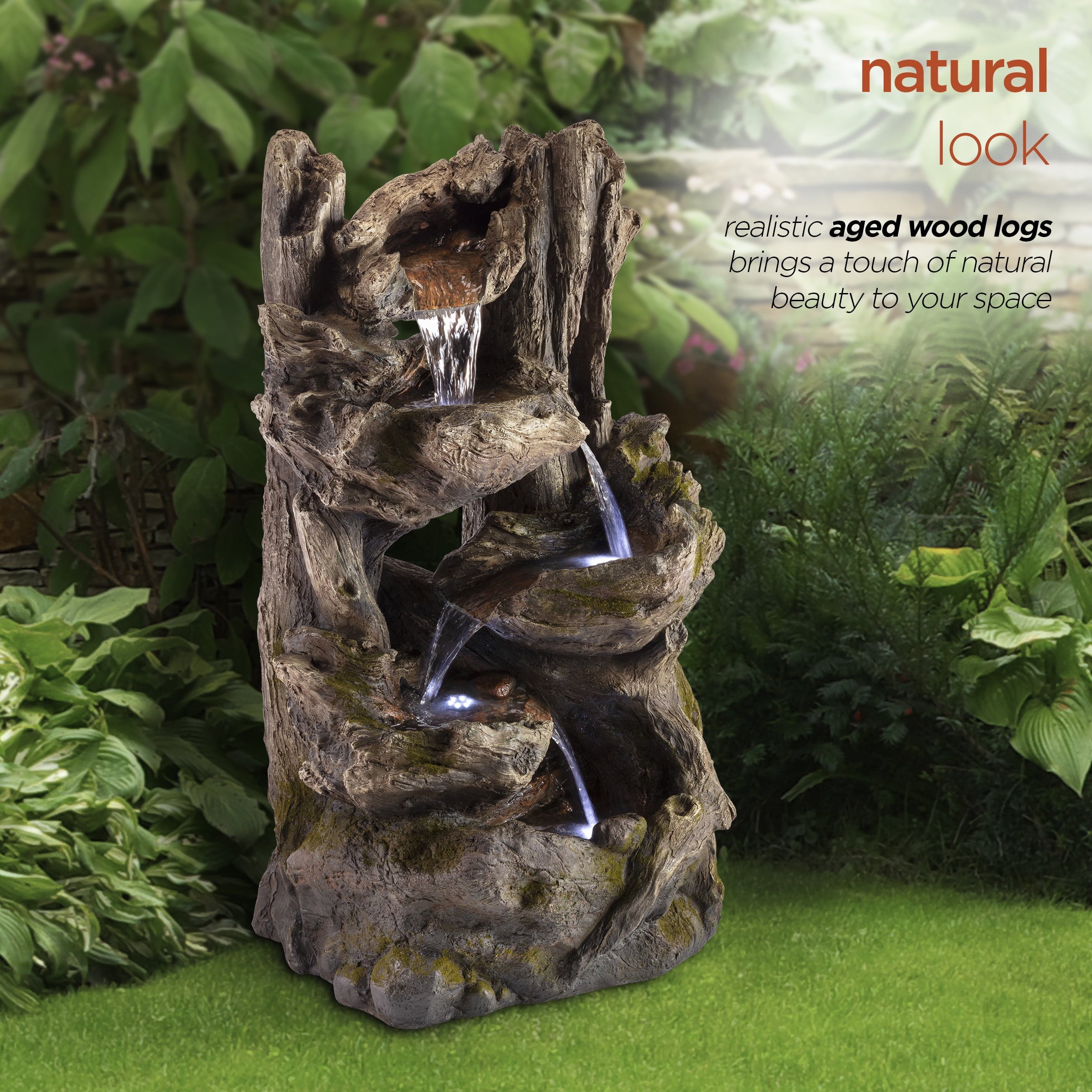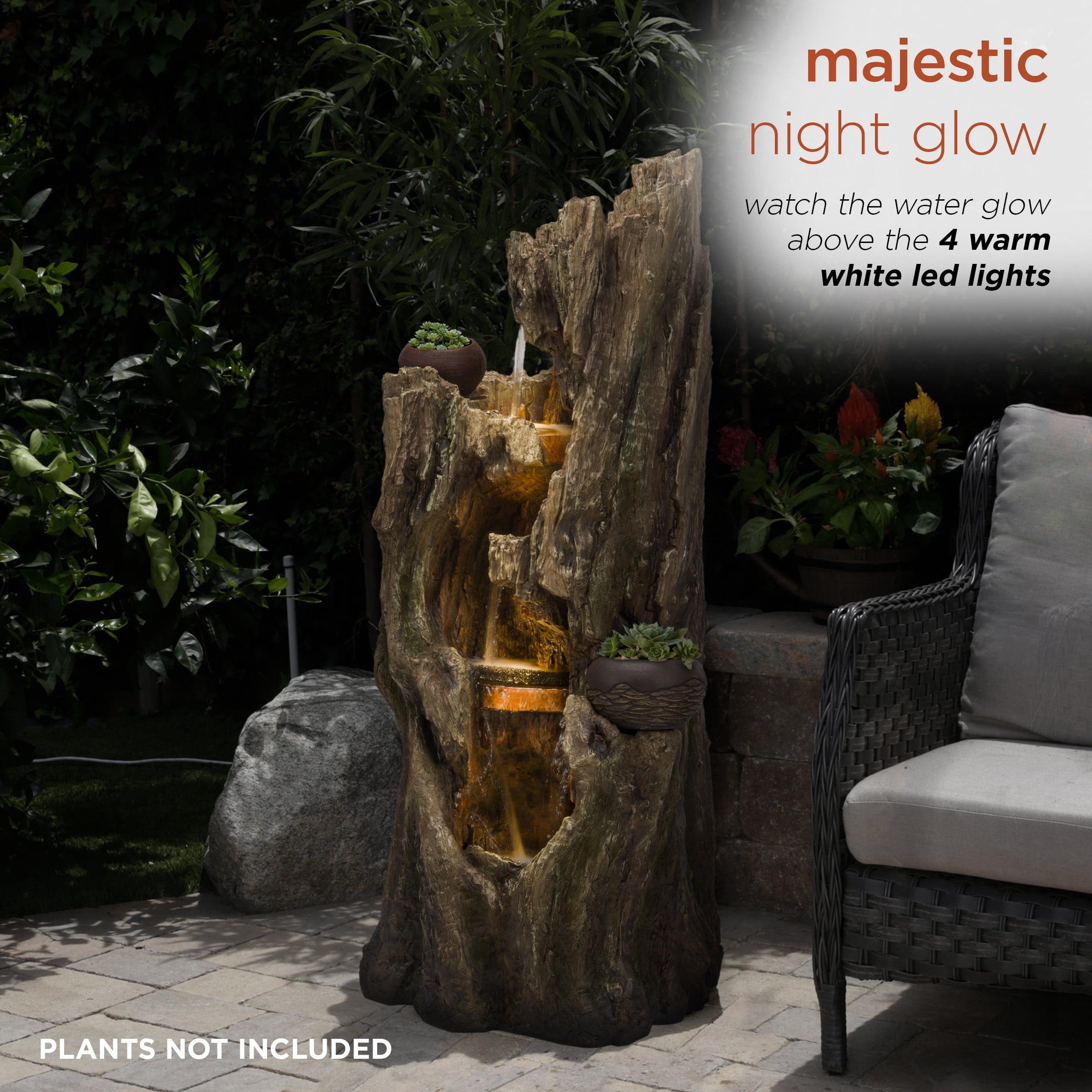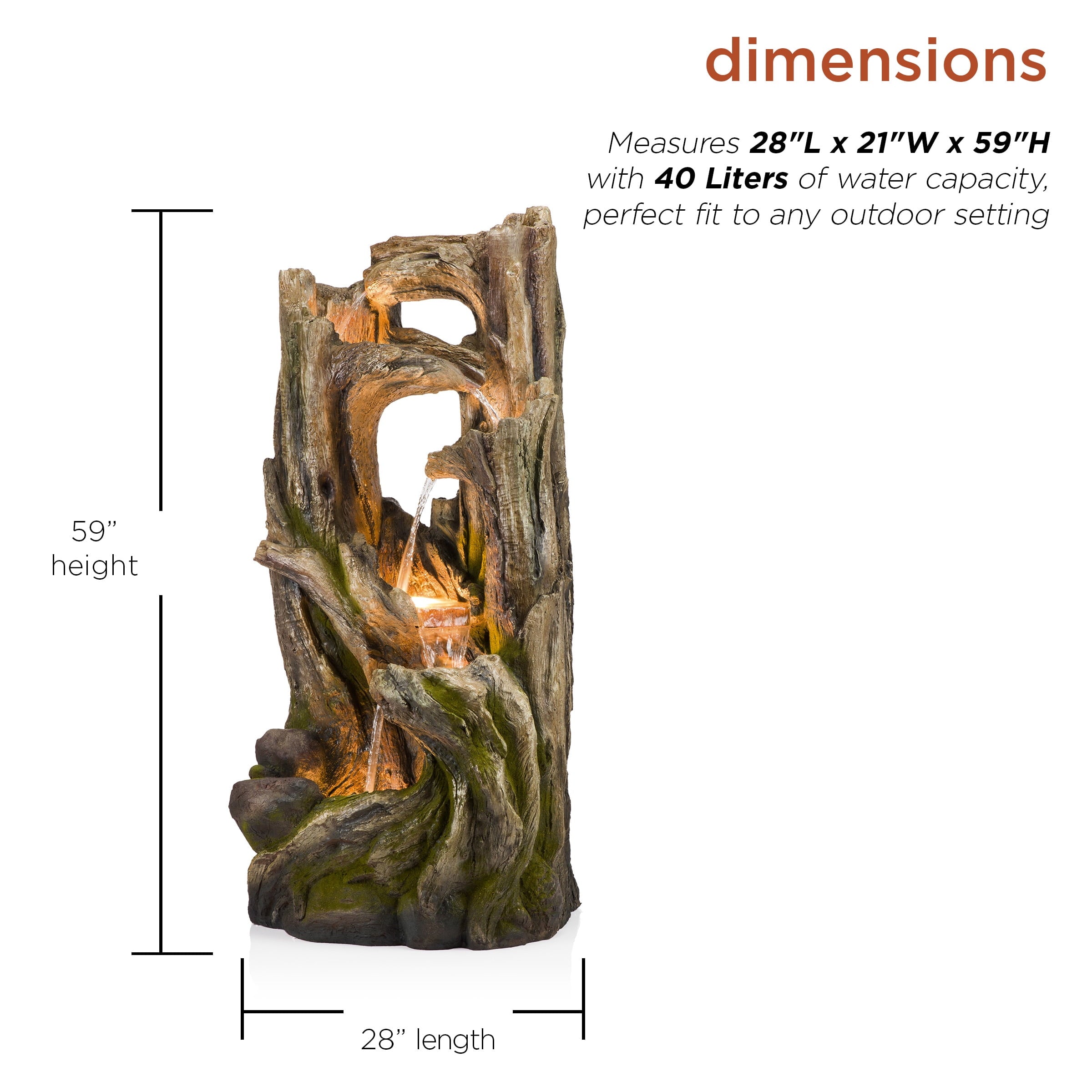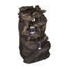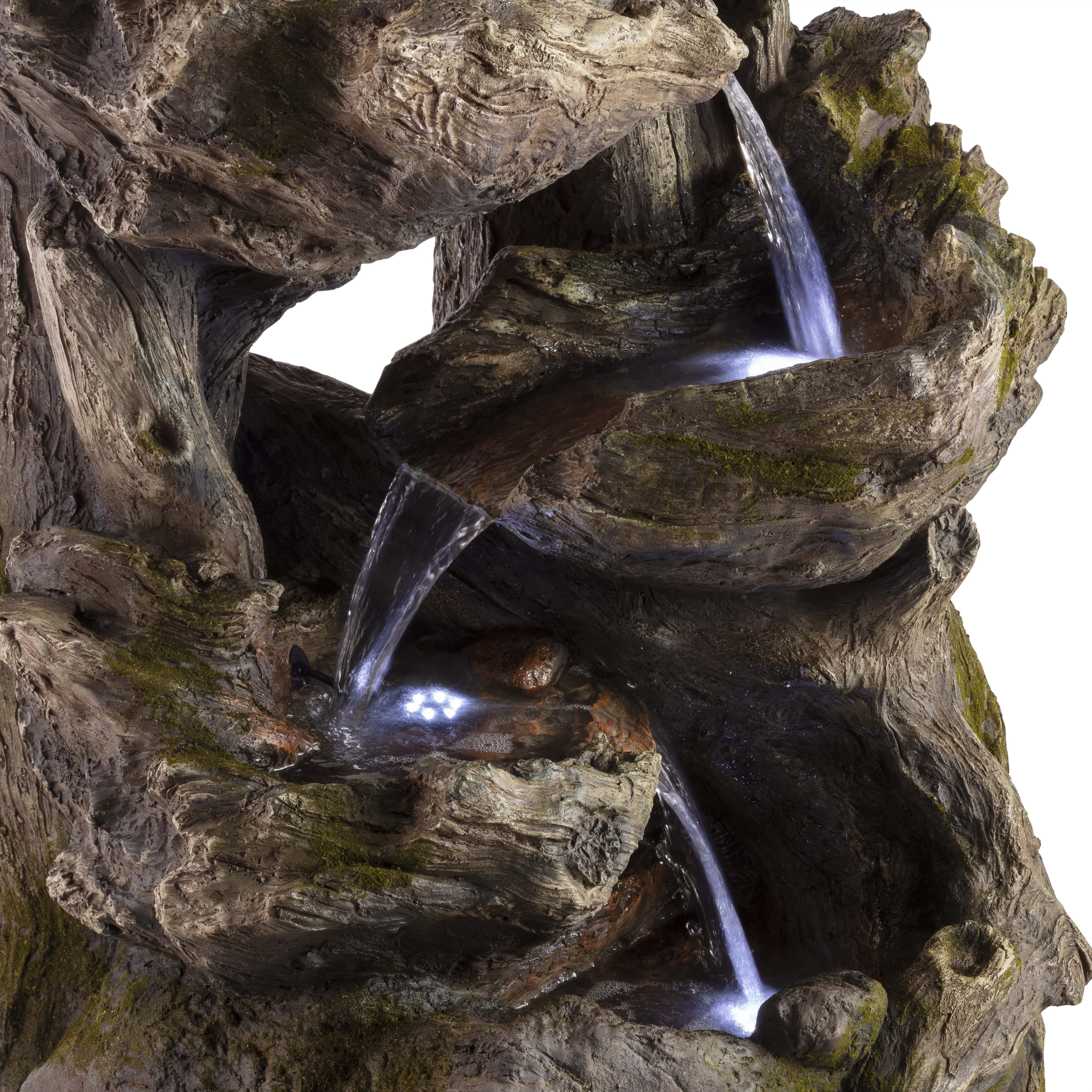 - This Alpine Corporation Rainforest Fountain with 4 warm white LED lgihts and 30L water capacity is the perfect addition to your outdoor décor, as interior pump keeps the water flowing by just plugging it in (1.8m cord and pump adaptor included)