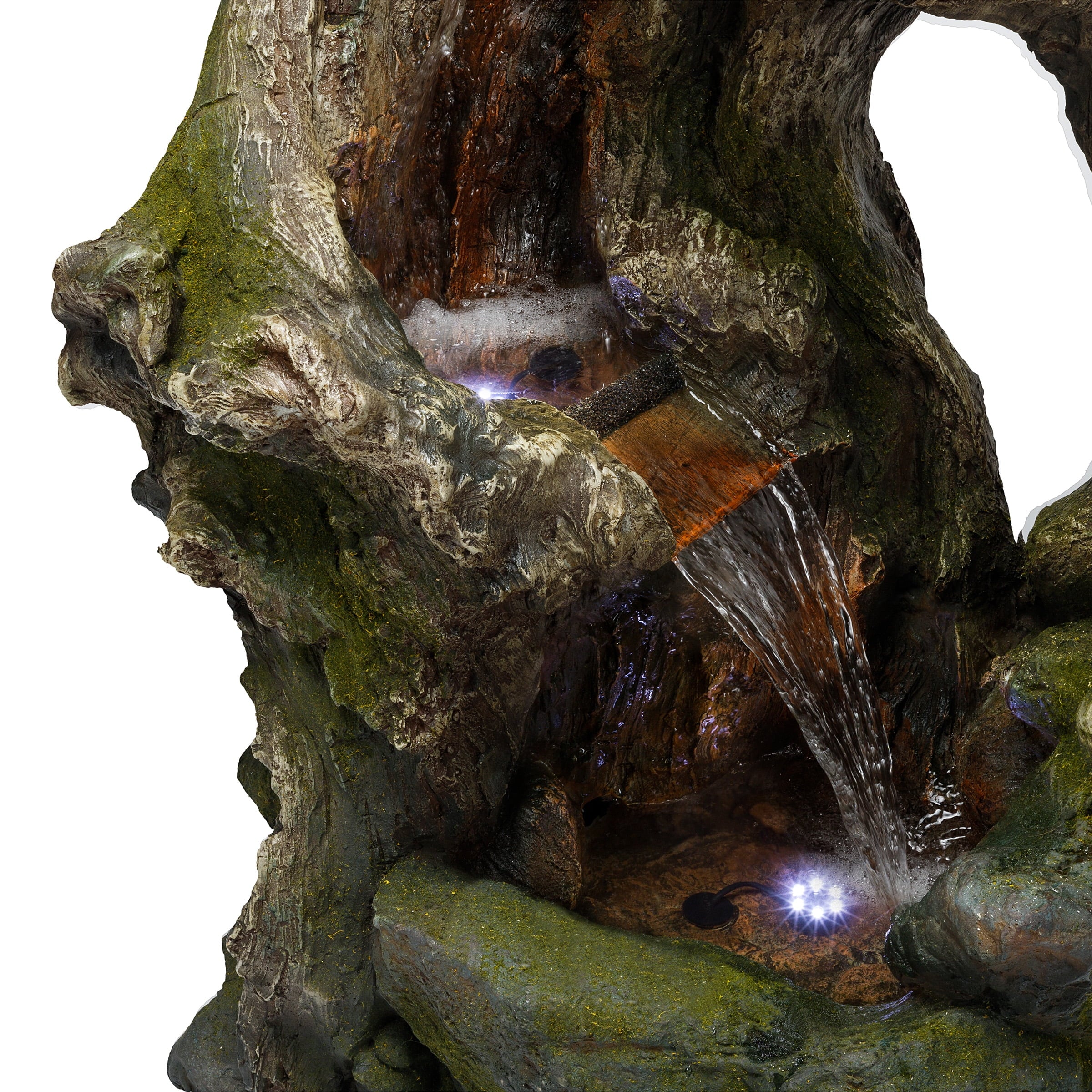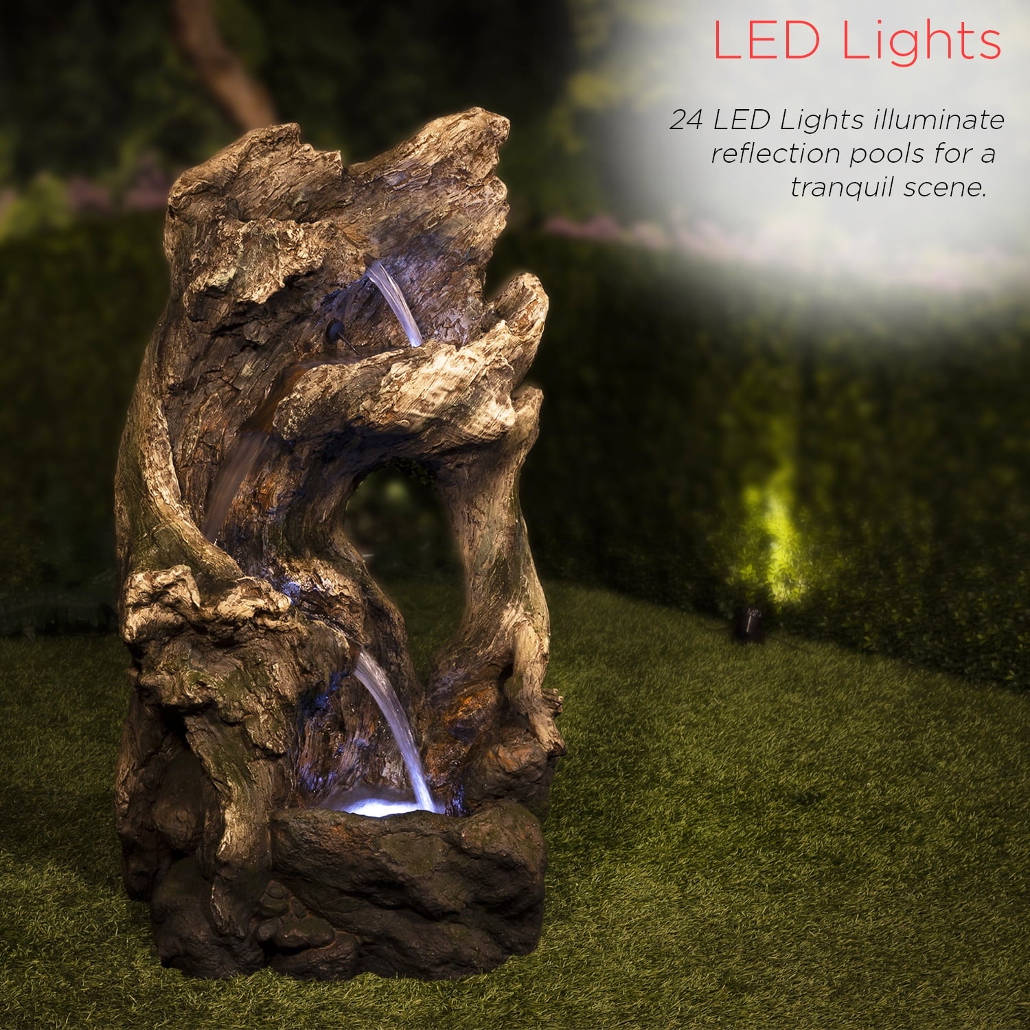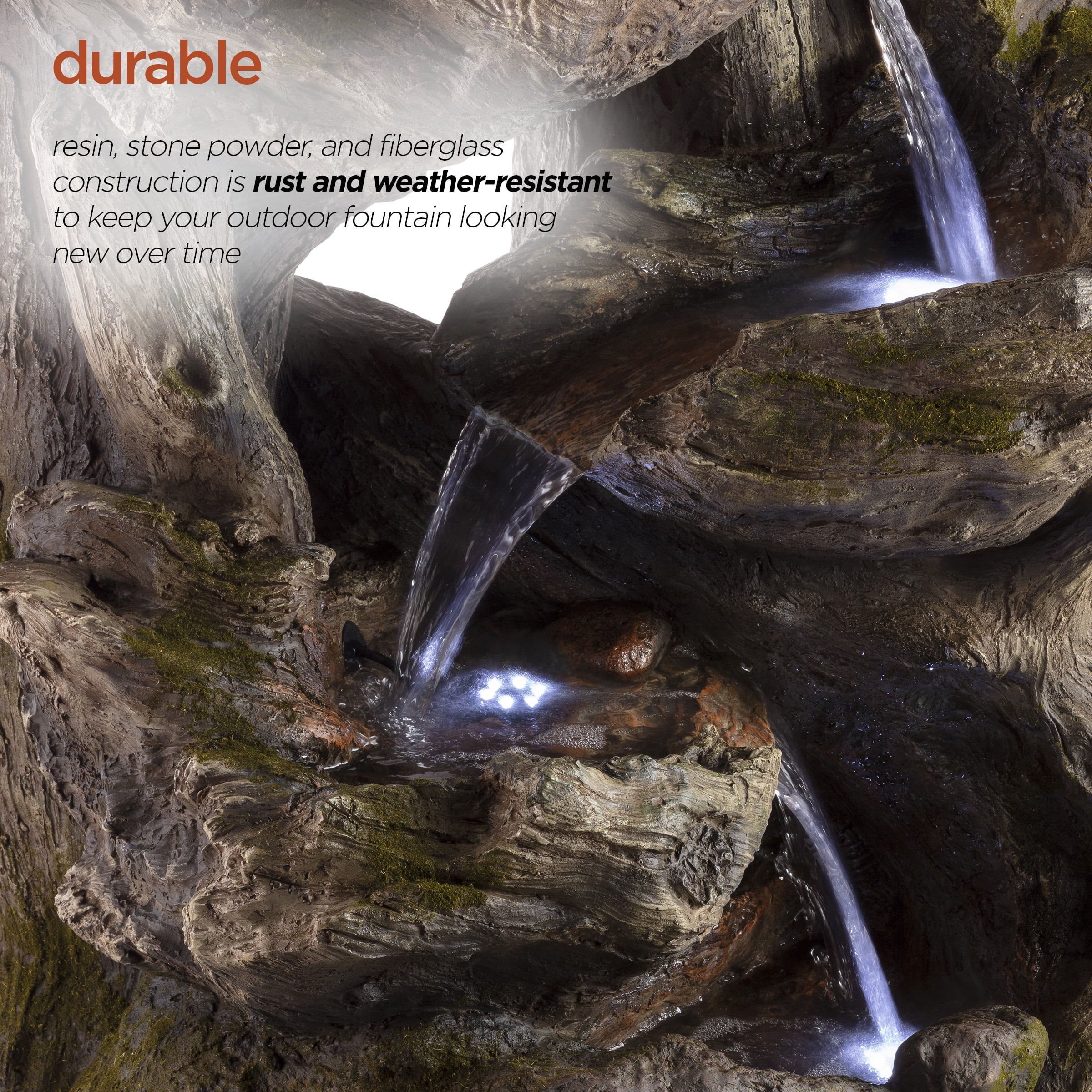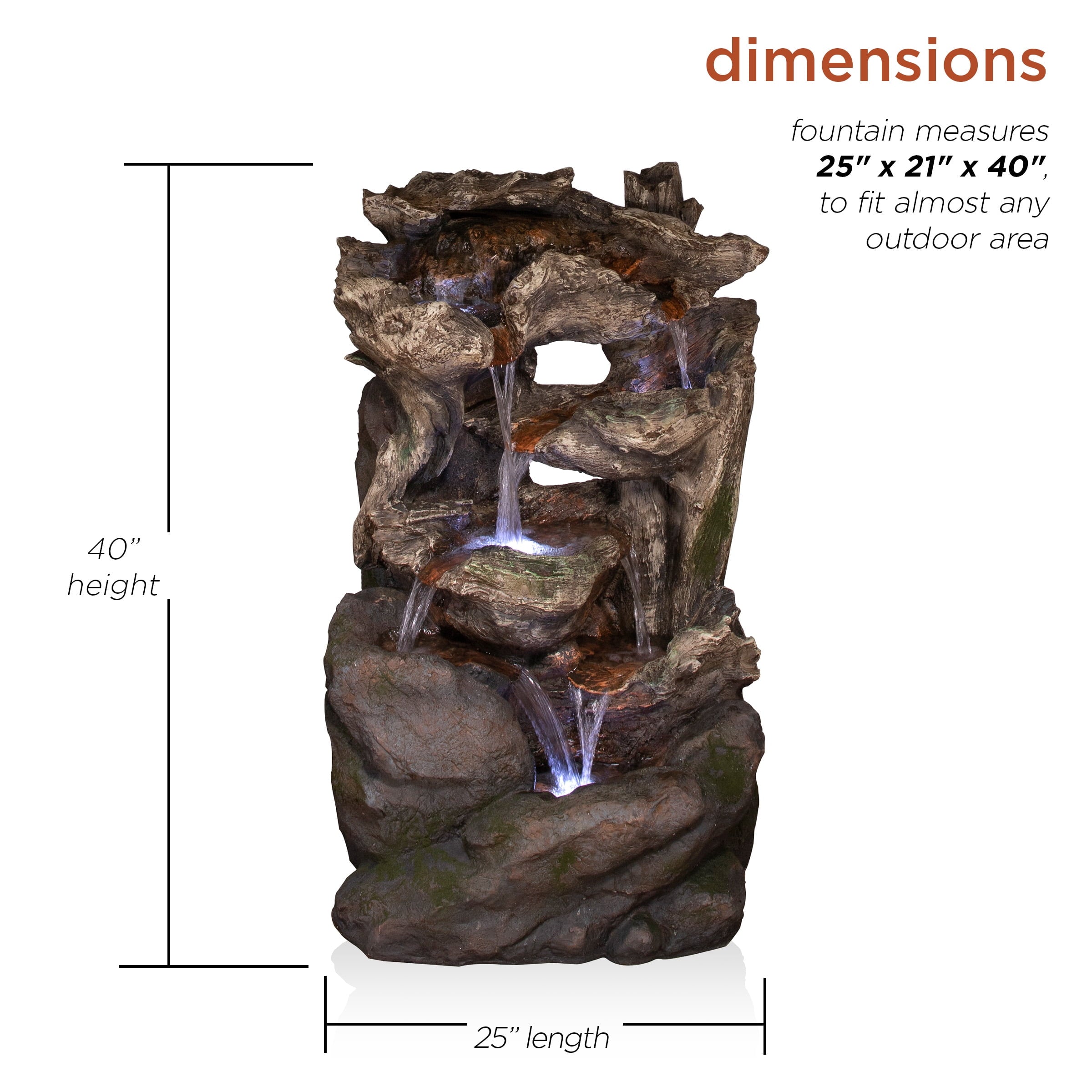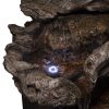 - This Alpine Corporation Rainforest Fountain with 4 warm white LED lgihts and 30L water capacity is the perfect addition to your outdoor décor, as interior pump keeps the water flowing by just plugging it in (1.8m cord and pump adaptor included)