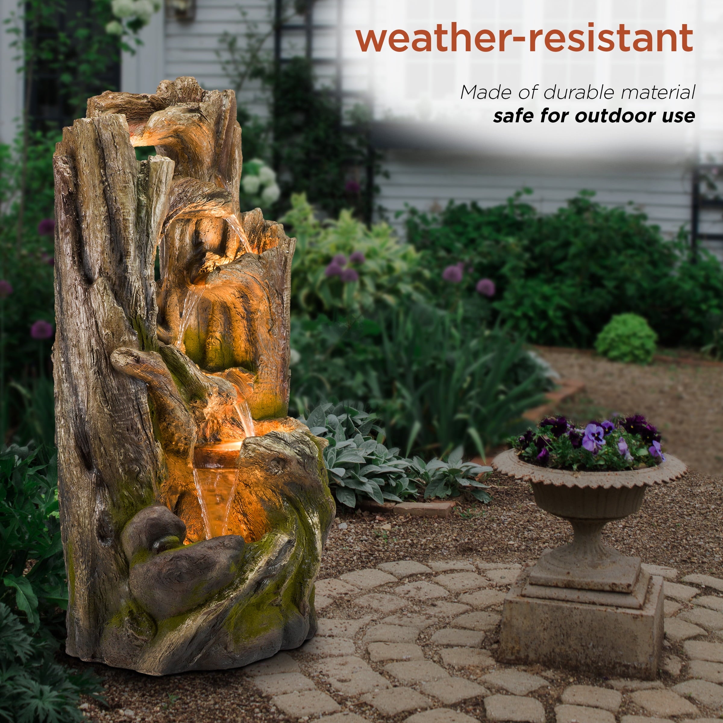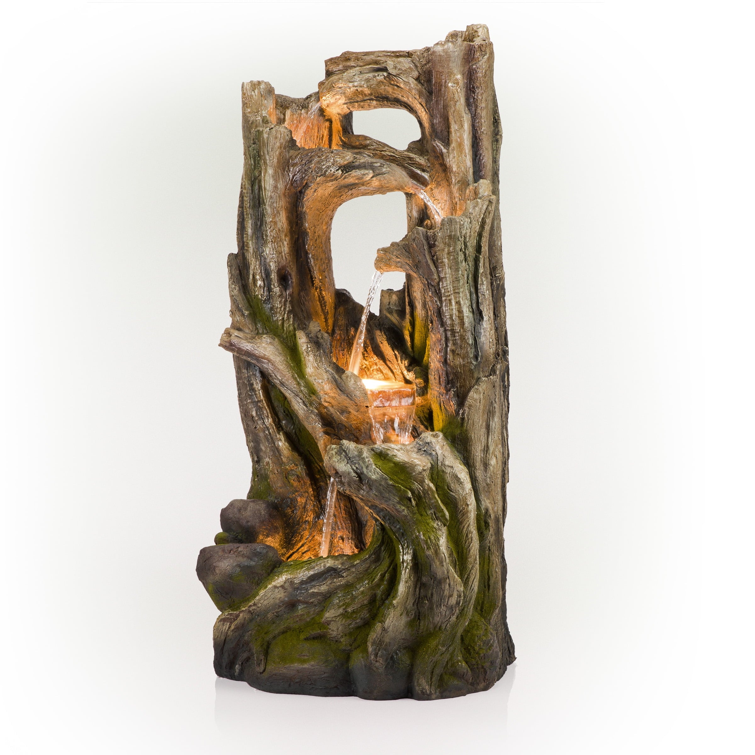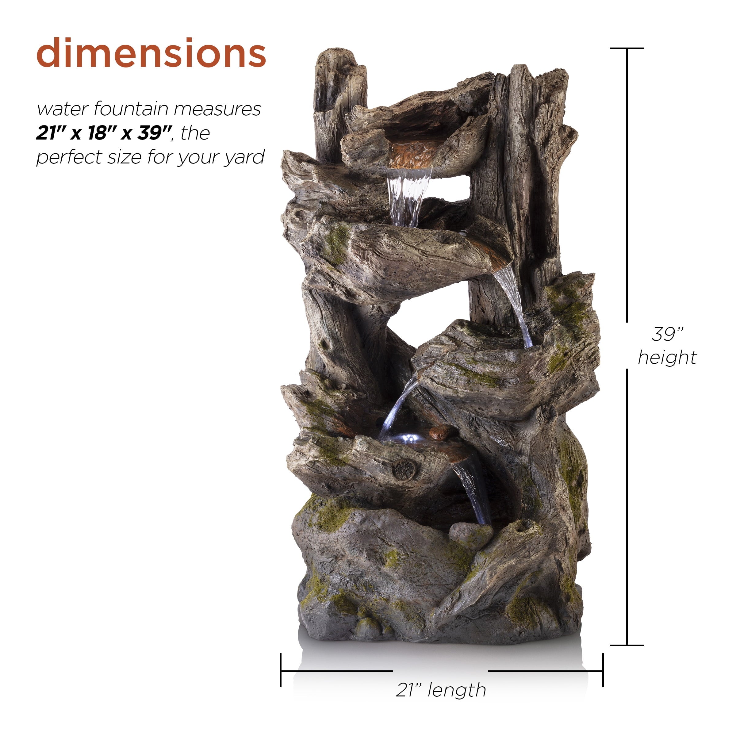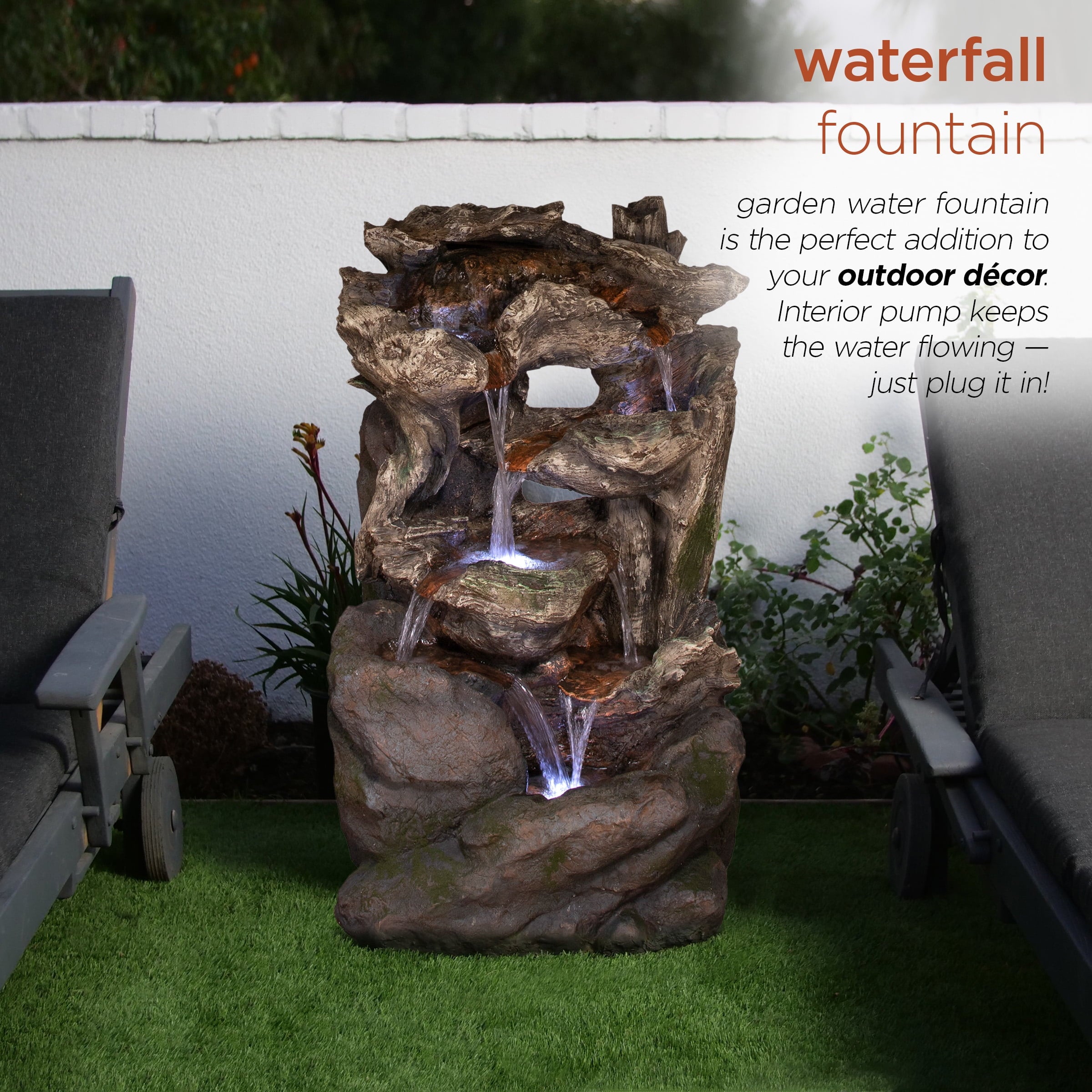 The Alpine Corporation Cascading Willow Tree Fountain with LED Lights features 4 warm white LED light that’s perfect for your home. The interior pump keeps water flowing by just plugging it in (1.8m cord is included). Constructed of weather-resistant durable resin, stone powder and fiber glass for lasting use. Create a peaceful, meditative atmosphere even in an urban jungle as you rejuvenate with our natural style fountains. You will feel like you are sitting next to a majestic mountain stream in the great outdoors all while relaxing in your own lush garden. The sound of birds frolicking to the running water will create the tranquil environment of everyone’s envy. With the water gently cascading over natural-looking stone, Alpines cascading fountain is sure to be a vivid focal point to your outdoor décor.