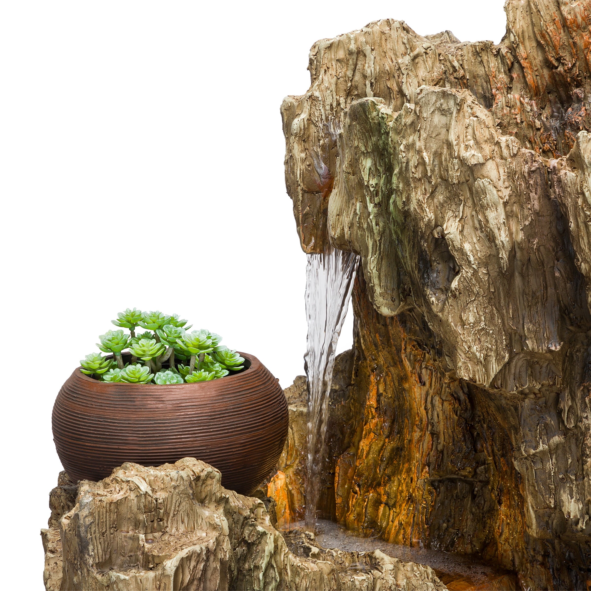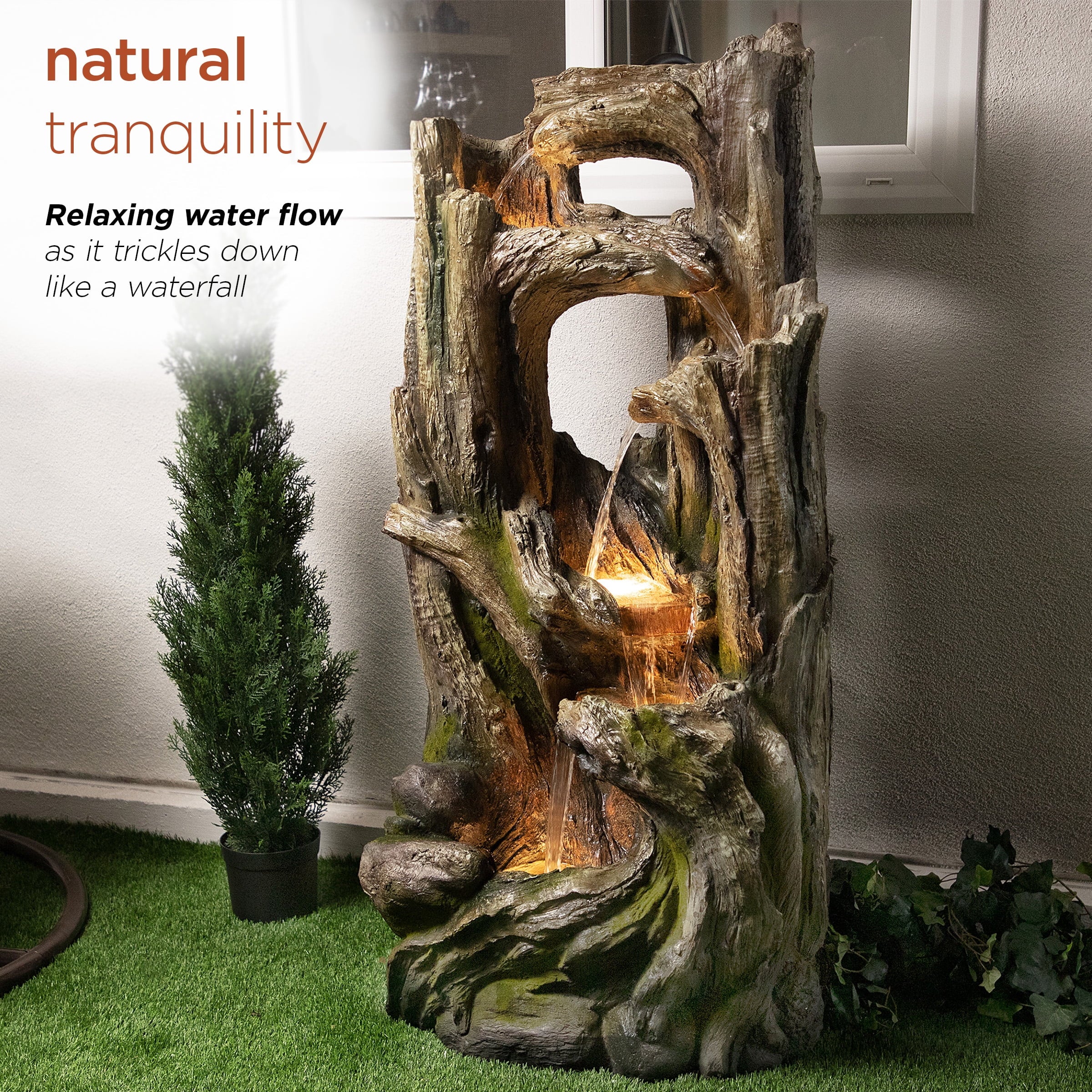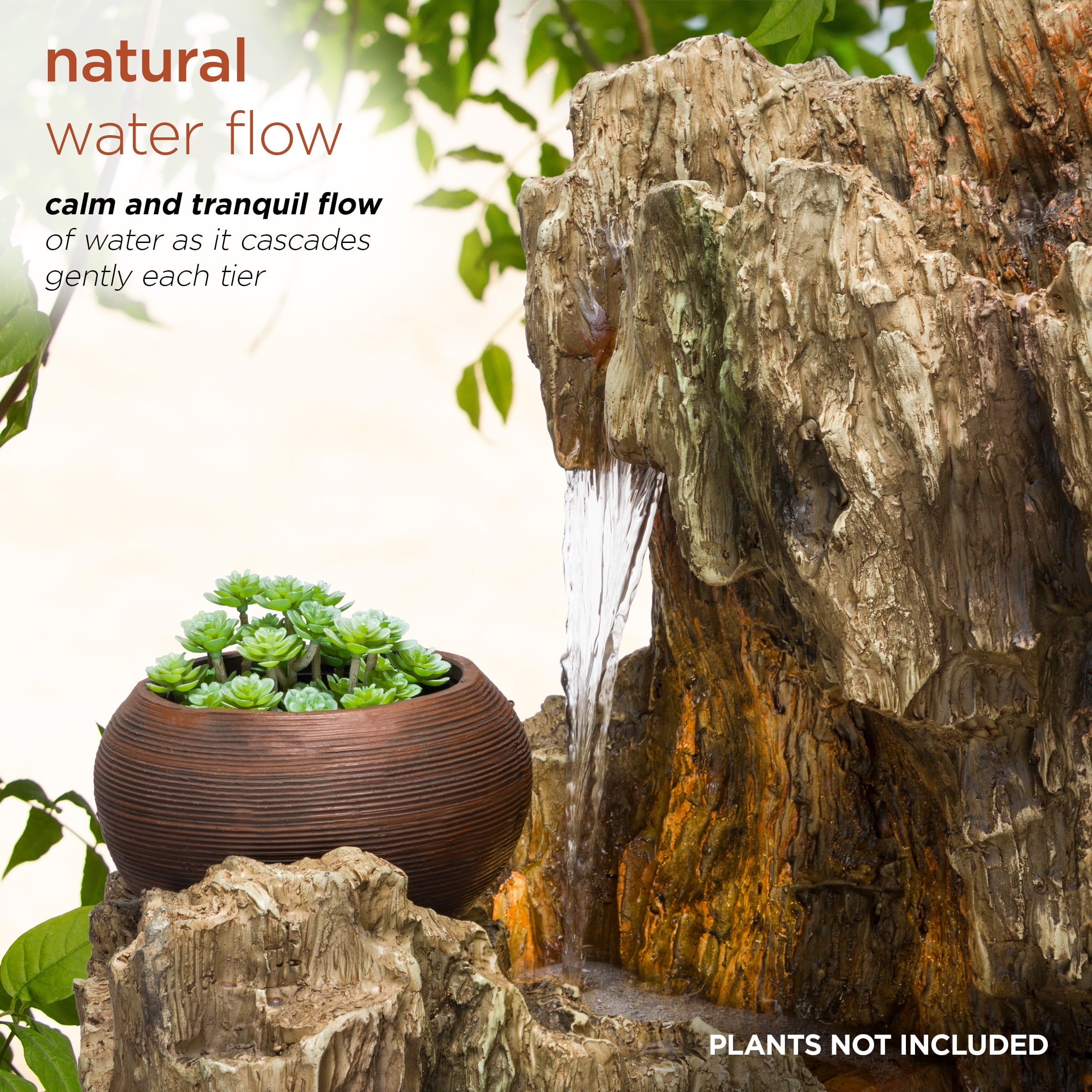 - The design adds a natural look, while the relaxing, gentle water falling helps create a tranquil atmosphere