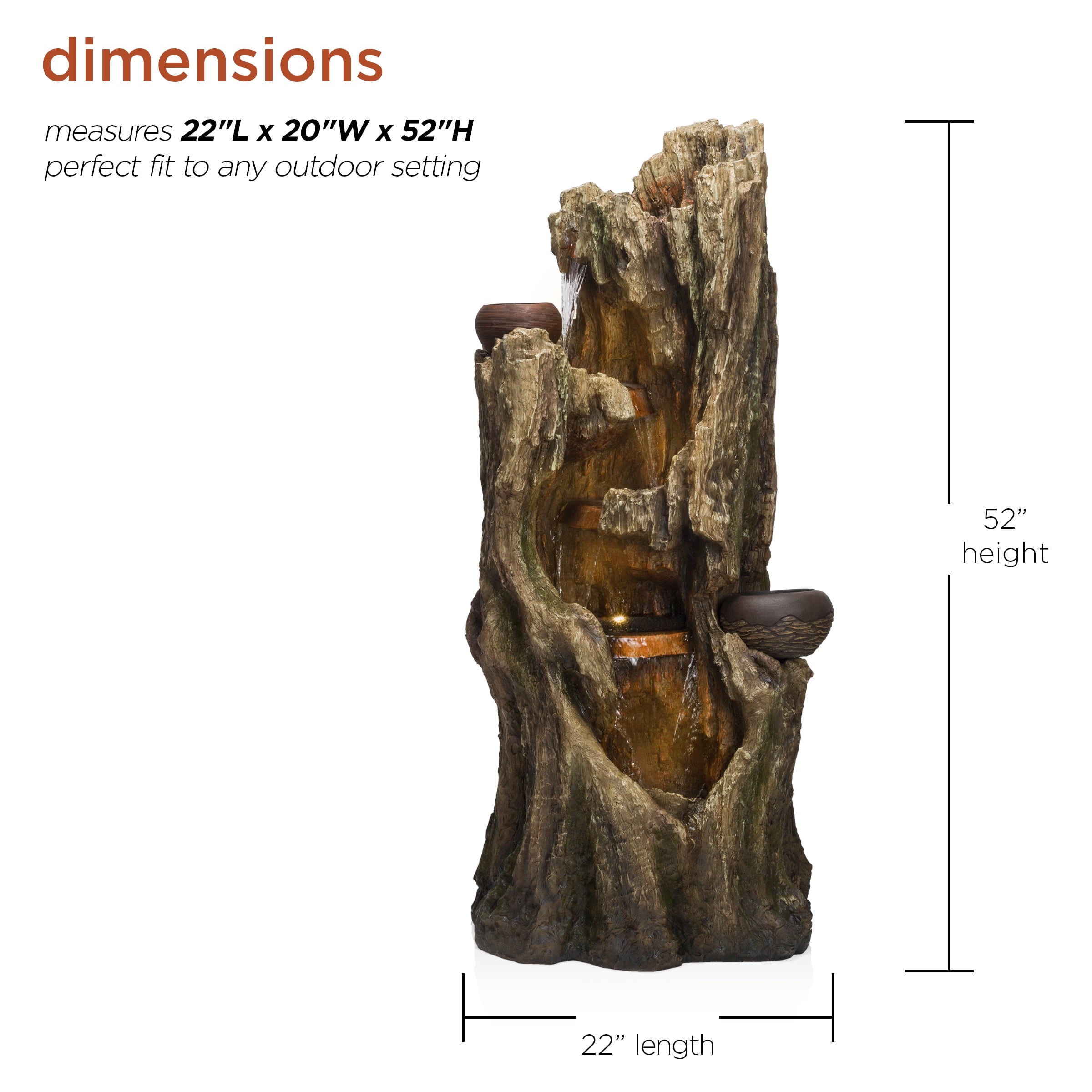 - Fountain measures 20″ x 19″ x 52″, a perfect size for any backyard, patio, garden, or deck