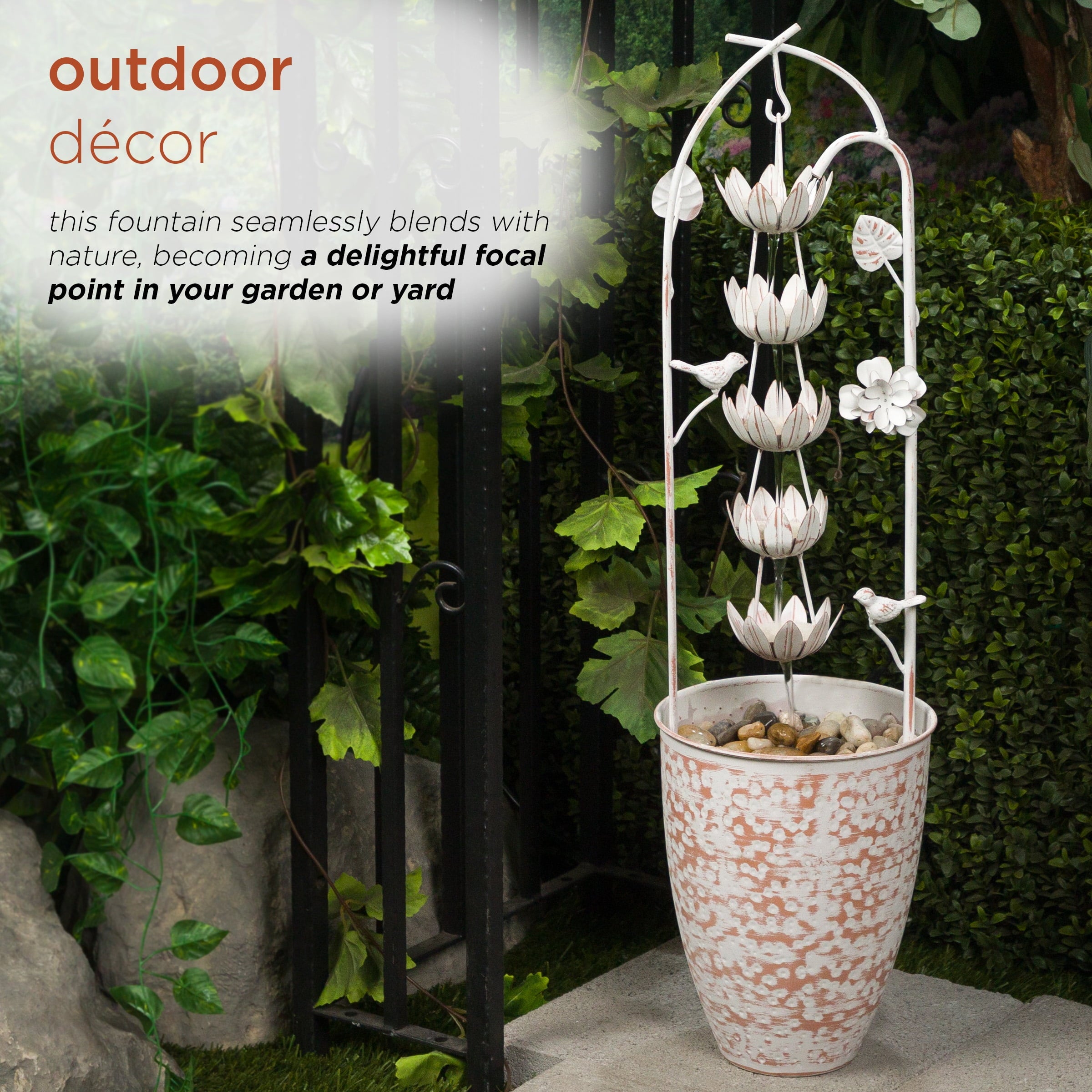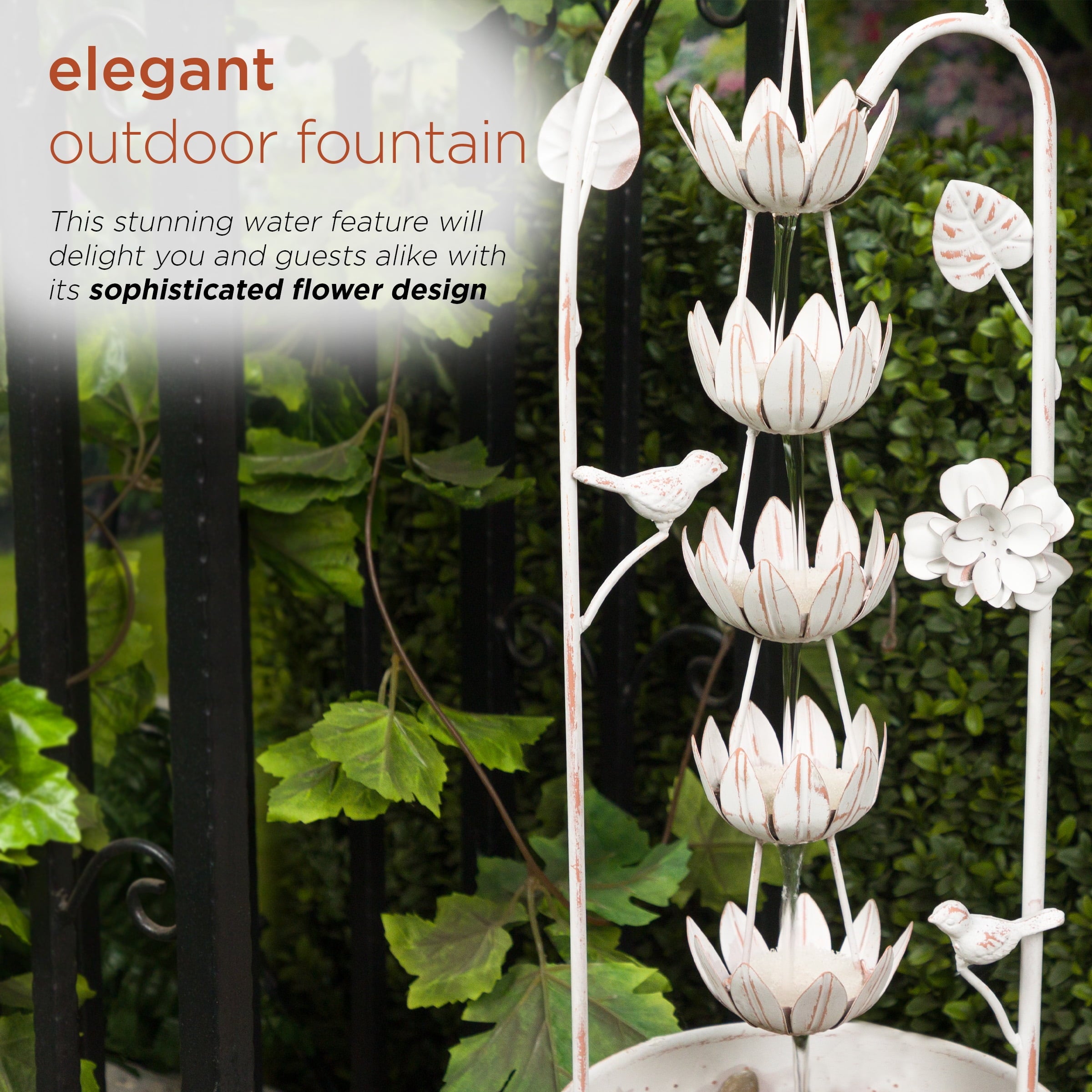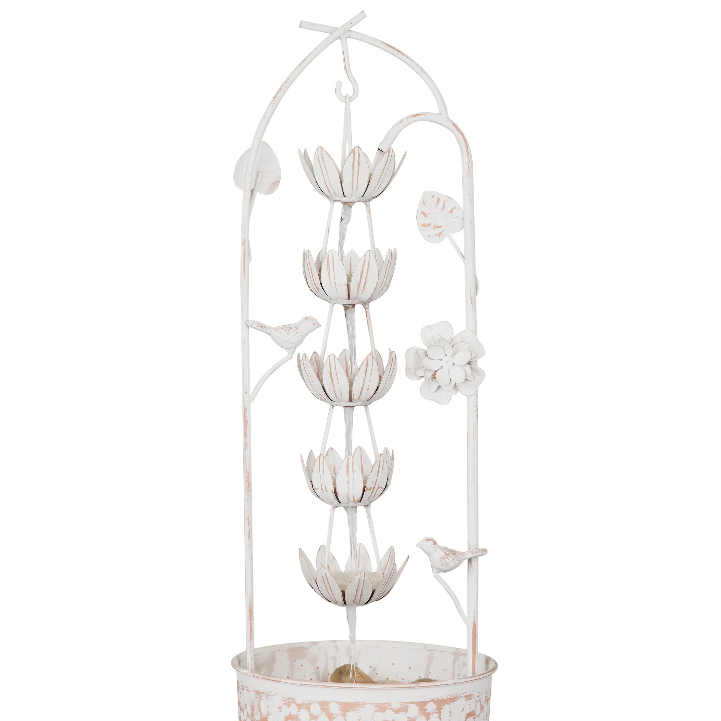 • Rustic Elegance: Enhance your outdoor oasis with the Metal White Rustic Fountain featuring a charming flower design. This fountain adds a touch of rustic elegance to your garden or patio.