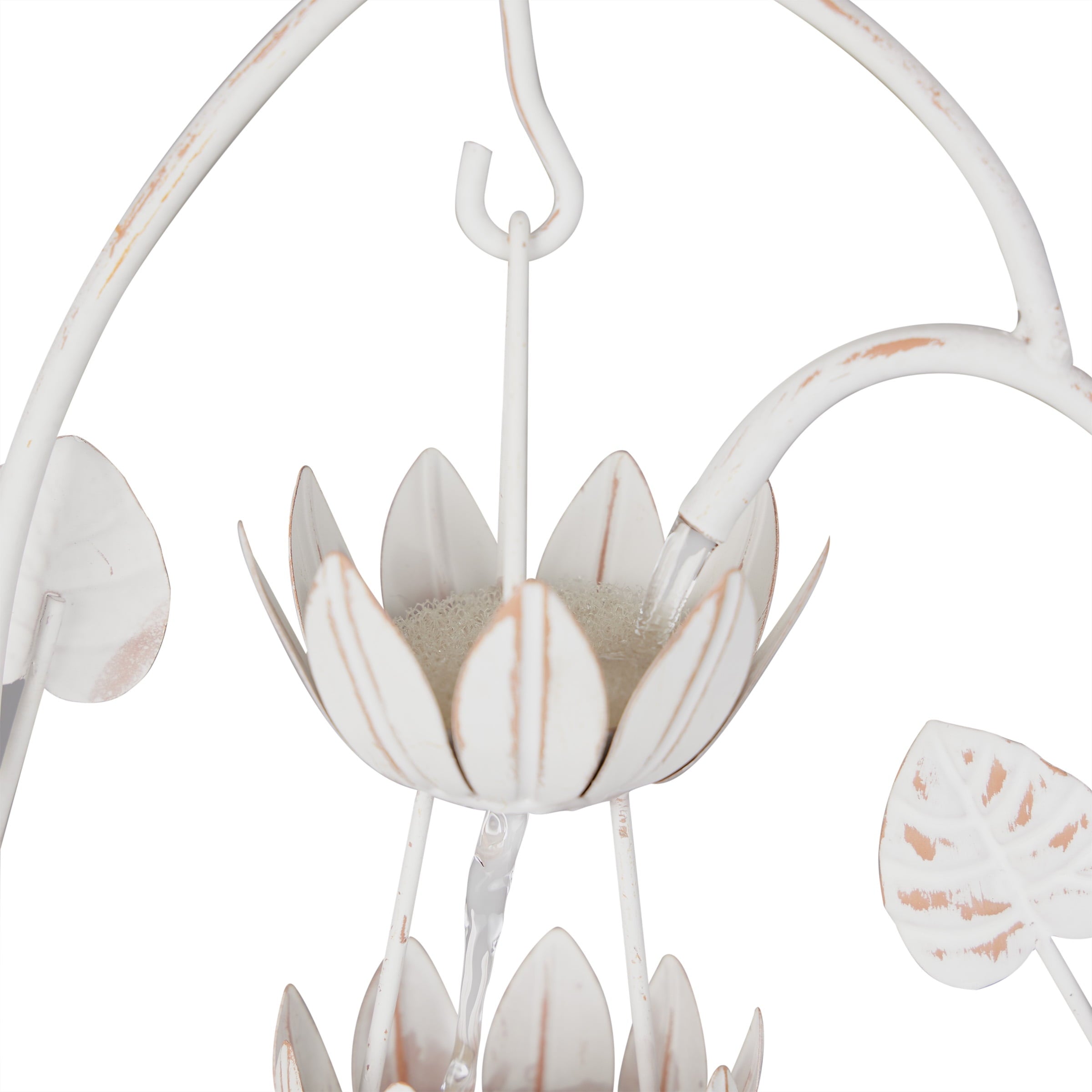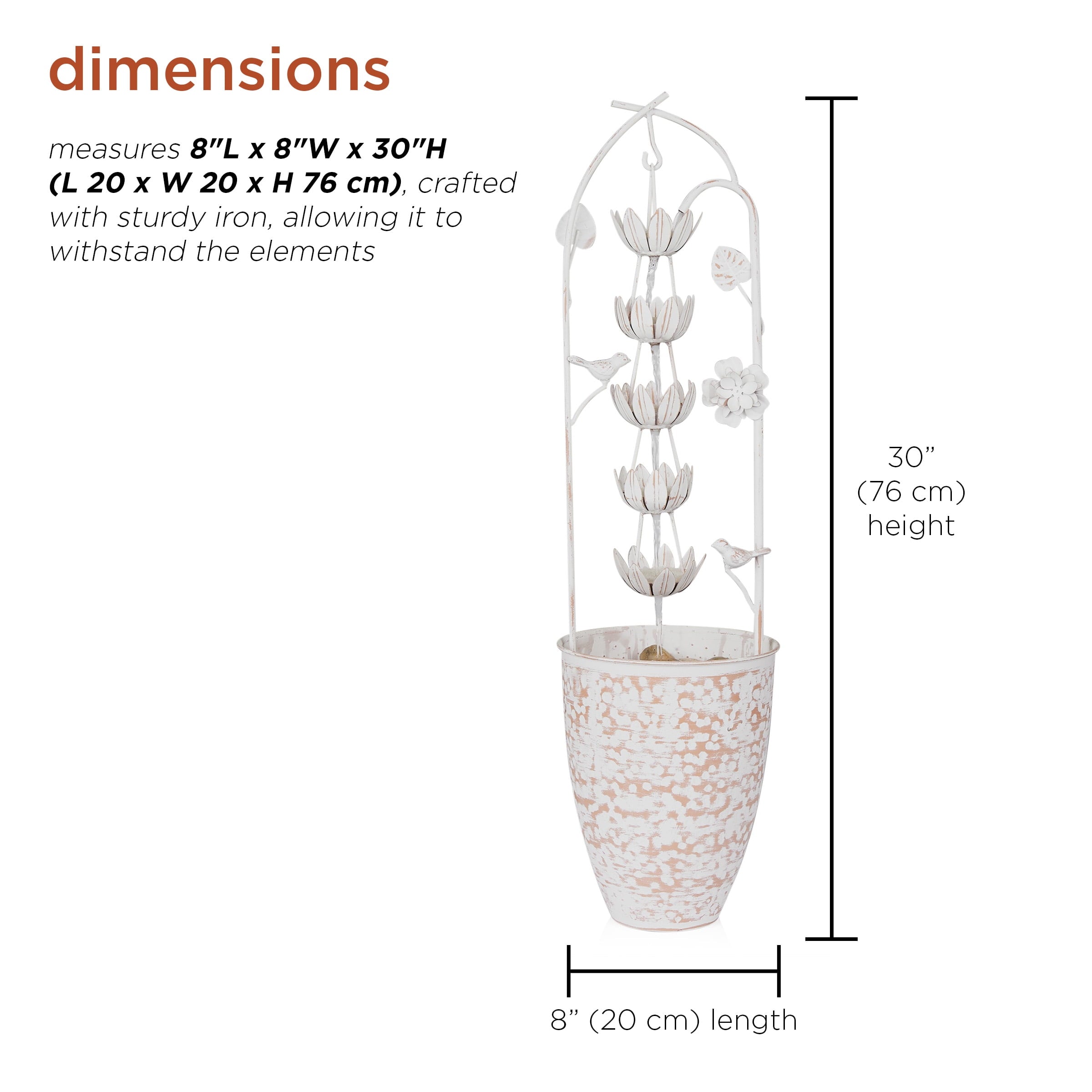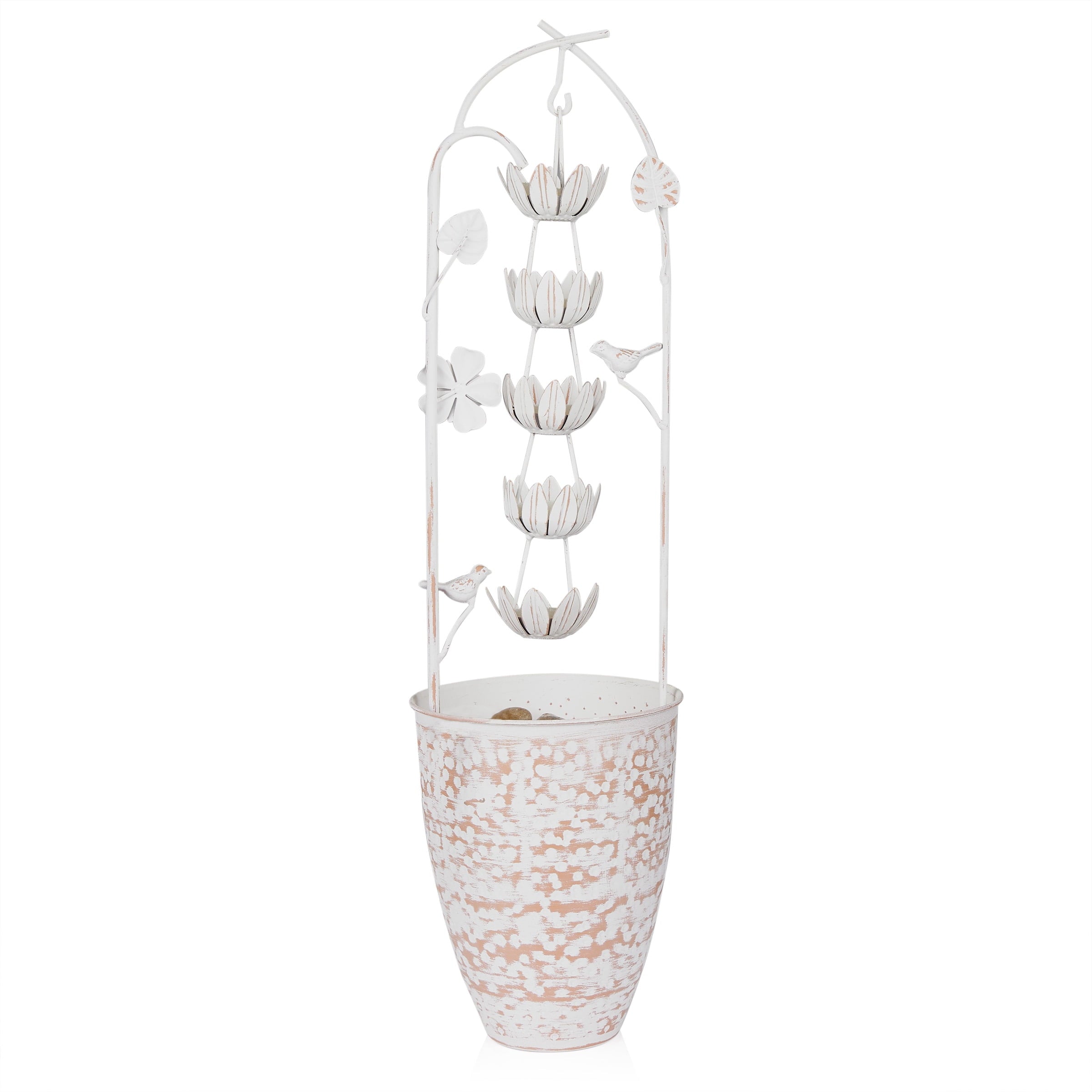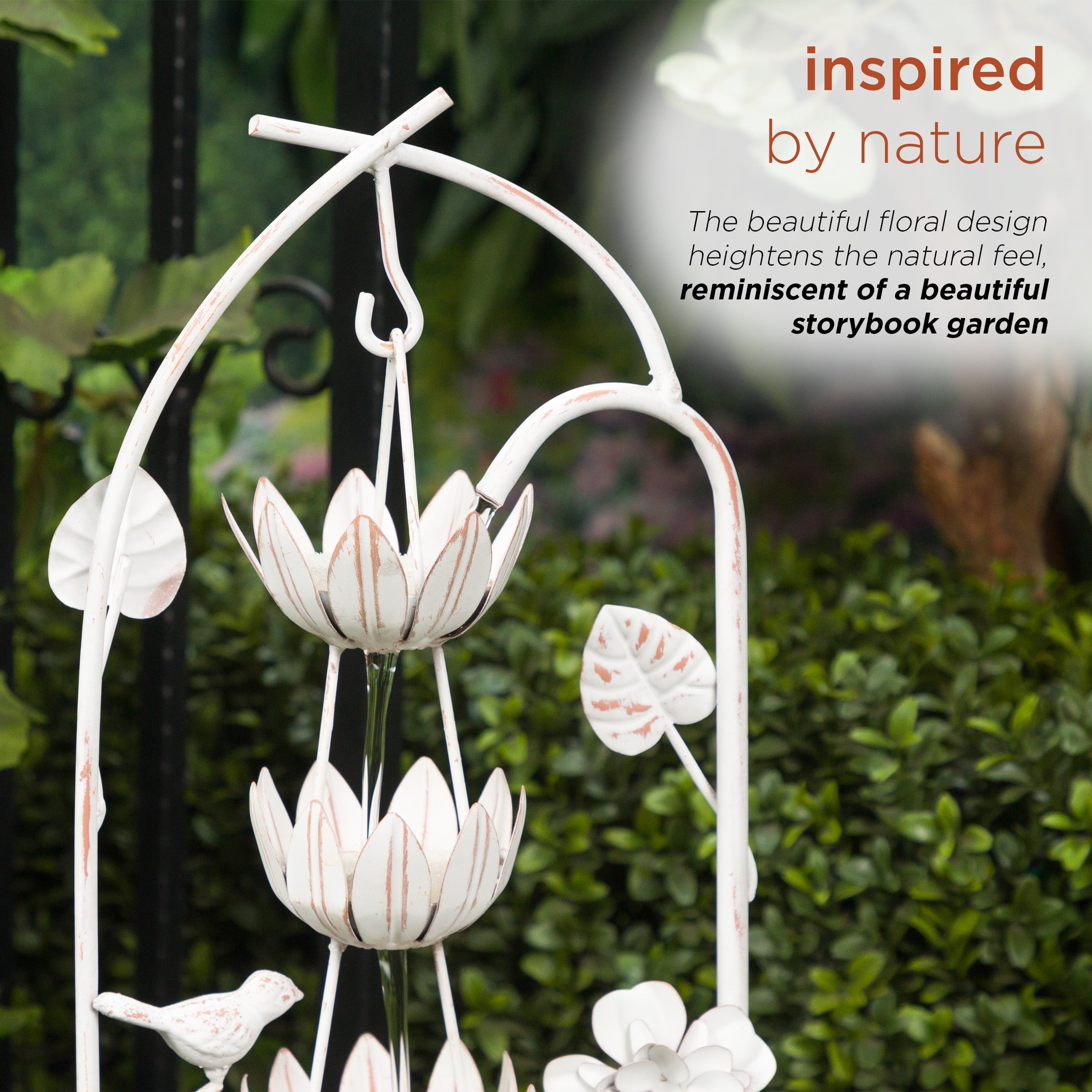 • Rustic Elegance: Enhance your outdoor oasis with the Metal White Rustic Fountain featuring a charming flower design. This fountain adds a touch of rustic elegance to your garden or patio.