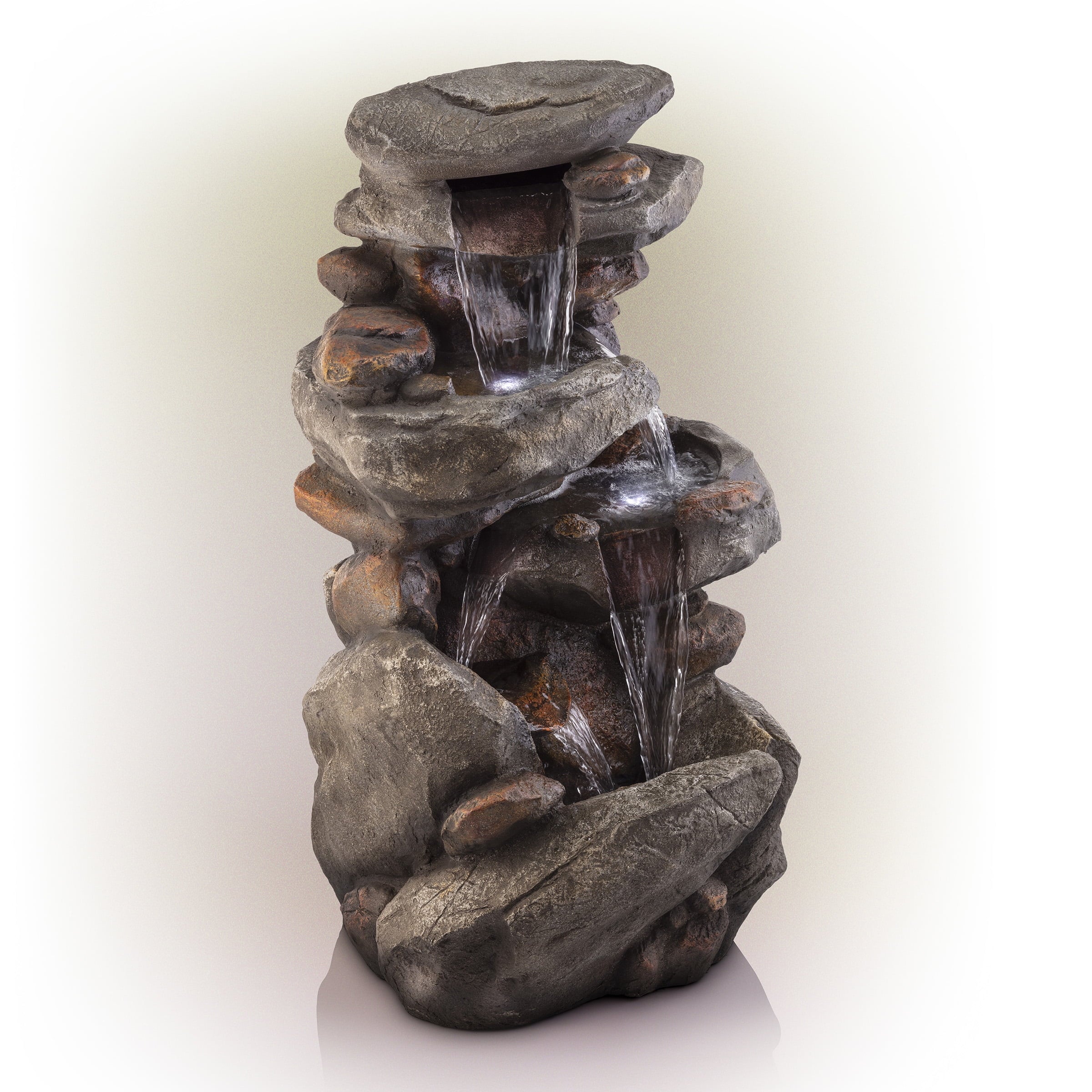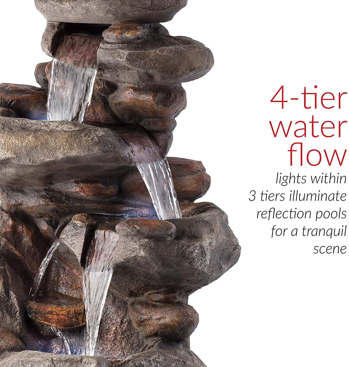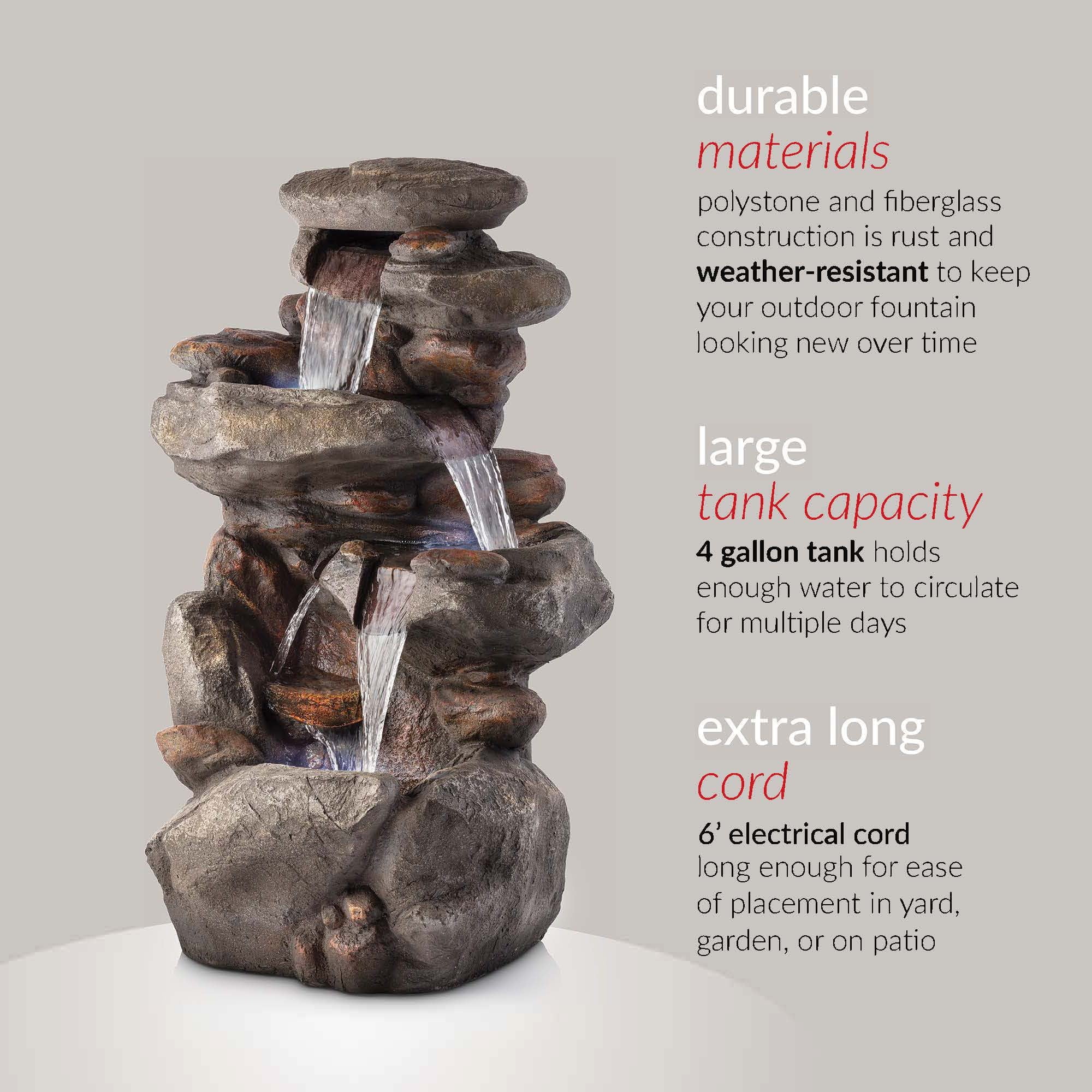 - LED Lights for Nighttime Glow: Integrated LED lights illuminate the cascading water, creating a captivating visual effect and a peaceful ambiance, making this water feature a stunning day and night attraction.