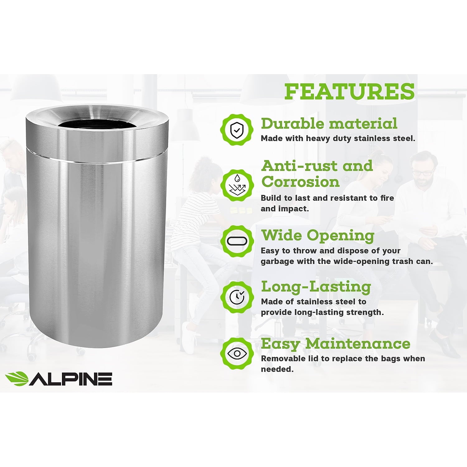 The Alpine Industries 50 Gal. Stainless steel commercial indoor trash can features both heavy-duty material and aesthetic appeal. Able to hold up to 50 Gal. in waste capacity. This is an essential item to have for high traffic facility management. Designed with an open top for quick and easy trash disposal on-the-go. The top conceals trash bags giving it a neat and professional appearance. Easy to lift off lid for simple baggage removal and replacement. Constructed of stainless steel, it is easy to clean and antimicrobial. Made for indoor use only. The Alpine Industries 50 Gallon Stainless Steel Indoor Trashcan features both heavy duty steel material and aesthetic appeal. This trashcan is built to resist the elements, fighting wear and tear whilst being able to hold up to 50 Gallons in waste capacity. This is an essential item to have for high traffic …