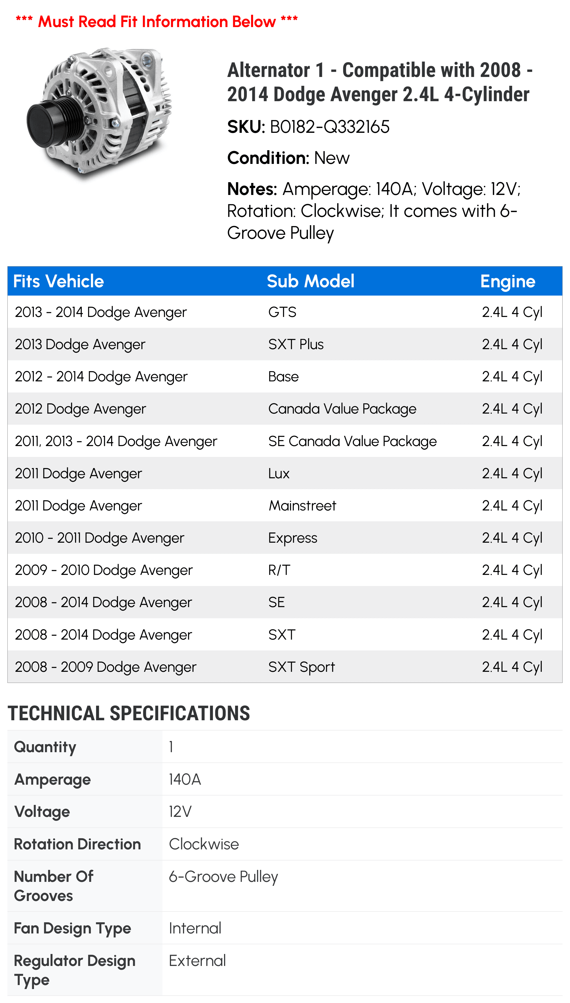 Note: Amperage: 140A; : 12V; Rotation: Clockwise; It comes with 6-Groove Pulley