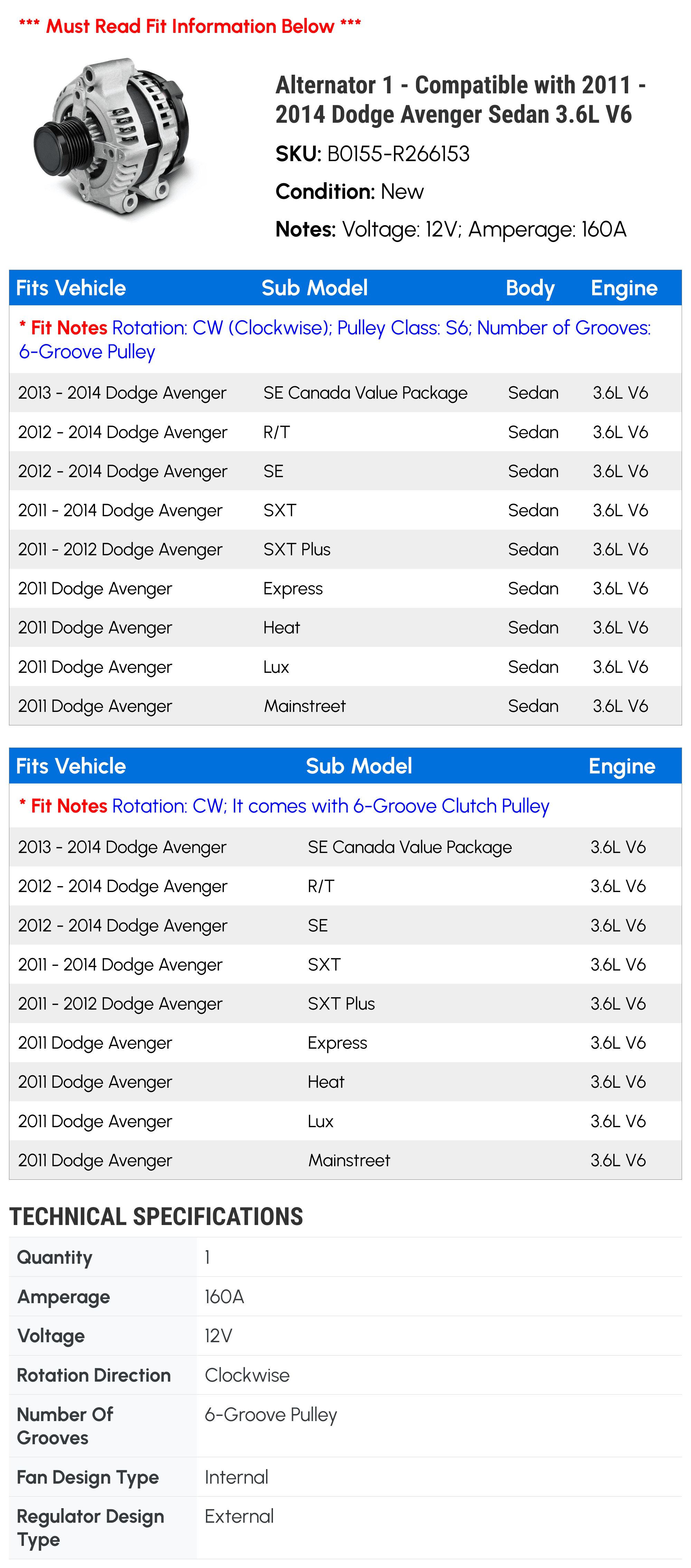 Alternator 1 – Compatible with 2011 – 2014 Dodge Avenger Sedan 3.6L V6