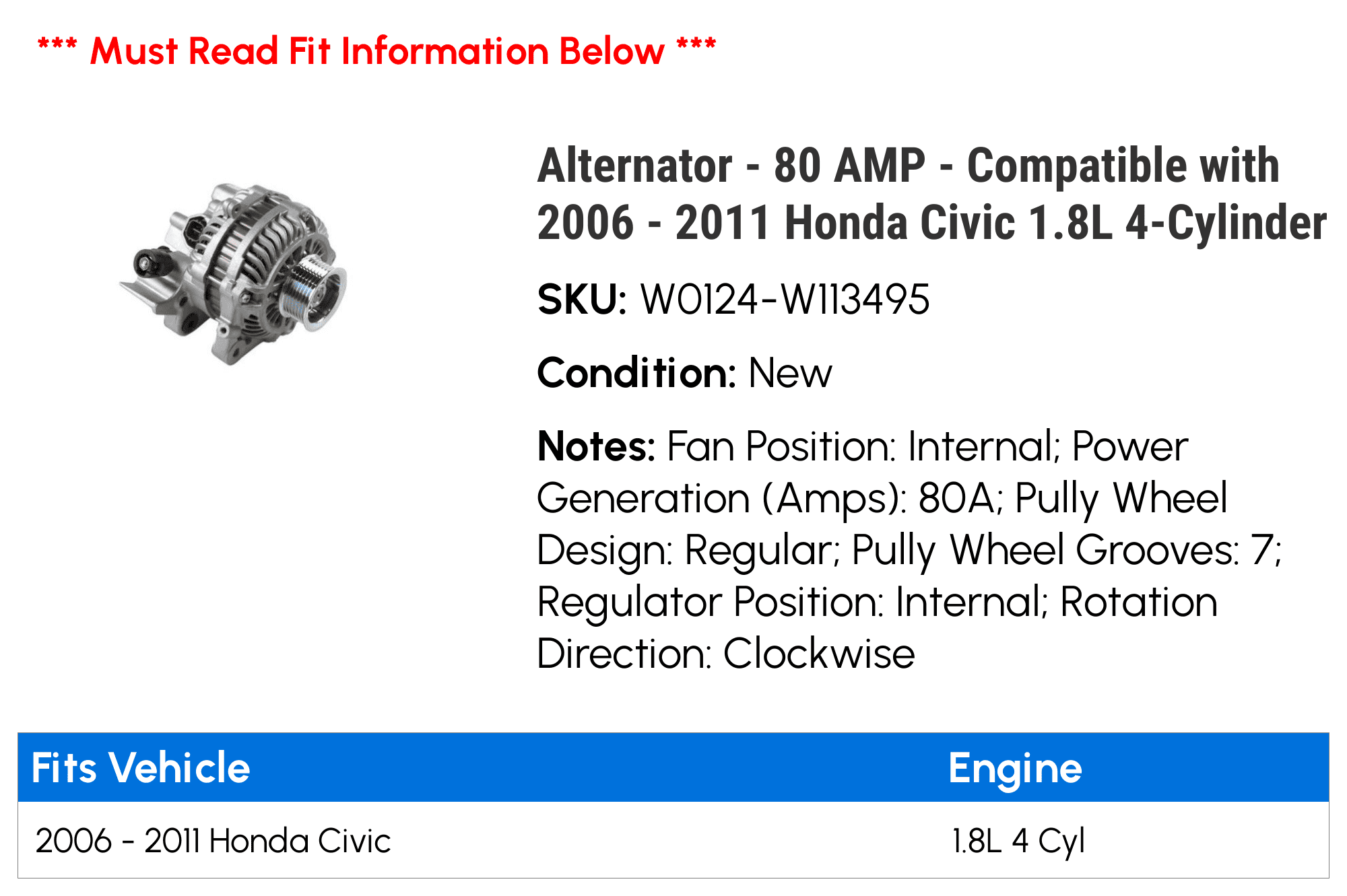 Alternator – 80 AMP – Compatible with 2006 – 2011 Honda Civic 1.8L 4-Cylinder