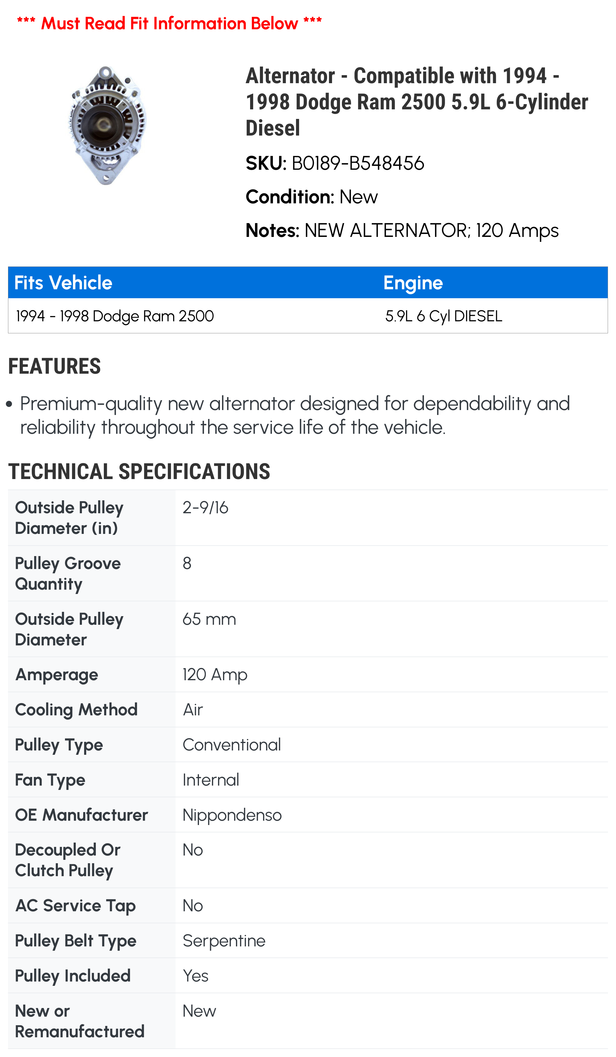 Alternator – Compatible with 1994 – 1998 Dodge Ram 2500 5.9L 6-Cylinder Diesel