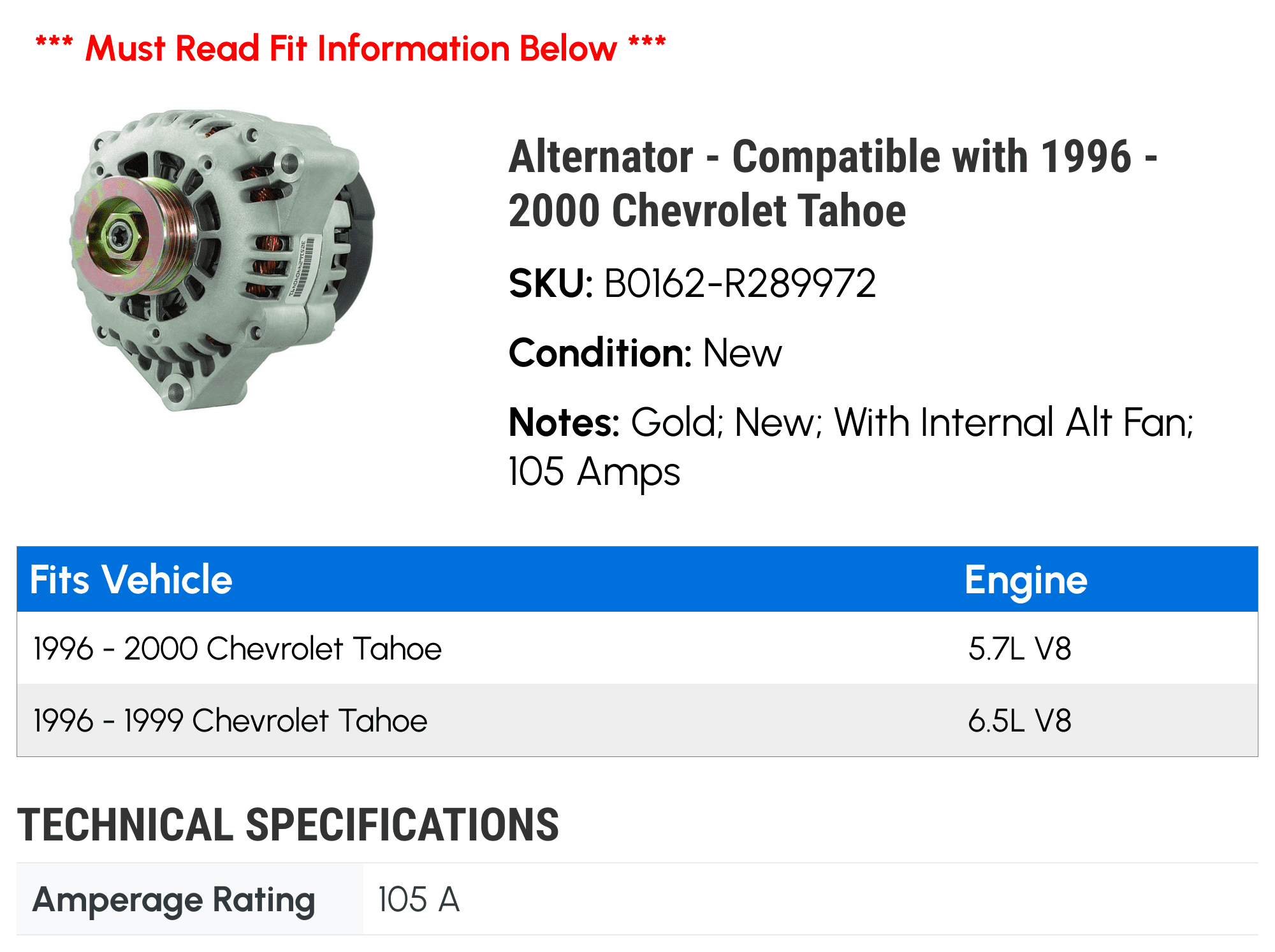 Note: Gold; New; With Internal Alt Fan; 105 Amps