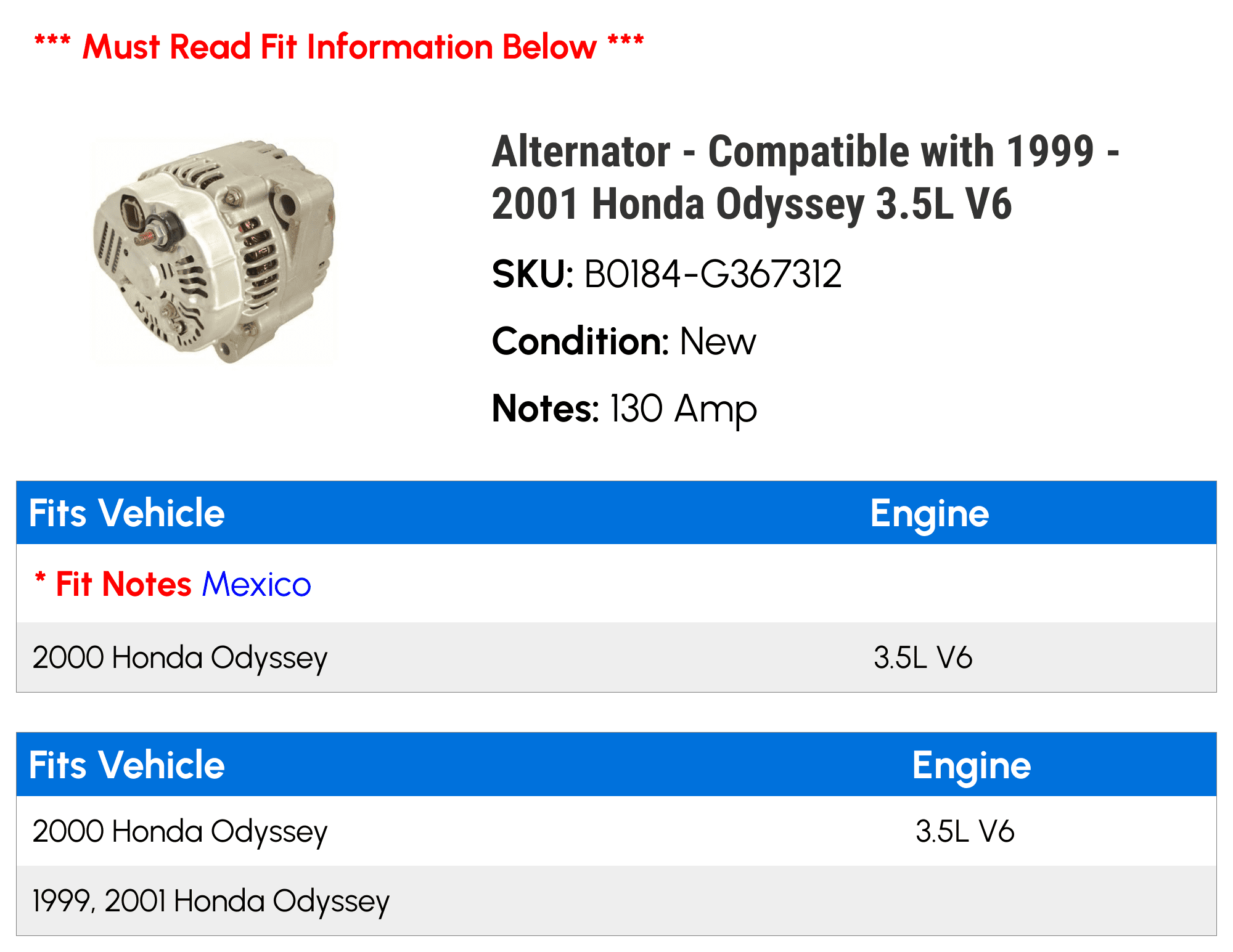 Alternator – Compatible with 1999 – 2001 Honda Odyssey 3.5L V6