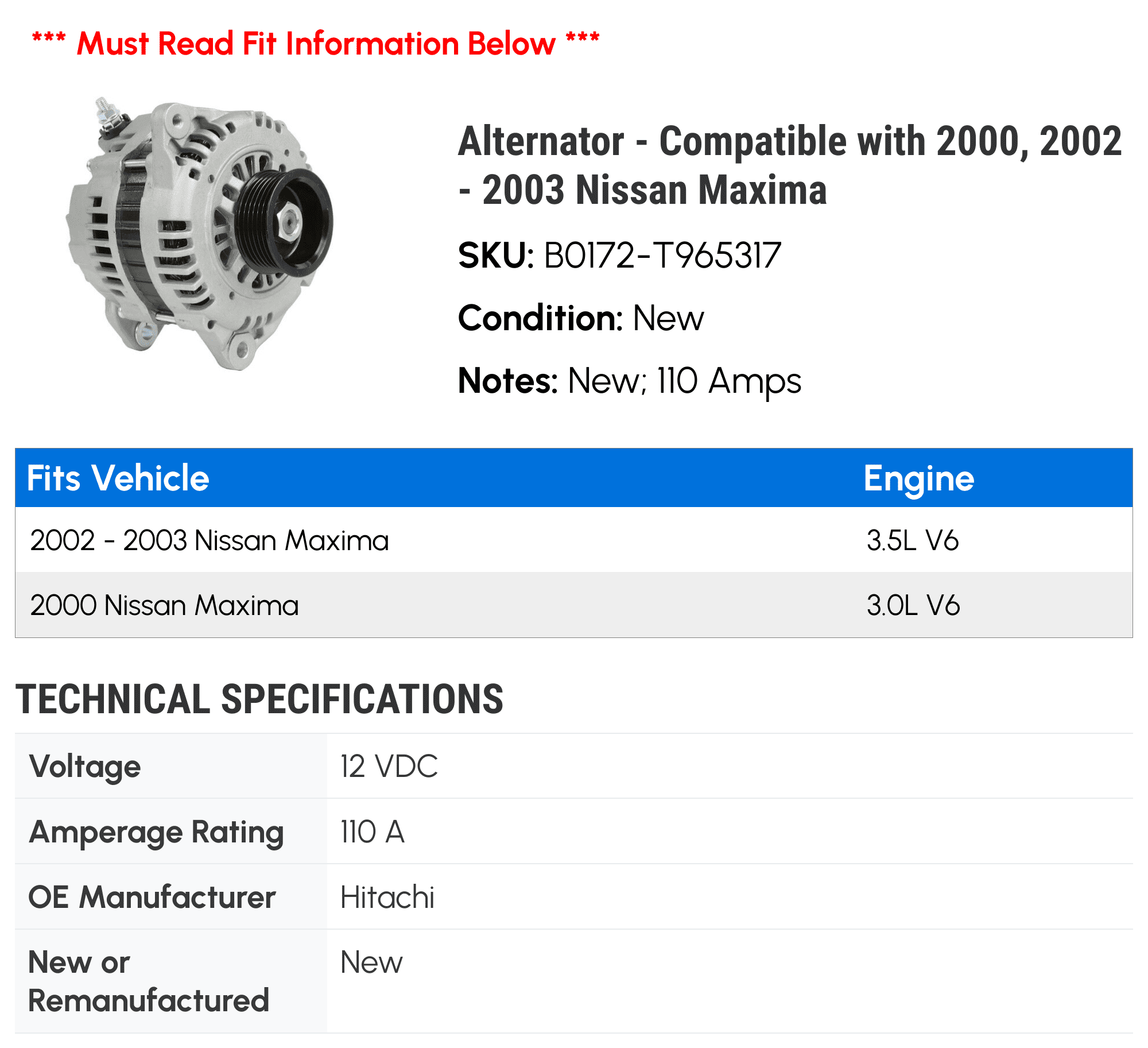 Alternator – Compatible with 2000, 2002 – 2003 Nissan Maxima