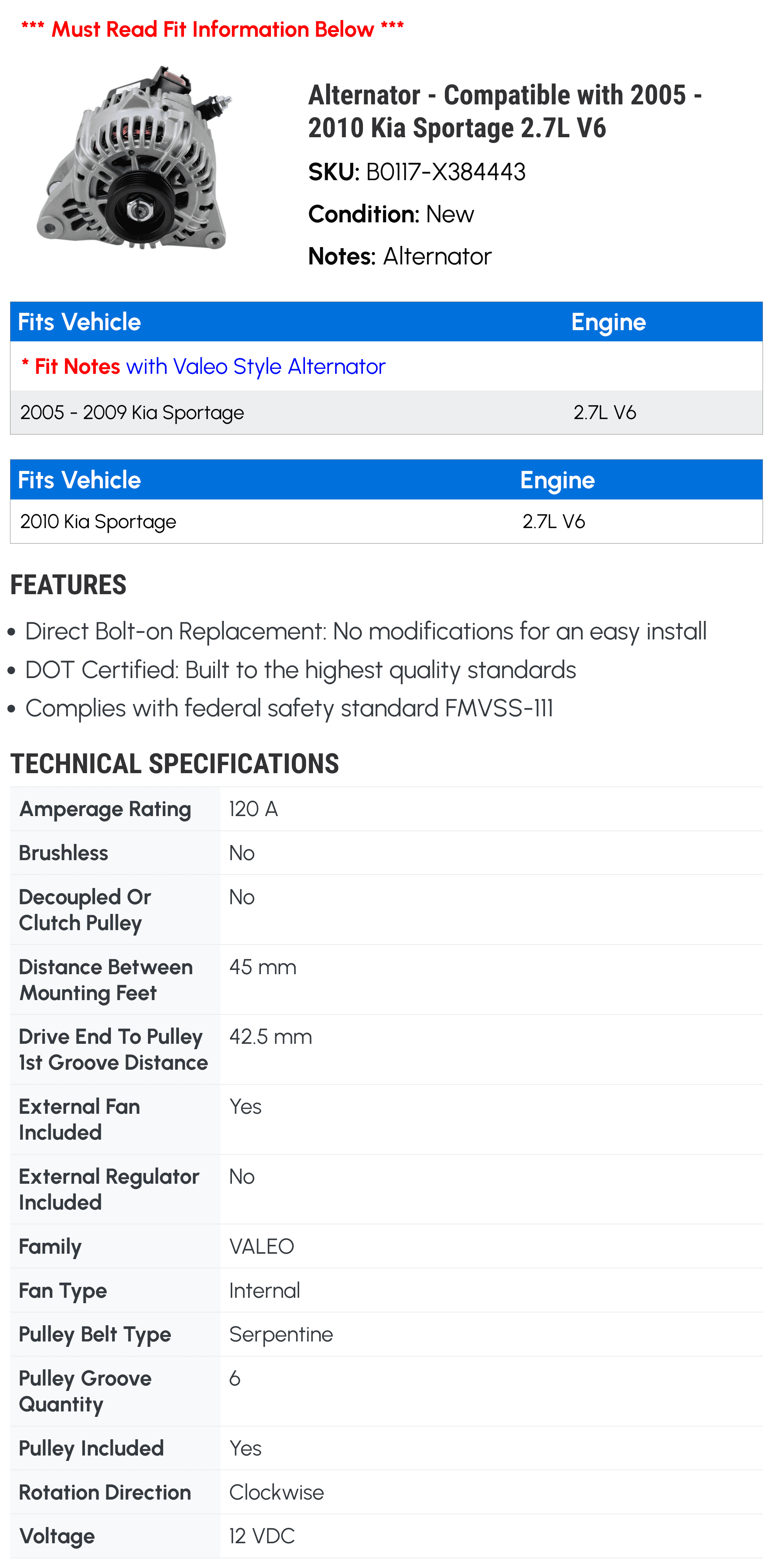 Alternator – Compatible with 2005 – 2010 Kia Sportage 2.7L V6