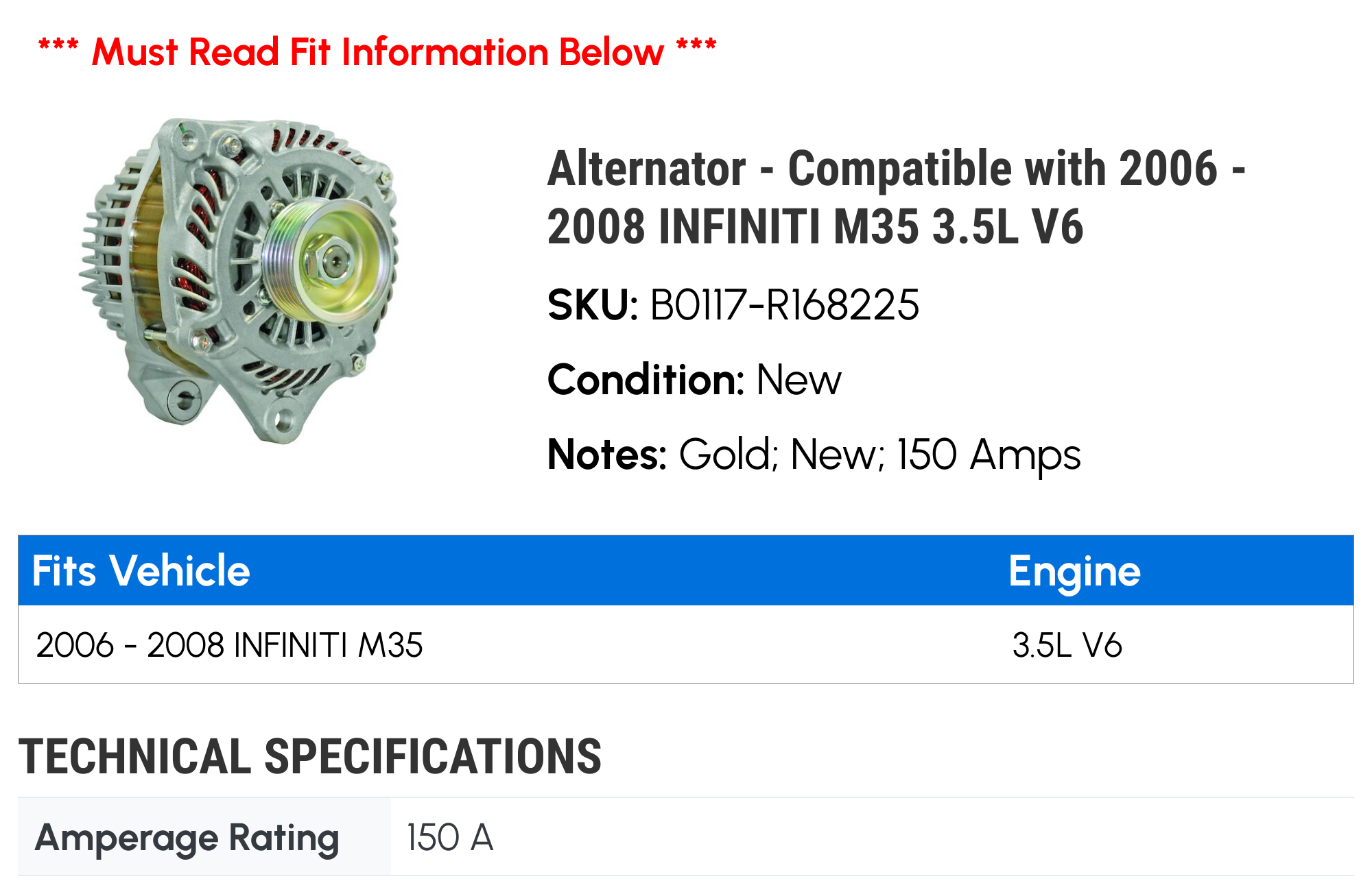Alternator – Compatible with 2006 – 2008 INFINITI M35 3.5L V6 2007