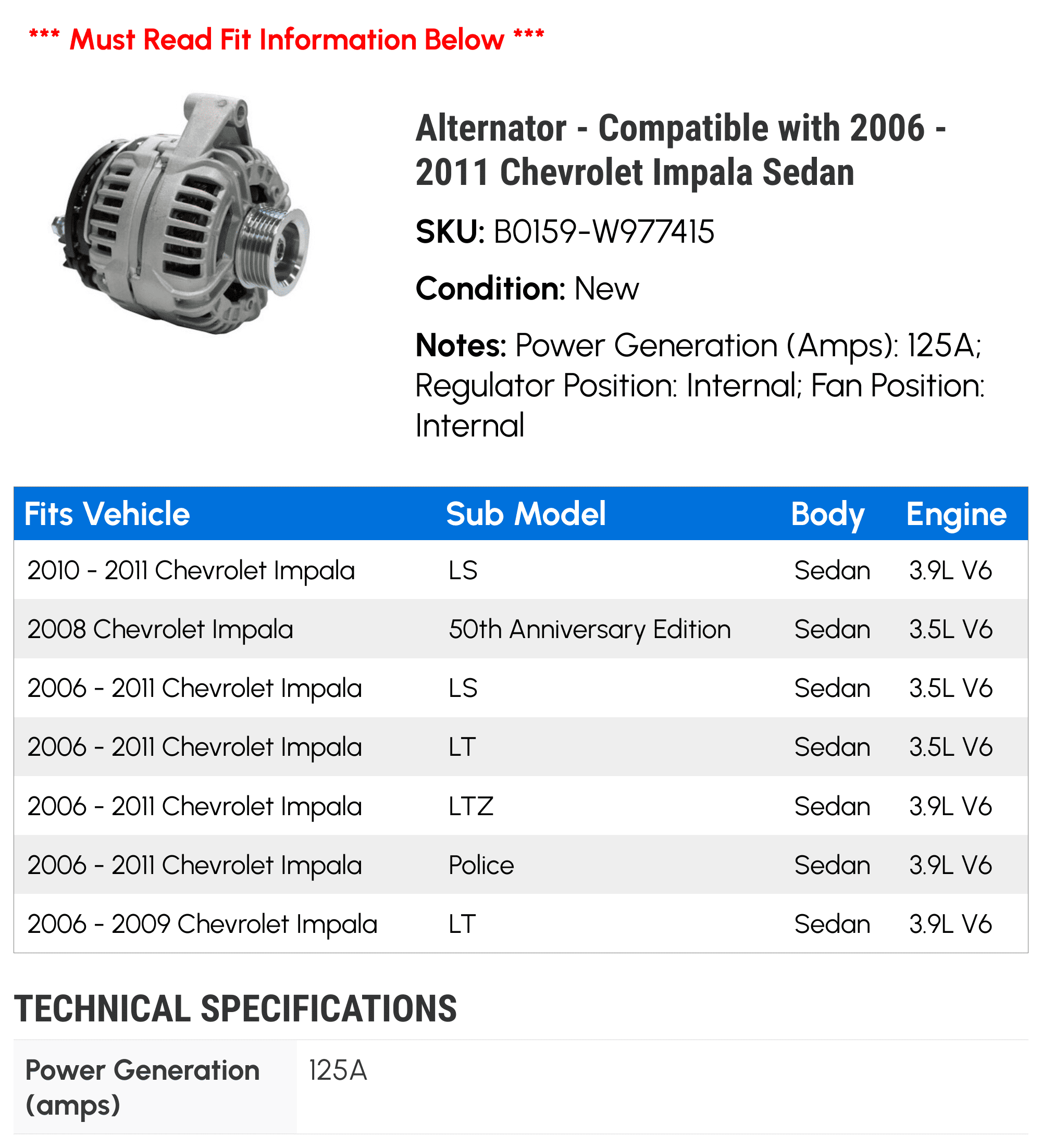 Alternator – Compatible with 2006 – 2011 Chevy Impala Sedan