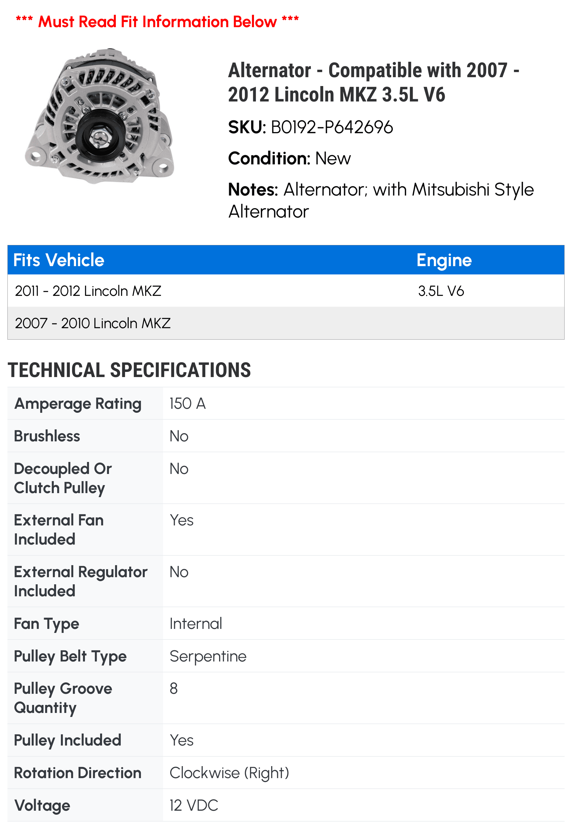 Alternator – Compatible with 2007 – 2012 Lincoln MKZ 3.5L V6