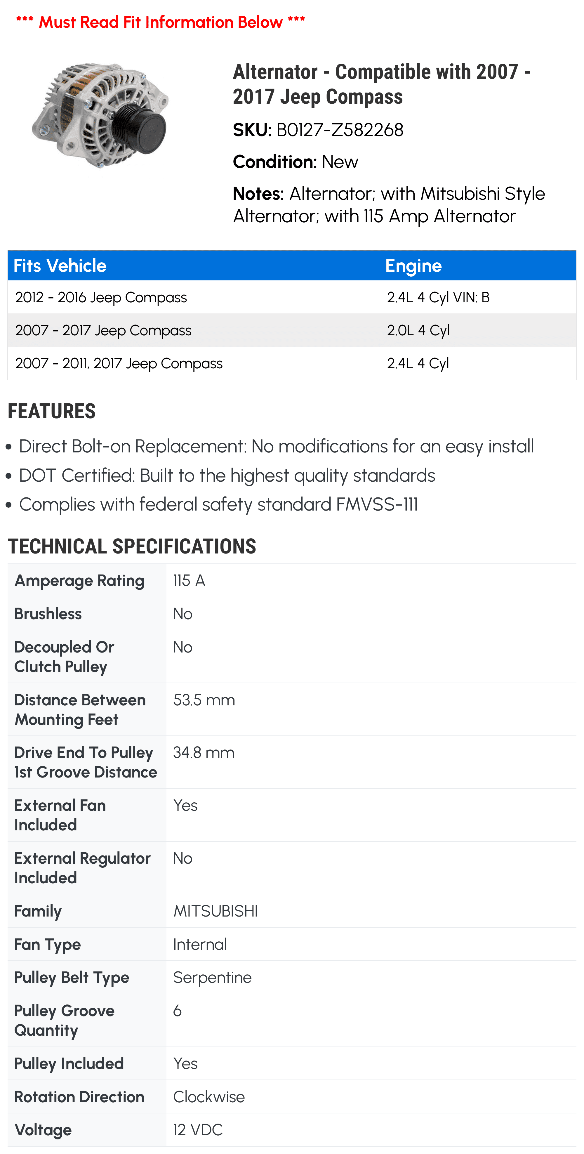 Alternator – Compatible with 2007 – 2017 Jeep Compass