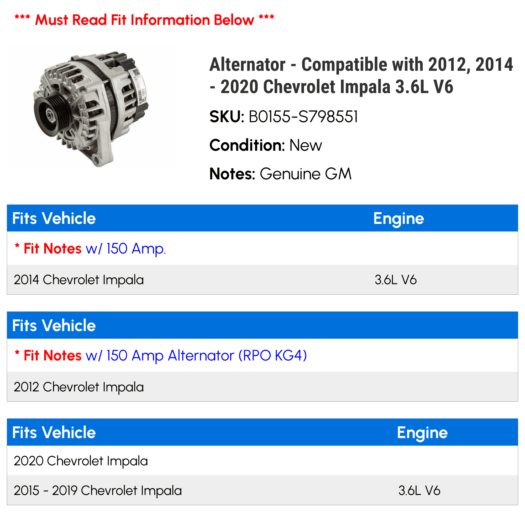 Alternator – Compatible with 2012, 2014 – 2020 Chevy Impala 3.6L V6