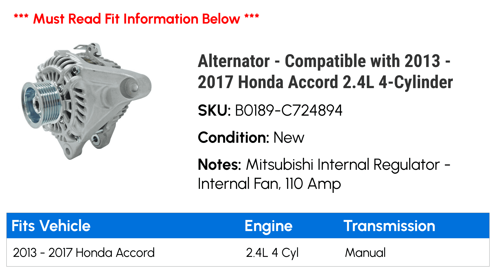 Alternator – Compatible with 2013 – 2017 Honda Accord 2.4L 4-Cylinder