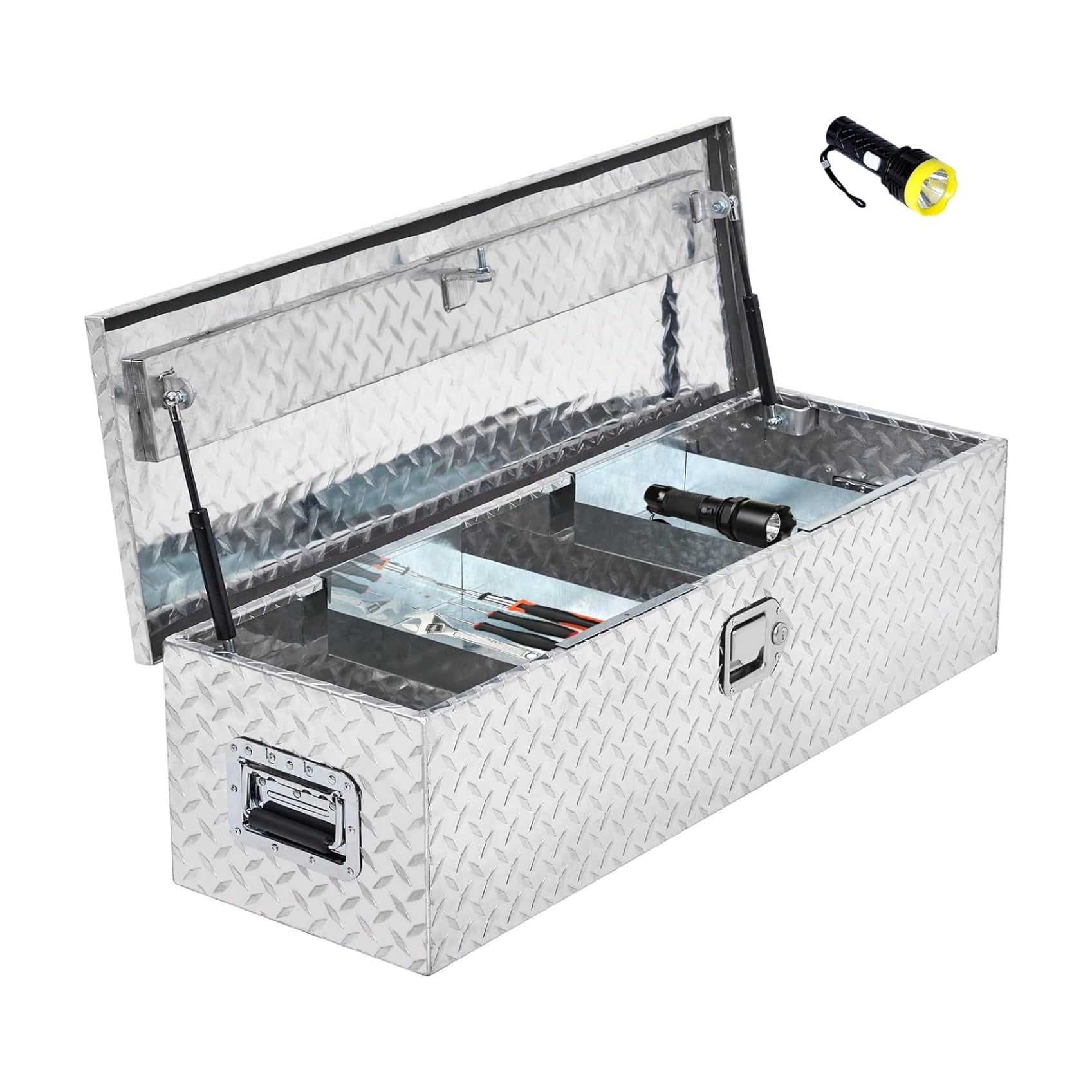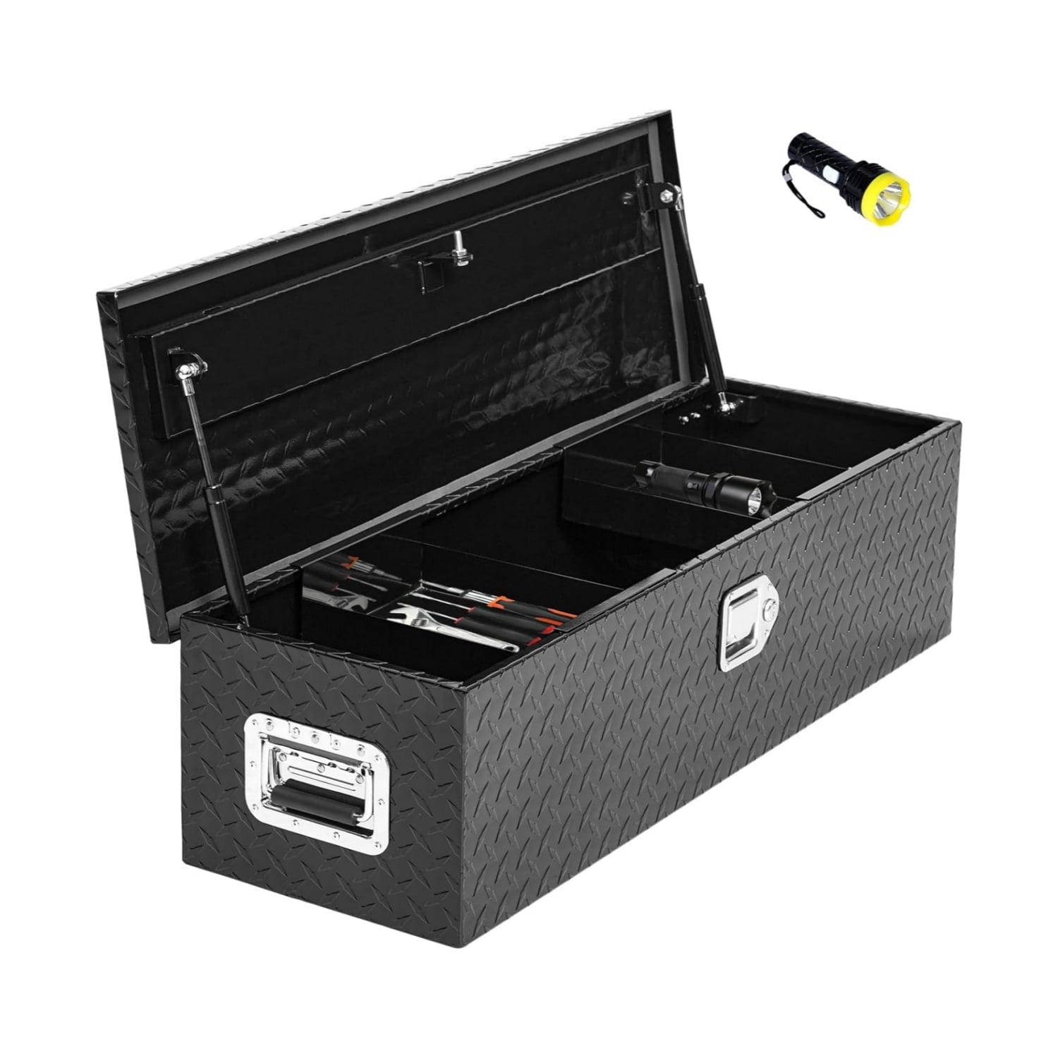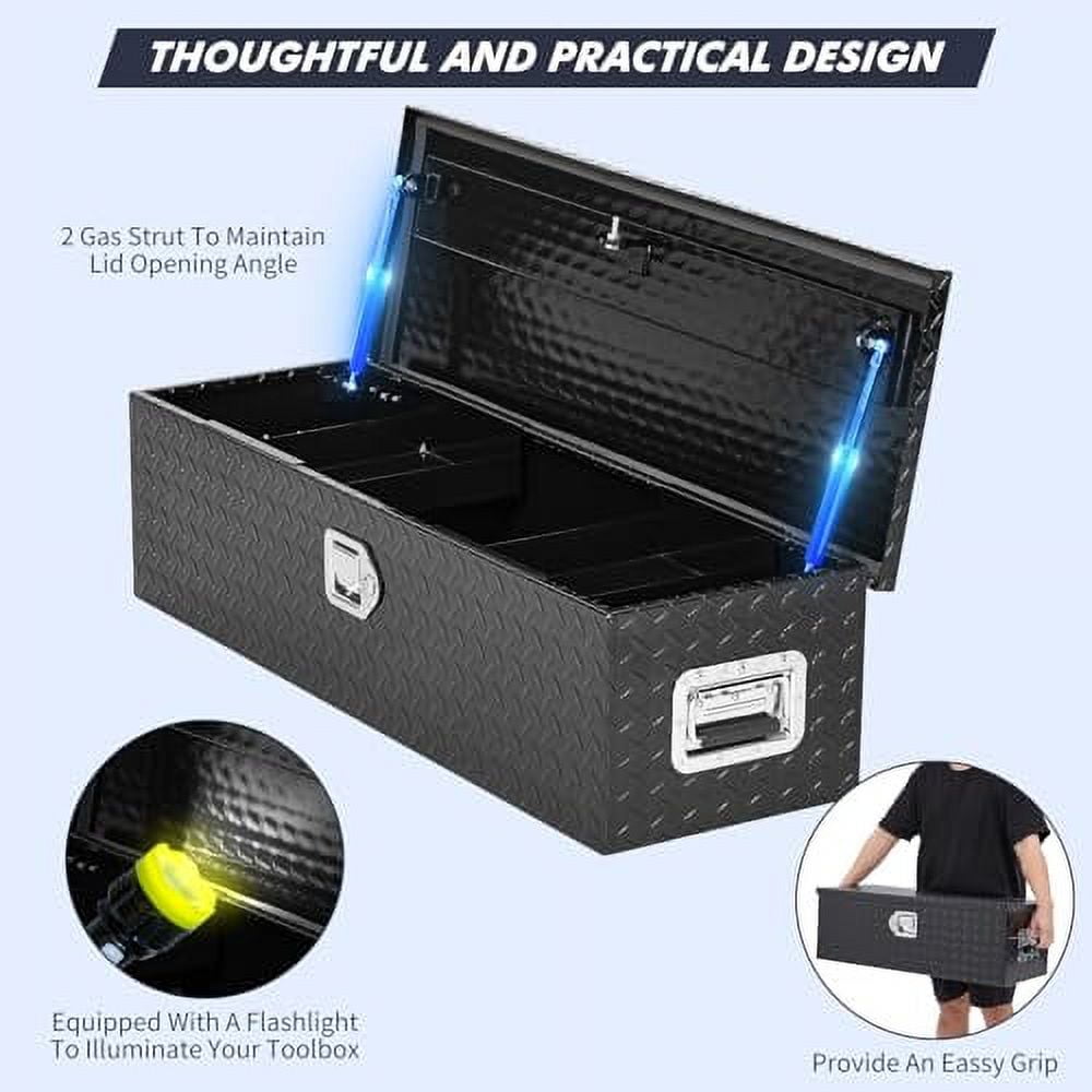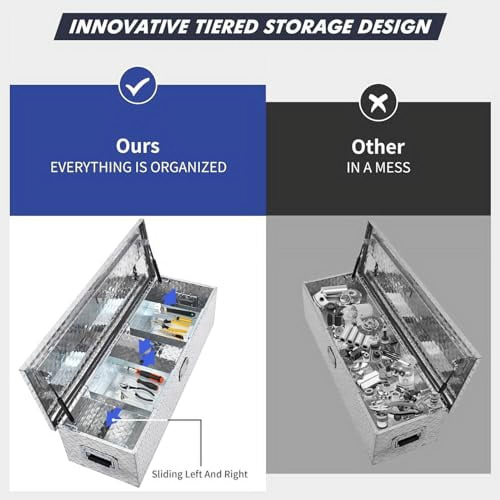 - PRACTICAL AND HUMANIZED DESIGN: The sliding shelf design of our Truck Bed Tool Box creates extra space for storing small tools, screws, and other items that are easy to find and improve work efficiency. Plus, we give you a free flashlight so you can find what you’re looking for even in dim light.