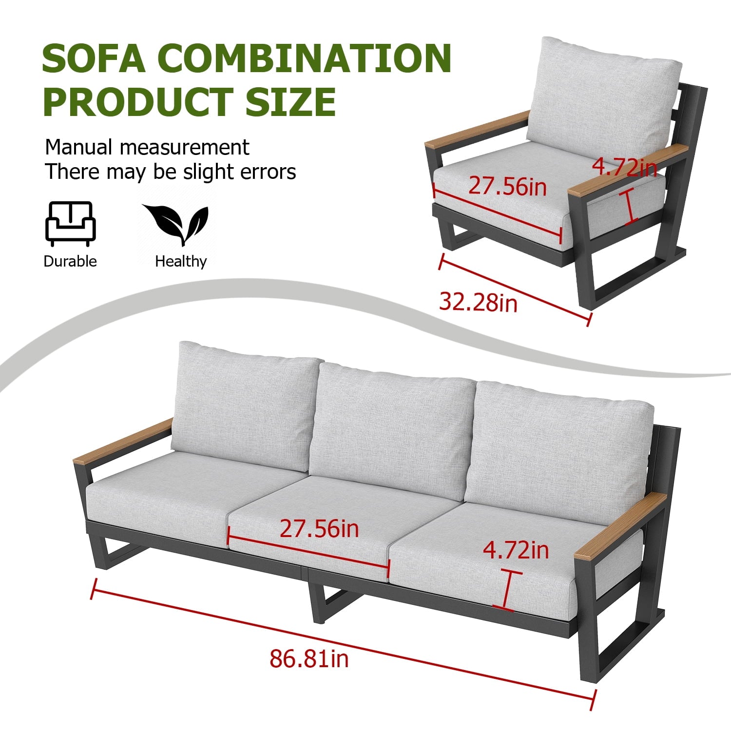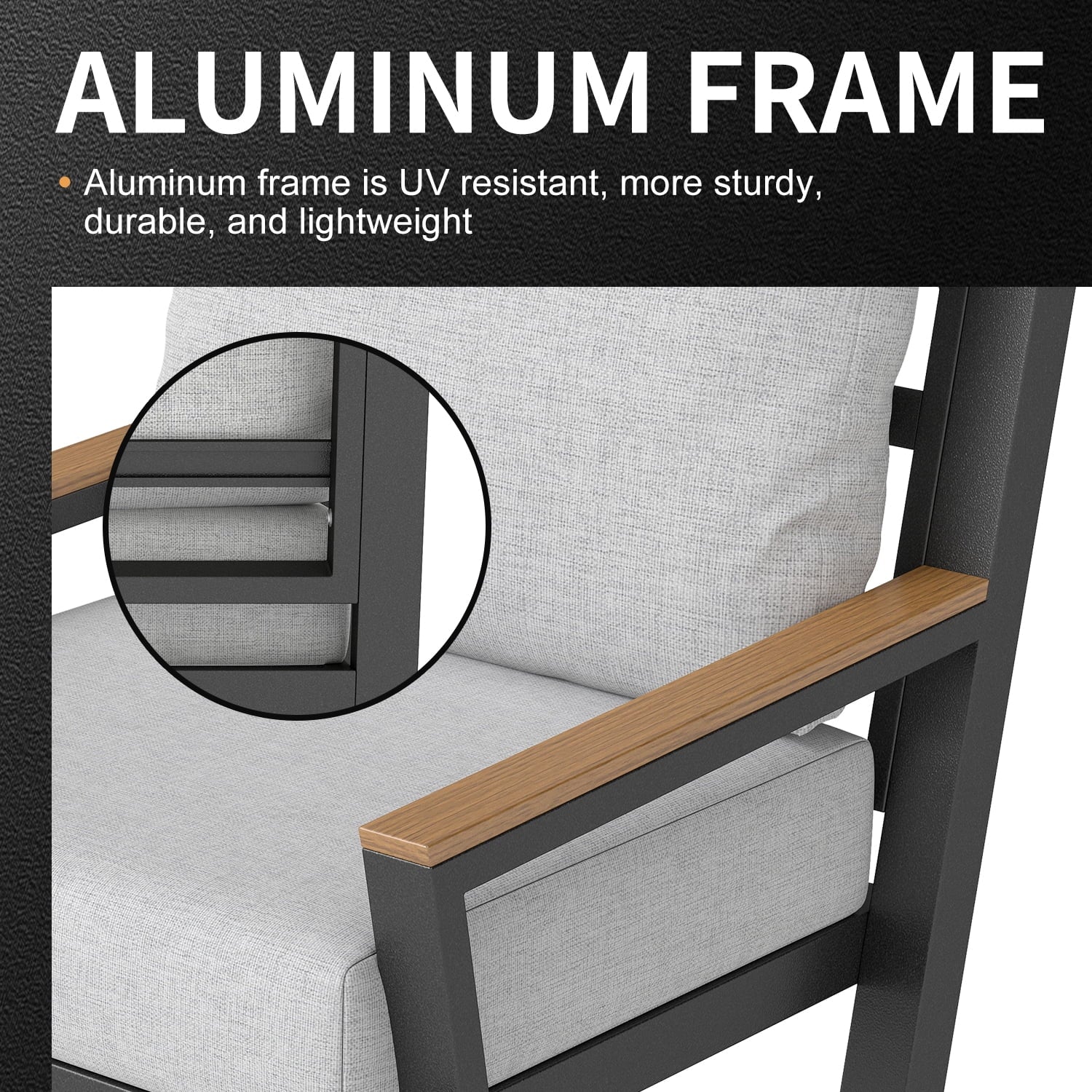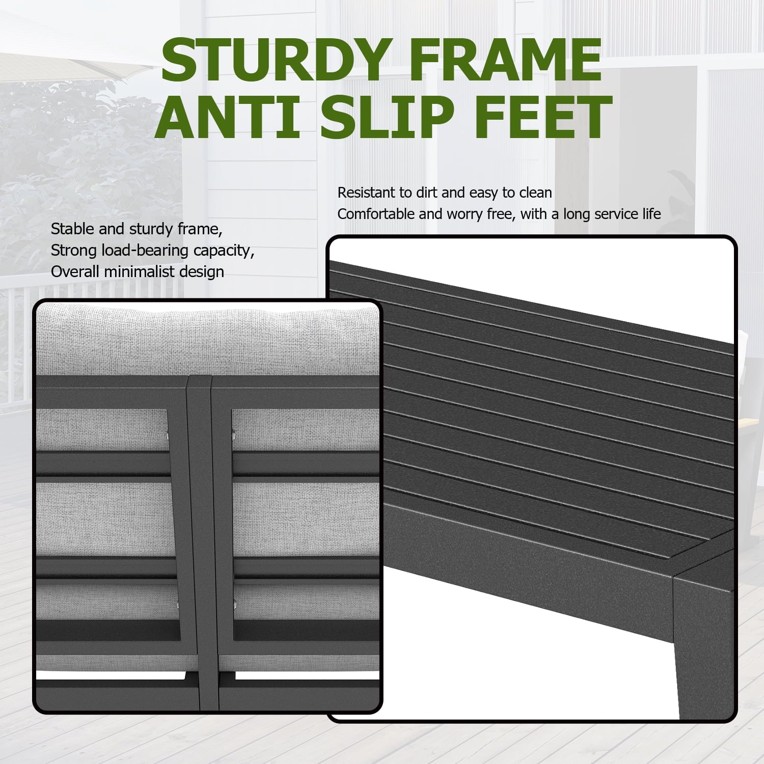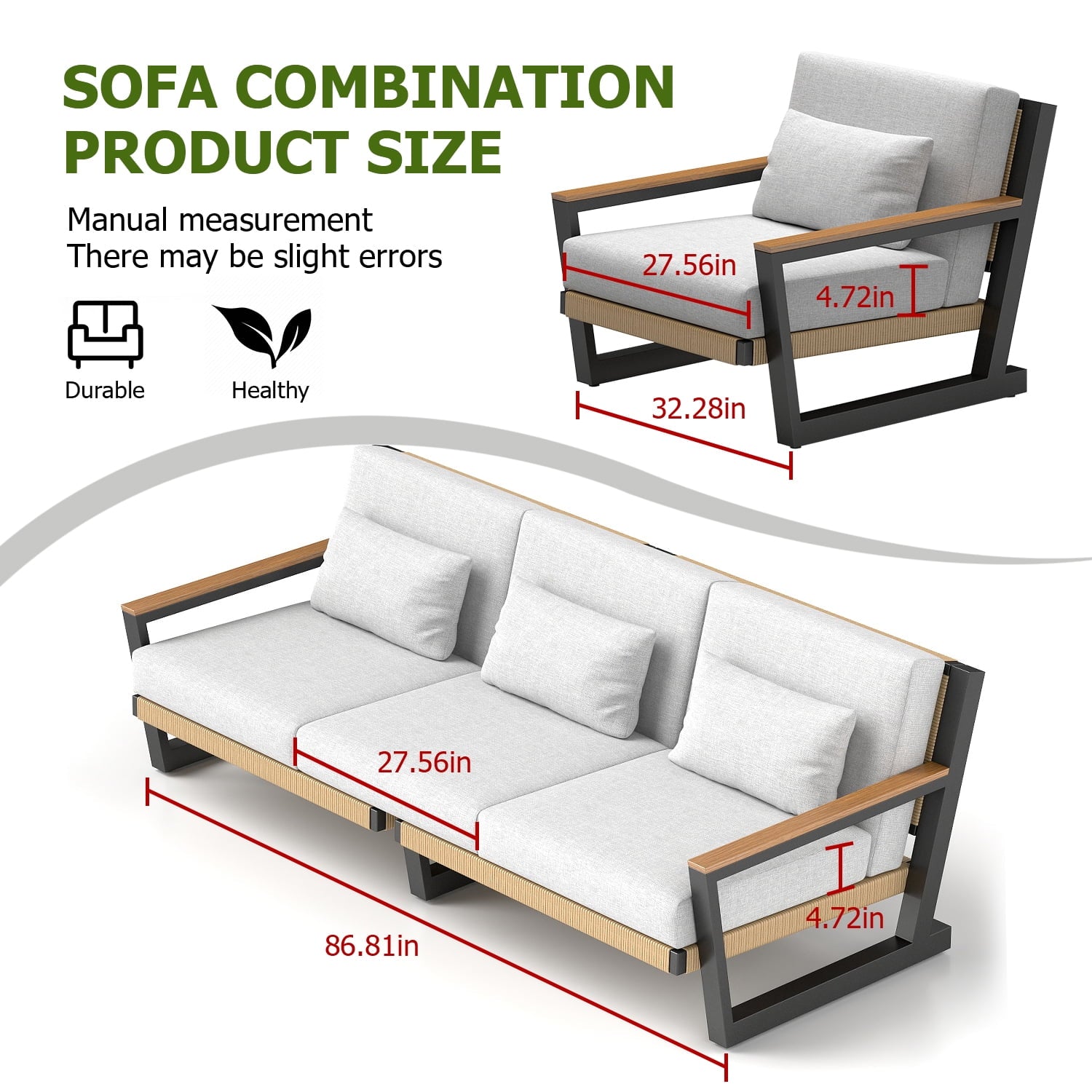 - Crafted with a lightweight yet sturdy aluminum frame that resists rust, corrosion, and fading—ensuring long-term durability with minimal maintenance. Features an extra-wide seat design to enhance overall sitting comfort. Reinforced seat base adds extra stability to the sofa structure. Cushions are wrapped in upgraded olefin fabric that’s soft to the touch, breathable, and highly resistant to fading. Removable cushion covers with hidden zippers allow for easy cleaning and upkeep. The tabletop is made of durable aluminum with a wood-like finish, combining modern style with long-lasting performance.