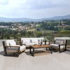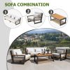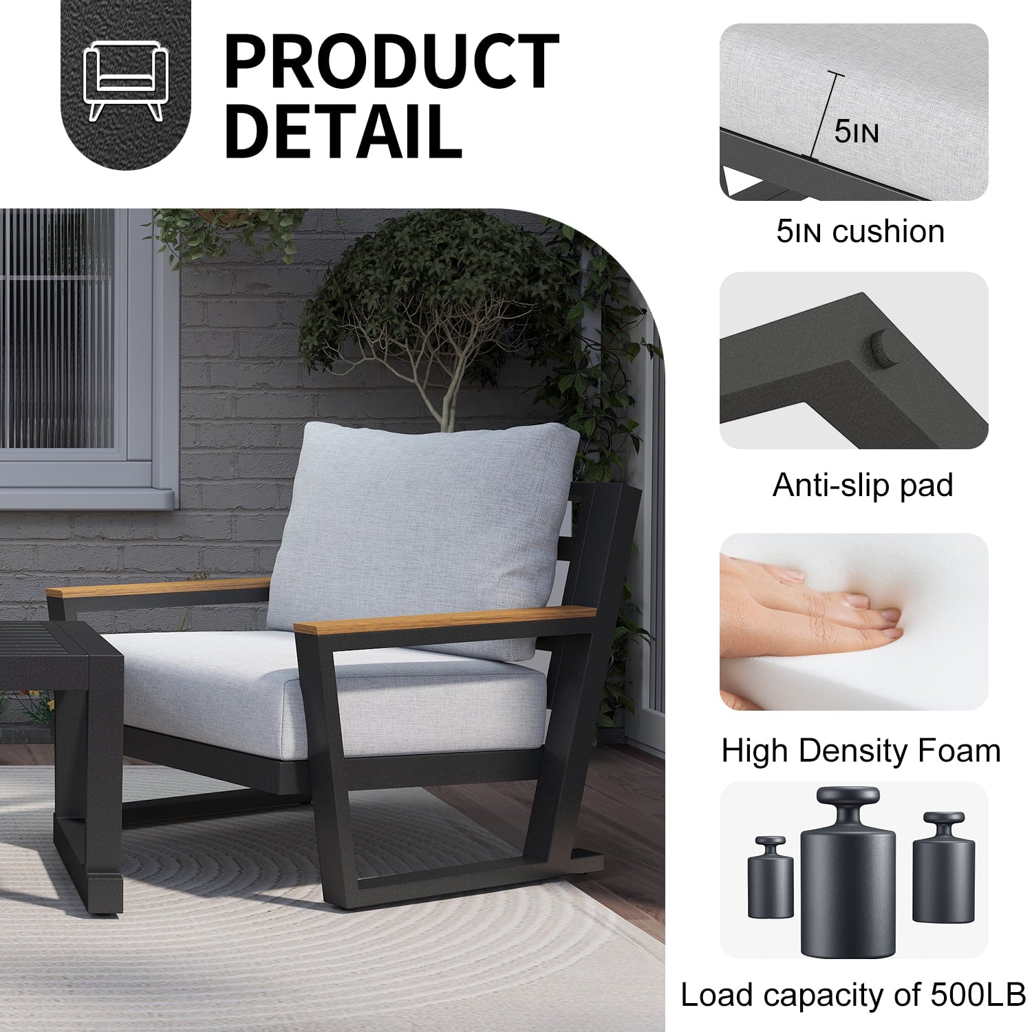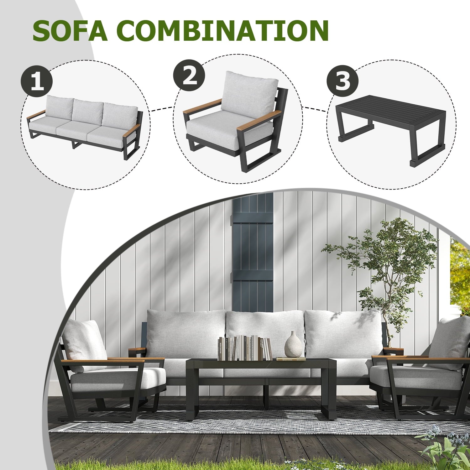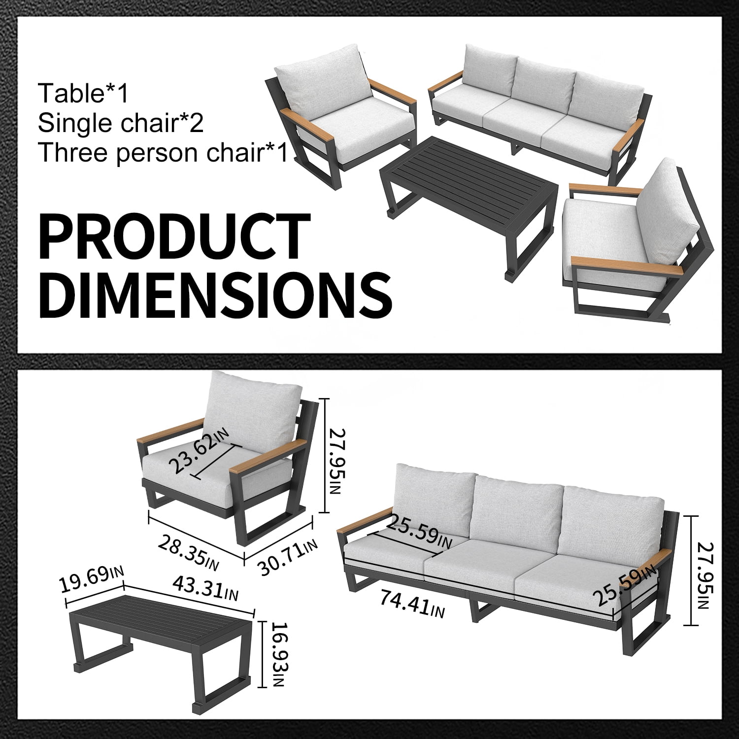 - Crafted with a lightweight yet sturdy aluminum frame that resists rust, corrosion, and fading—ensuring long-term durability with minimal maintenance. Features an extra-wide seat design to enhance overall sitting comfort. Reinforced seat base adds extra stability to the sofa structure. Cushions are wrapped in upgraded olefin fabric that’s soft to the touch, breathable, and highly resistant to fading. Removable cushion covers with hidden zippers allow for easy cleaning and upkeep. The tabletop is made of durable aluminum with a wood-like finish, combining modern style with long-lasting performance.
