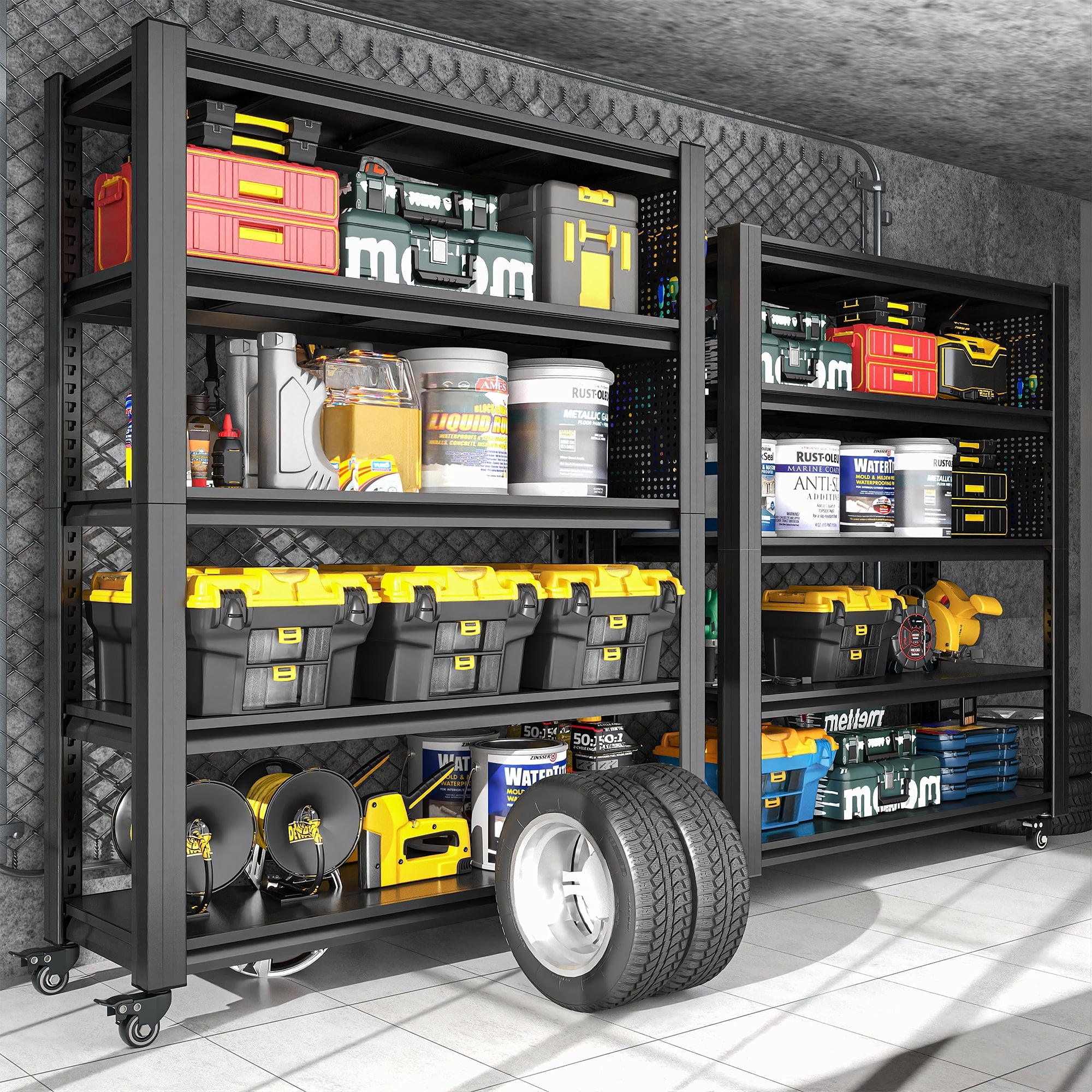 - ✅ [2400LBS Heavy-Duty Storage Capacity] Constructed from thickened black steel with reinforced crossbars and double-leg support, each shelf holds up to 400 lbs, making it ideal for tools, tires, boxes, appliances, and more.