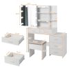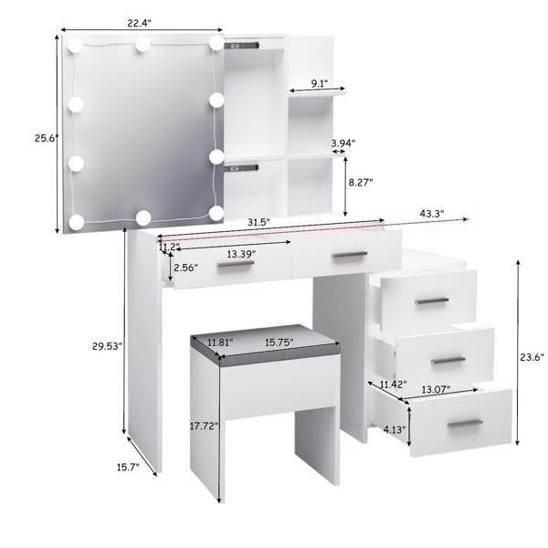 Discover the Alvantor Vanity Desk, a perfect blend of elegance and functionality for your beauty routine. Made with premium particleboard and triamine veneer, this vanity includes a 3-color dimming LED mirror, ideal for natural-looking makeup in any light. With 5 drawers and 2 open shelves, it offers generous storage, while built-in USB and power outlets add convenience. The set comes with a matching stool and is designed for easy assembly. Its modern white finish fits seamlessly into any bedroom or dressing space. Dimensions: 43.3″x15.7″x55.1″.