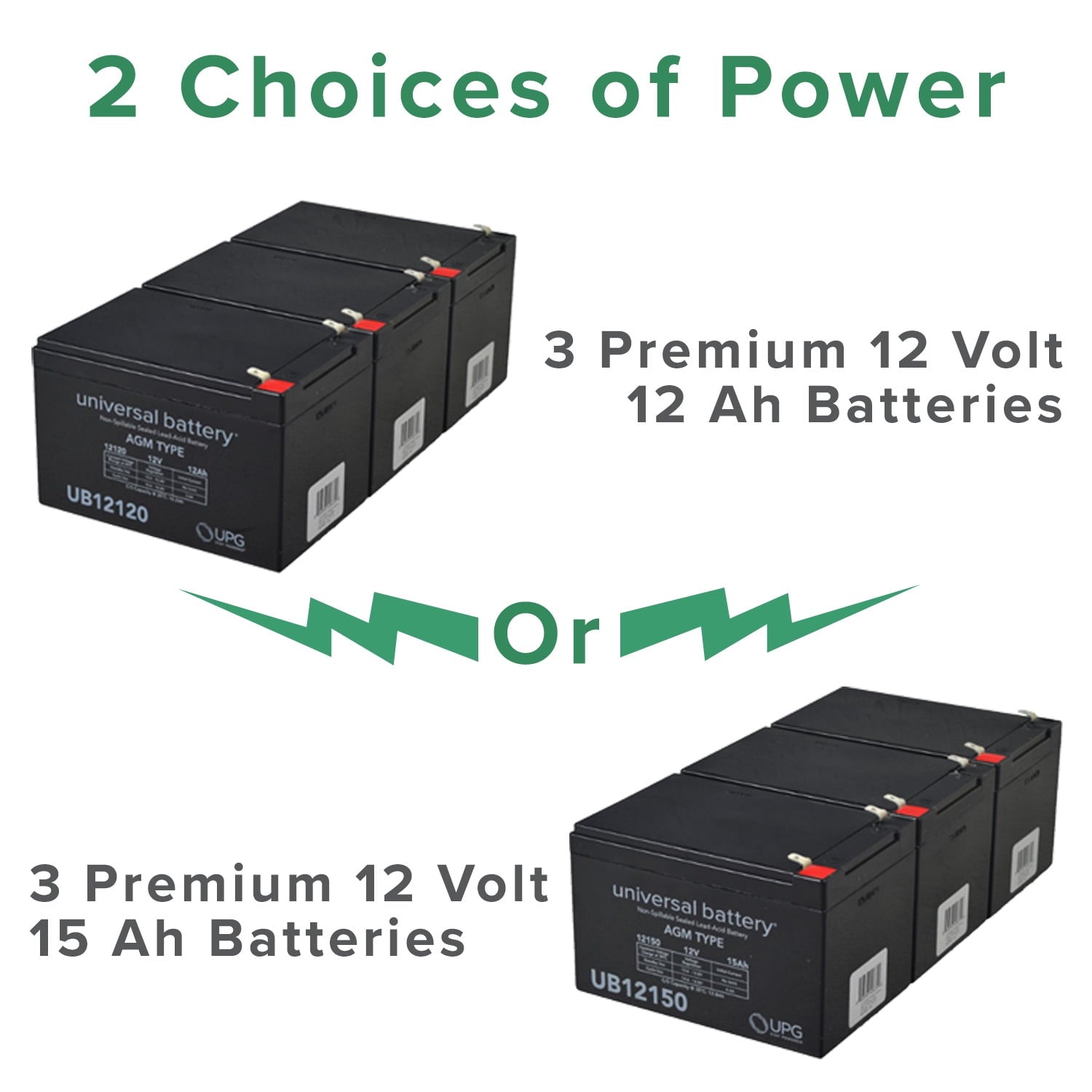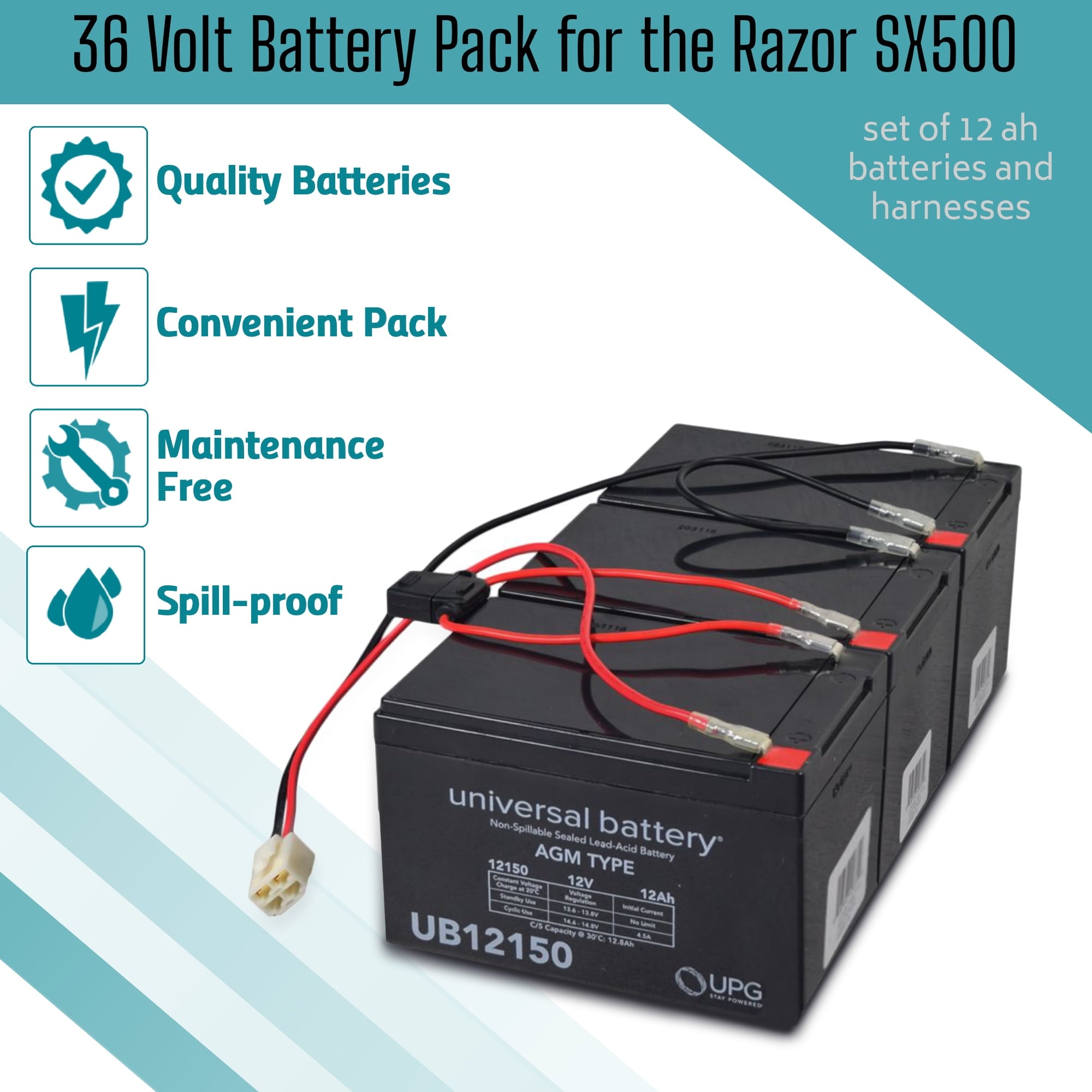 - INCLUDED – With our AlveyTech 36V 12 Ah Battery Pack, you’ll get three, premium UPG 12 Volt 12 Ah batteries fully charged!