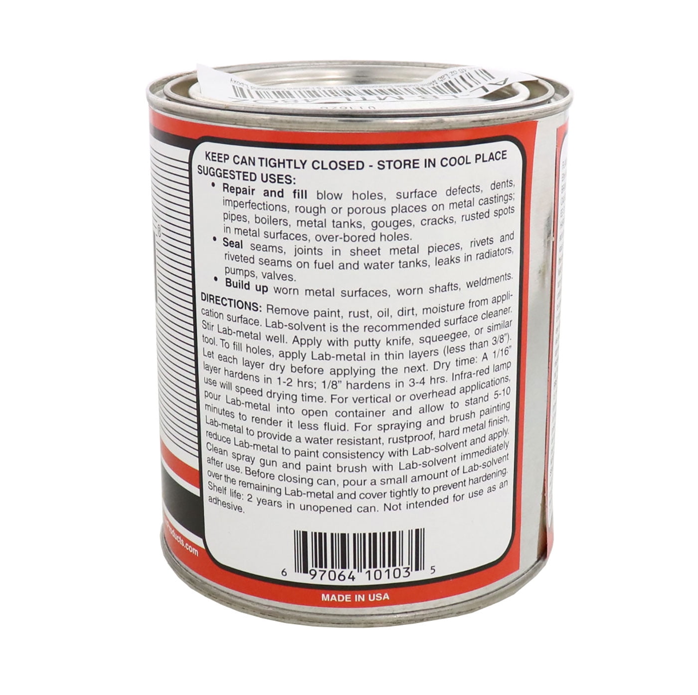Alvin 48 oz Lab Metal Durable Economical Dent Filler & Patching Compound Epoxy 48 oz Alvin Lab-metal is a ready to use compound designed to fill dents and flaws in metal and nonmetal parts easily and economically. With the use of Lab-solvent, Lab-metal can be thinned for use on any surface to provide a rustproof, water resistant, hard metal finish. Used to smooth over rough welds and is easily sanded and designed to be a durable metal filler for fast and permanent repairs.Spreads like paste and hardens quickly into metal. Lab-metal is guaranteed for one year in the factory-sealed can.Lab-metal is Easy to Use, Thin to Brush or Spray, Bonds Permanently, Durable & Efficient & Economical.Shelf Life:Lab-metal is guaranteed for one year in the factory-sealed can. Add Labsolvent (as instructed) to extend storage time. Once reopened, the contents should be thoroughly stirred. Store in a cool place. Alvin Products recommends testing the product for each application.WARNING! This product can expose you to chemicals including toluene, which is known to the state of California to cause cancer and birth defects or other reproductive harm. Wash hands after handling.