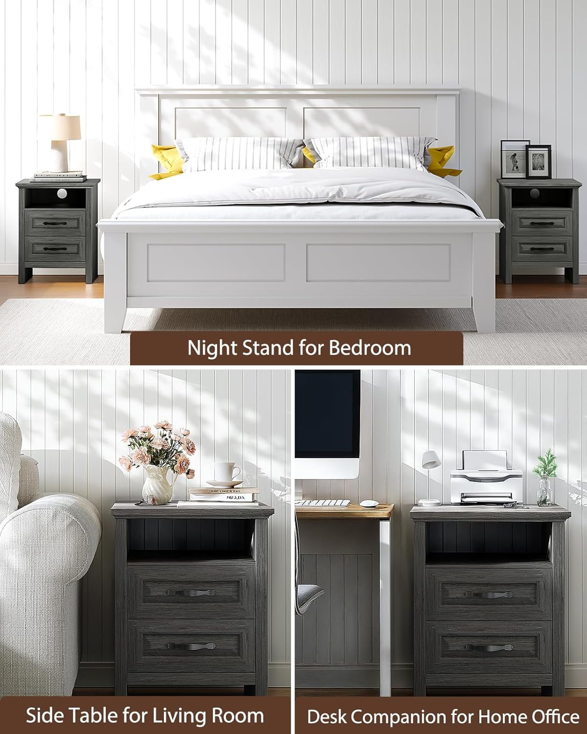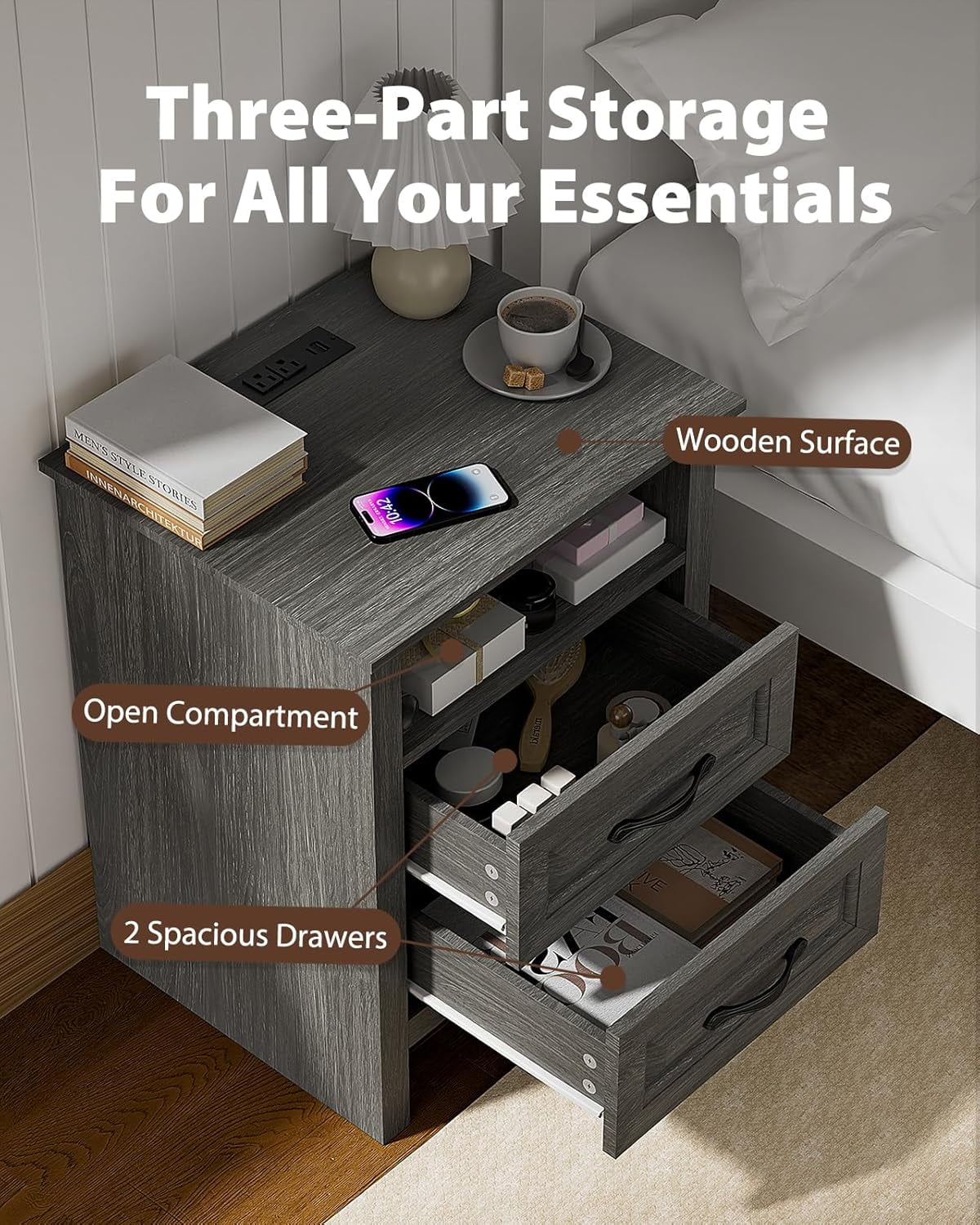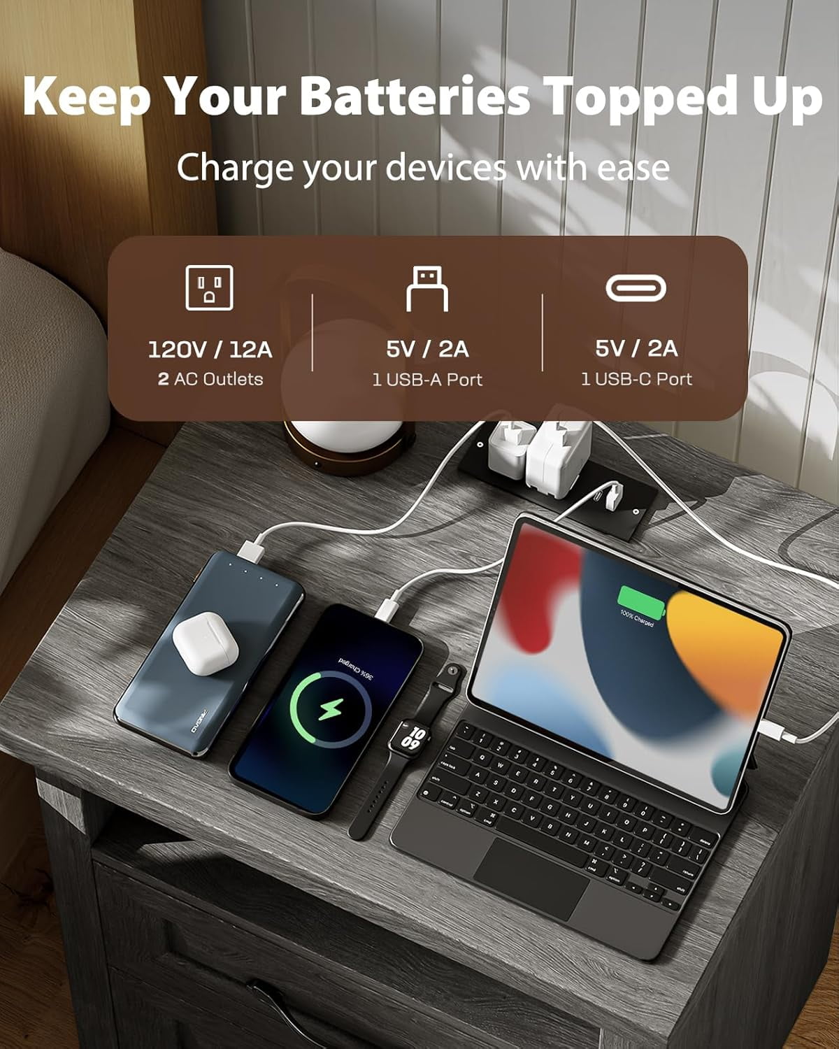 Charging Station Built In & Out of Sight: This nightstand with charging station features two AC outlets, one USB port, and one Type-C port, allowing you to power multiple devices easily. The built-in power panel is neatly hidden to keep cords organized and out of view—perfect for maintaining a clean, modern bedside table or living room end table setup.