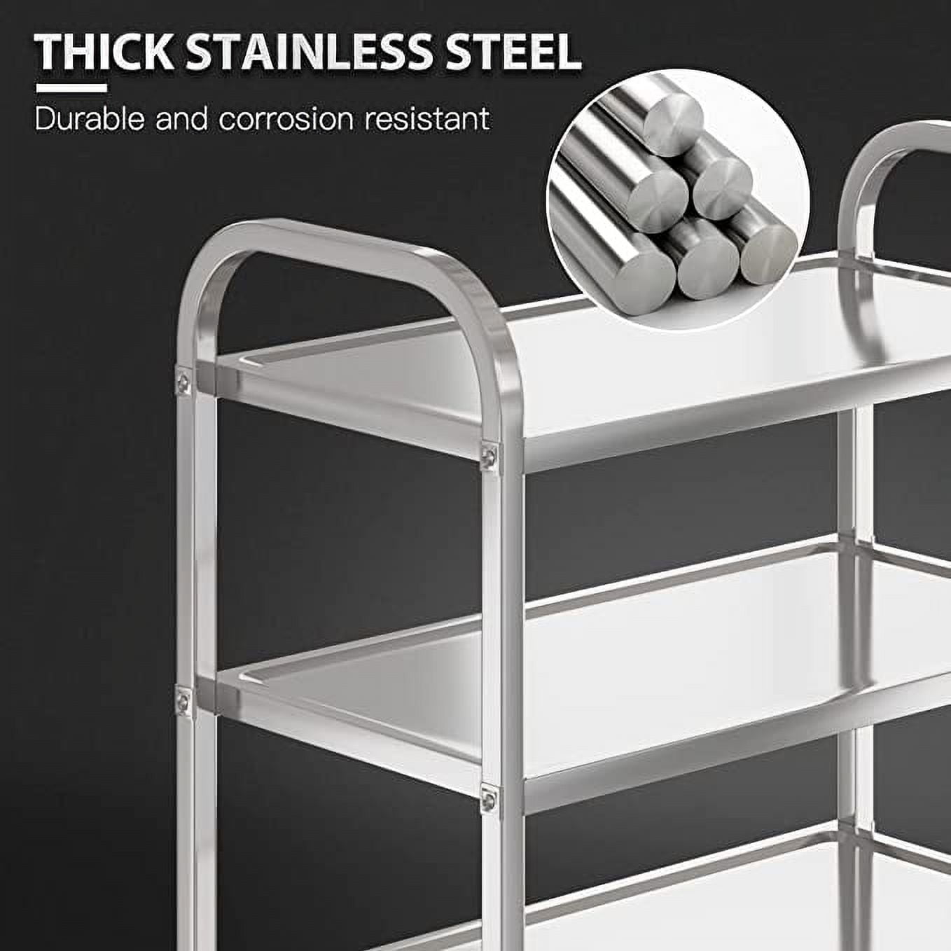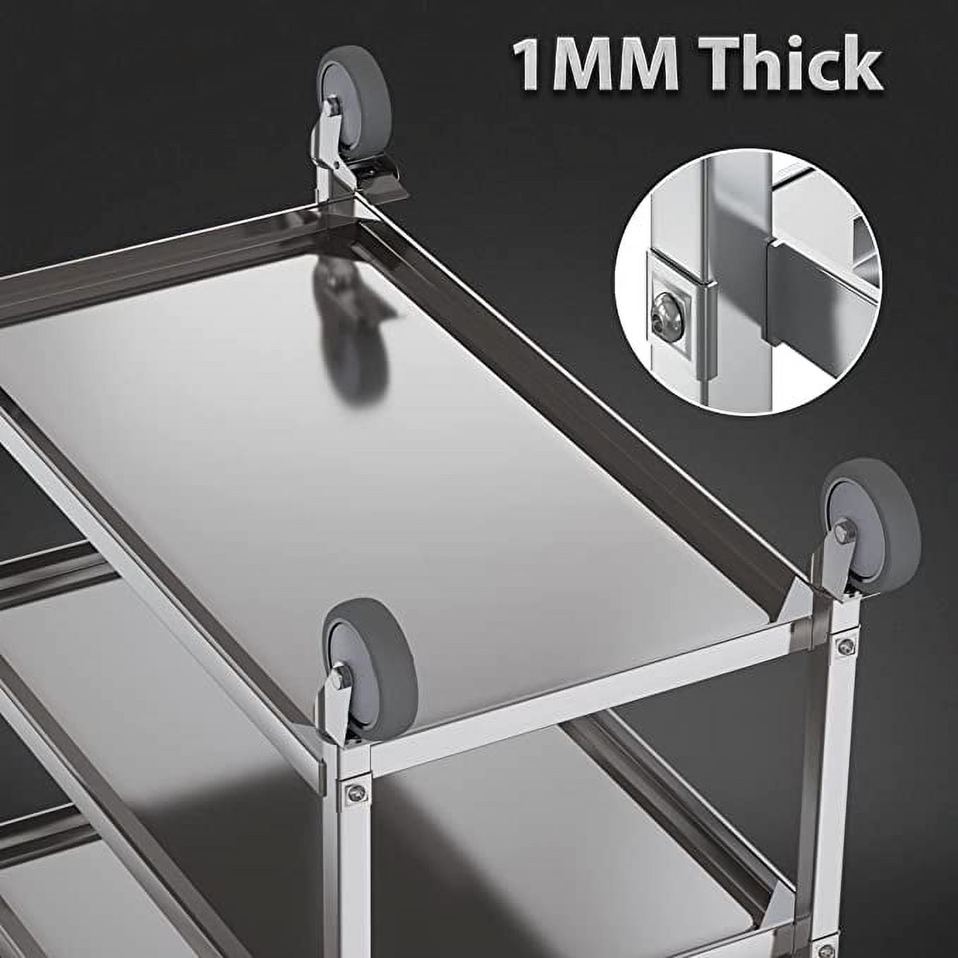 • High-quality thick stainless steel cart: load-bearing: 340LBS, made of thick stainless steel, high-strength steel buckle connection between layers and rods, load-bearing is not deformed, 1MM thick, high-quality thick stainless steel cart.