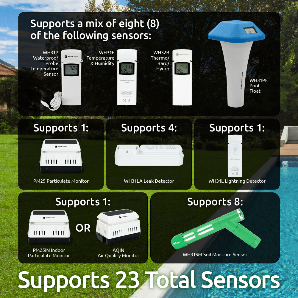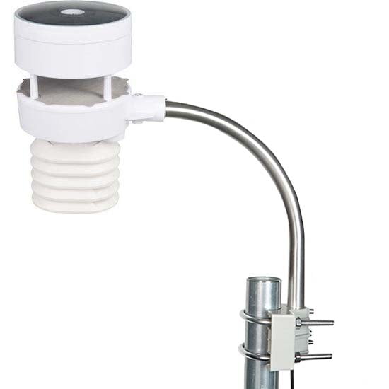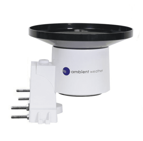 The Ambient Weather WS-5000 Ultrasonic Professional Smart Weather Station is the most sophisticated home and light industrial weather station we have ever created. Our smart wind meter has no moving parts to wear out, and includes a revolutionary sonic anemometer that responds quicker to wind, and transmits faster than traditional wind cup designs. The attractively thin desktop display is also wall mountable. The brilliant, dynamic LCD display is easy to read, day or night, features a light or dark-colored background, and automatically controls brightness settings based on time of day. Measured parameters combined with calculated data: ‘Feels Like’ Temperature (Wind Chill and Heat Index), Dew Point, Gust (the maximum wind speed sampled once per second in the 16 second update period), 10 Minute Wind Speed and Direction Average, Sunrise, Sunset, Moon Phase, Forecast, and more. The WS-5000 also displays minimum and maximum conditions with time and date stamps, historical archived data, which can be exported to SD Card (optional, not included) for advanced data analysis in Excel. The SD Card is also used for firmware updates. The extra-large rain cup ensures better accuracy. Since the sensor is wireless, it can be placed close to the ground, and the removable lid makes for easy service and maintenance. The wireless sensor array features a pagoda thermo-hygrometer radiation shield with passive aspiration for the utmost accuracy, a bubble level for plumb installation, and a solar panel. It connects to the console via RF (915 MHz) up to 1000 feet line of sight in the open air (300 feet under most conditions). The wireless signal will not pass through solid metal, earth, or ground. The sensor array mounts to any pole between 1 and 2″ diameter with an adaptive mounting bracket and U-Bolt design that can be tightened to your mounting pole (not included). The WH32B indoor sensor will monitor temperature, humidity, and barometric pressure.