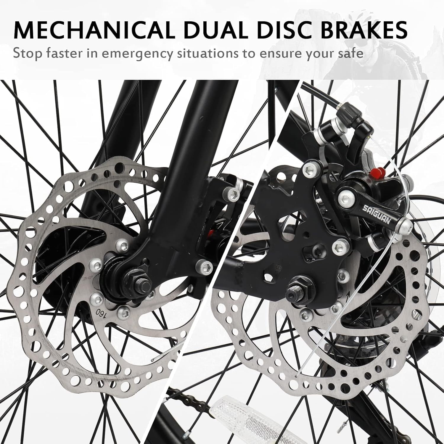 - PROFESSIONAL 7-SPEED SHIFTING SYSTEM: TZ500 derailleur and TX30 shift lever allow you to switch gears with smoothness by only pressing the button. The powerful mechanical dual disc brakes provide a stronger braking effect and a more sensitive braking response