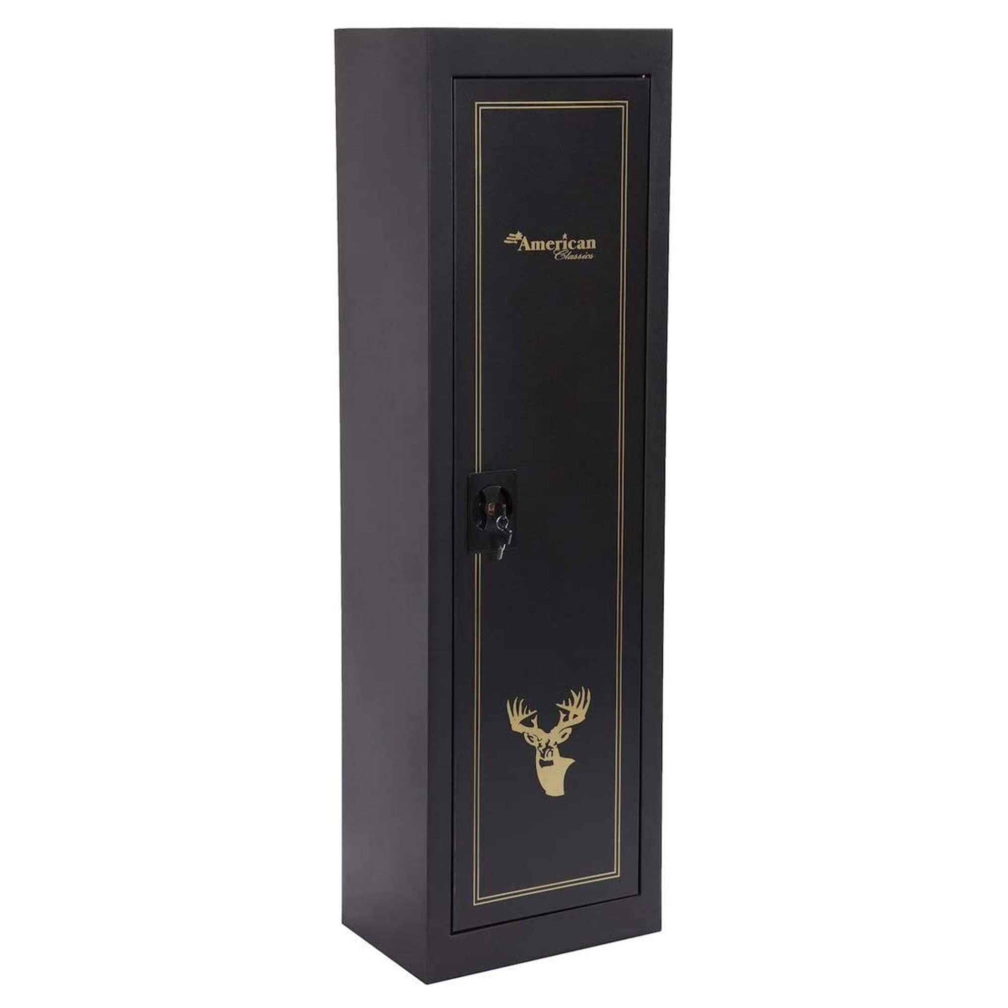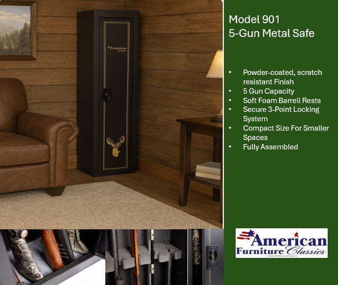 Gun safety is important whether you are keeping your guns stored inside your home or in your garage. This 5 Gun Metal Home Gun Cabinet by American Furniture Classics is designed to protect all of your weaponry and valuables from invaders, moisture, and dust. This gun storage cabinet is equipped with 2 separate storage spaces to store up to 5 long gun, pistols, and ammunition. To keep you and your valuables safe and secure, this gun storage cabinet is designed with a state-of-the-art 3-point locking system to keep intruders or curious hands away from your guns and ammunition. This storage safe is constructed out of heavy-duty material to ensure durability and security. A soft foam barrel rest and a carpeted floor are also built into this design to provide a luxurious resting spot for your valuable possessions. For a locking gun safe large enough to store and highlight your rifle collection, add the 5 Gun Safe Cabinet by American Furniture Classics to your