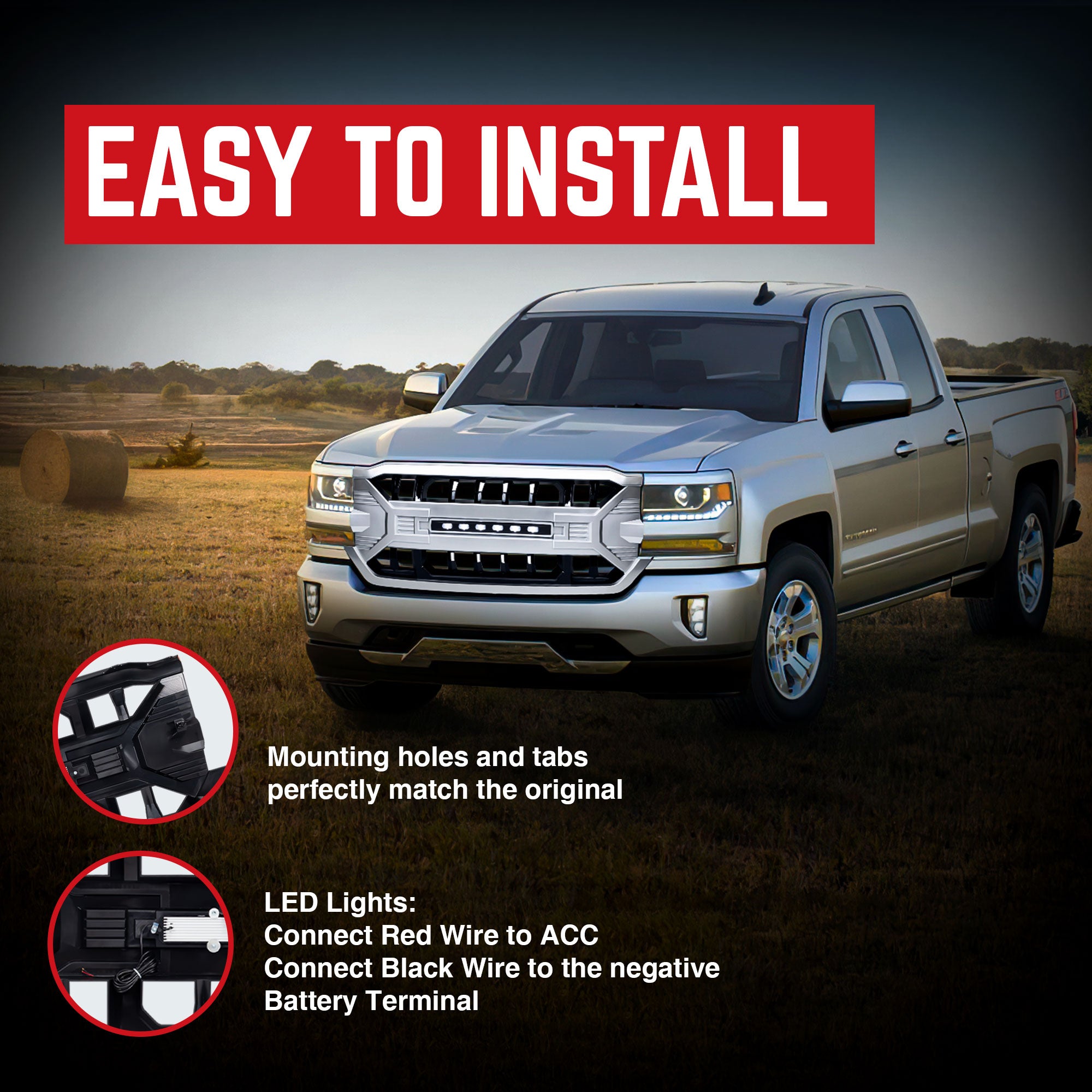 - Direct fit replacement for the factory grille, requiring no cutting or modifications