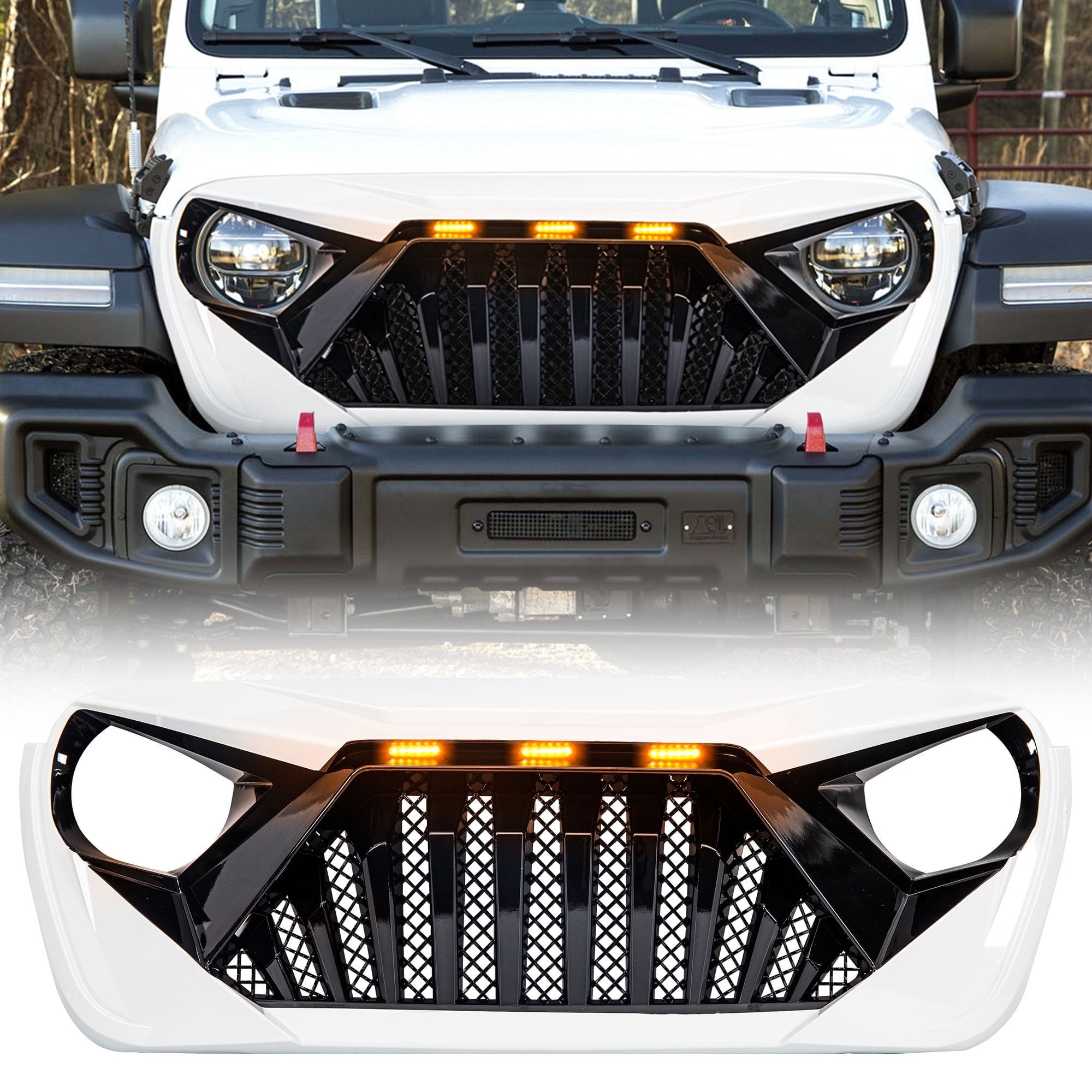The American Modified Front Goliath Grille makes your vehicle stand out. The aggressive, goliath-inspired design and durable materials add an aggressive look that can withstand harsh off-road travel hazards. Built to be almost universal, this Wrangler accessory fits most Jeeps from 2018 to 2023 models from various Jeep Wrangler JL and Gladiator Models. Ideal for quick garage work, be done in just 15 minutes! Illuminate the night with the innovative Amber Running Lights, offering versatility for both on and off-road adventures.