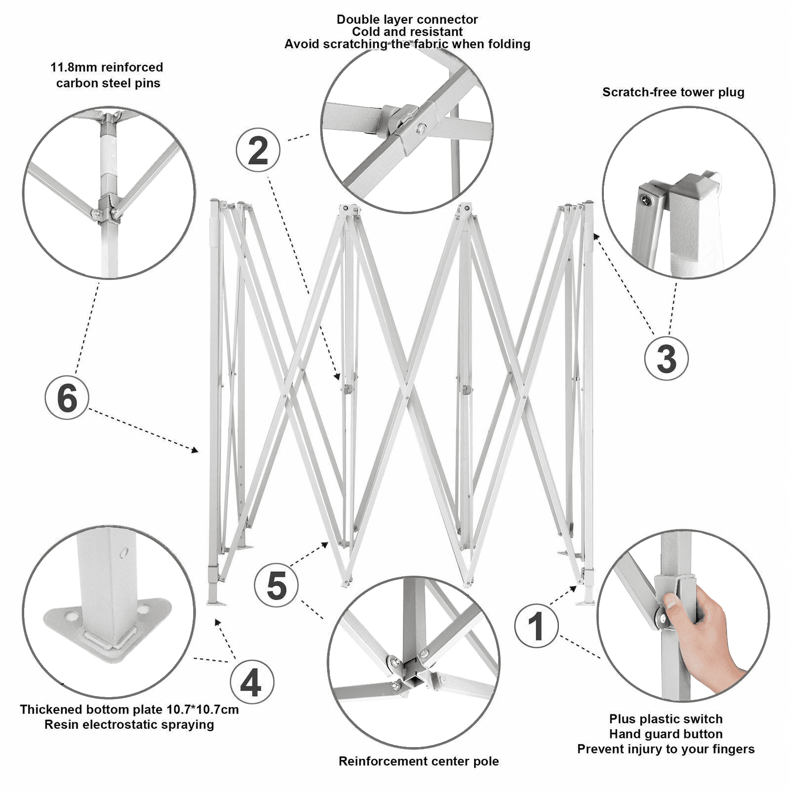 420D Polyester with PU coated. Strong & Light & Water resistance. Double-layer seam blanking, 3D version, not easy to seep. When using in rainy days, avoid collecting rainwater.(Velcro along the edge of canopy to attach sidewalls (No include sidewalls,