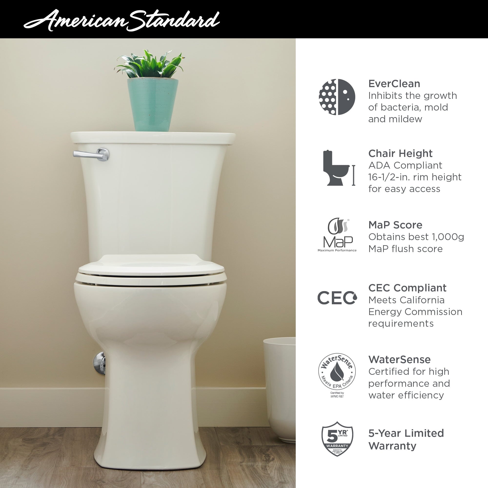 - High Efficiency, low-consumption toilet that uses 1.28 gallons per flush (4.8 liters per flush) and uses 20% less water