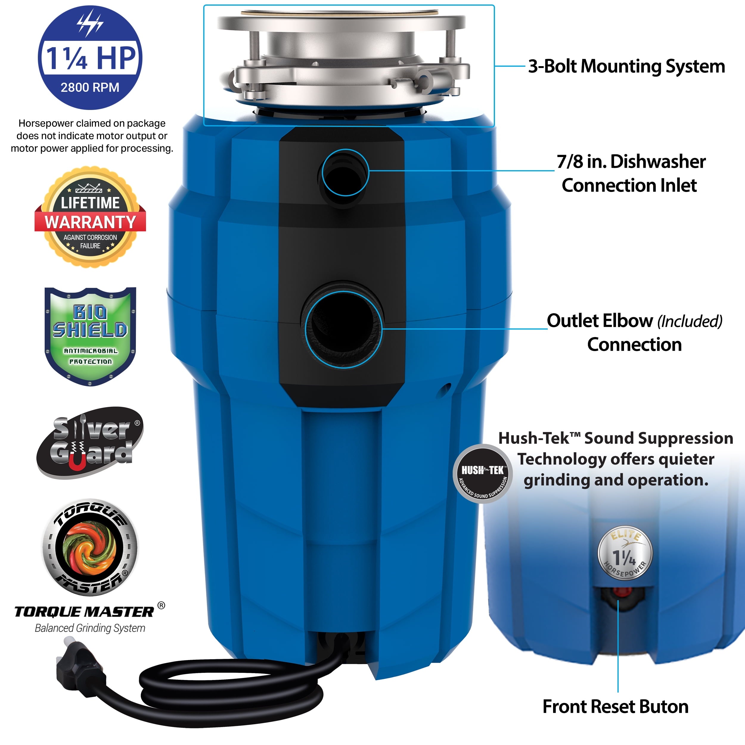 • 1.25 HP 2800 RPM continuous feed garbage disposal (Horsepower claimed on package does not indicate motor output or motor power applied for processing)