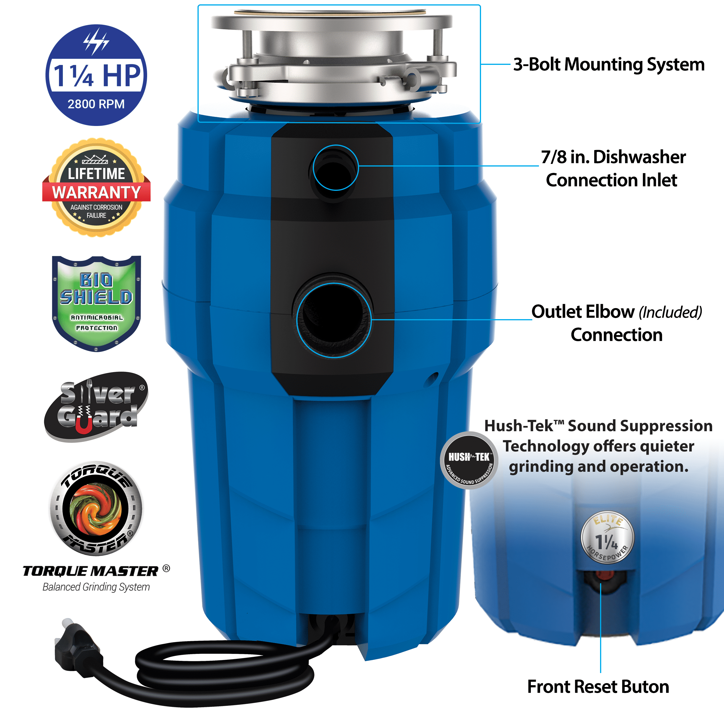 The American Standard Elite ASE-125HT, 1.25 HP continuous feed garbage disposal with power cord offers a high torque permanent magnet motor and features anti-microbial protection against odor. The torque master balanced grinding system means a smooth and quiet operation. The disposer comes with a 3-bolt mount system for quick installation and fast replacement of pre-existing 3-bolt mount disposers. The disposal also comes with a removable splash guard for easy cleaning and bulk food insertion. The all stainless-steel grinding components means a lifetime warranty against corrosion failure.