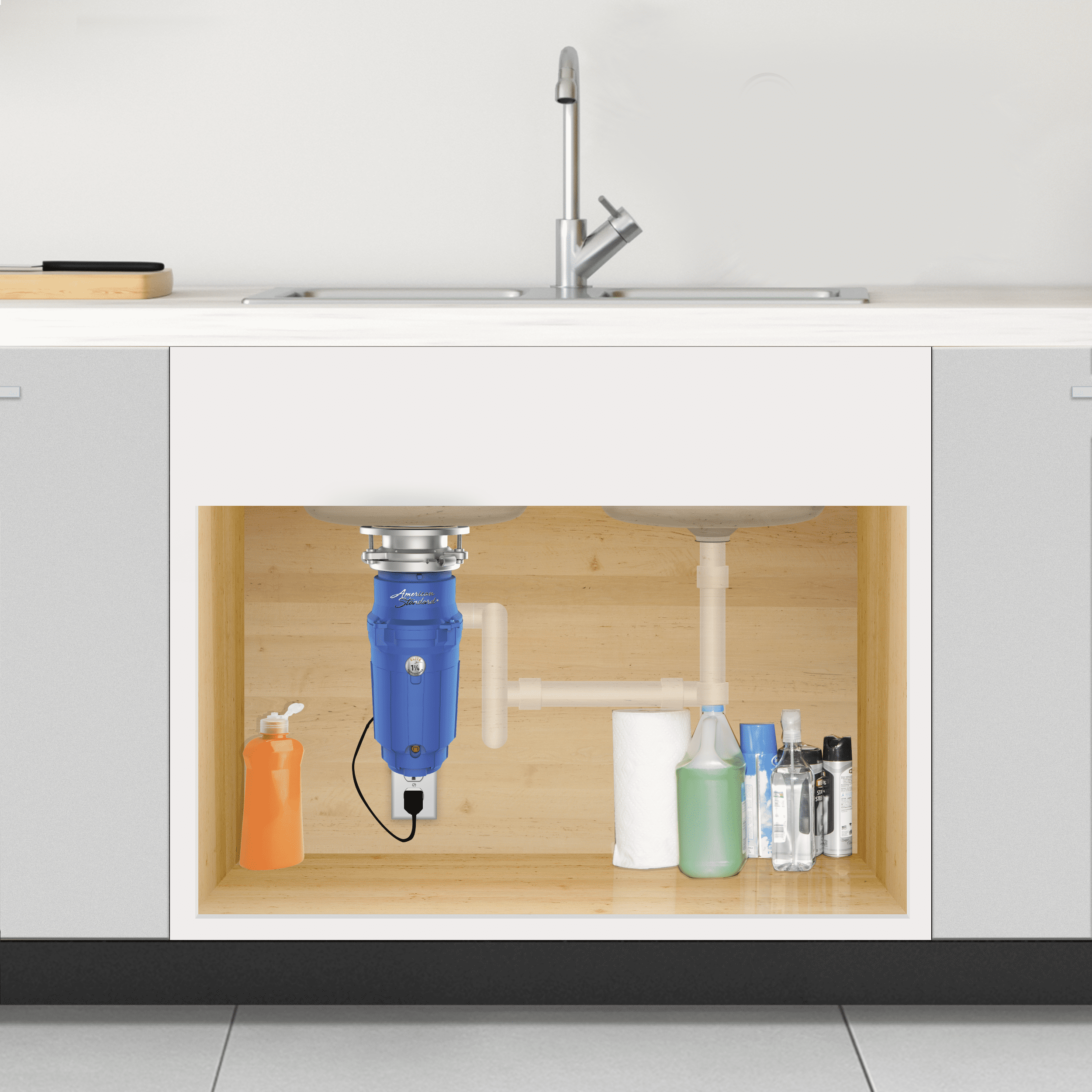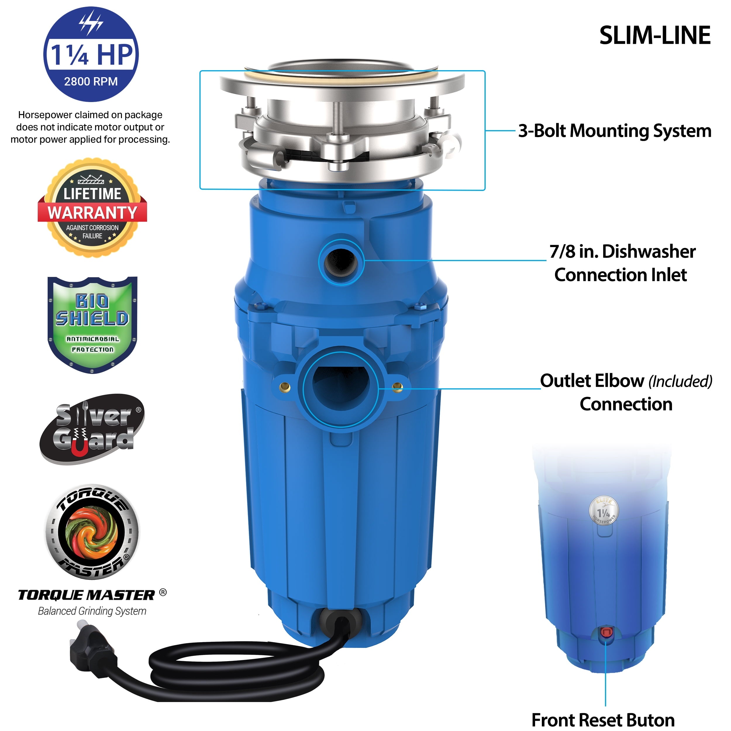 The American Standard Elite ASE-125-SL, Slim Line 1.25 HP continuous feed garbage disposal with power cord offers a high torque permanent magnet motor and features anti-microbial protection against odor. The torque master balanced grinding system means a smooth and quiet operation. The disposer comes with a 3-bolt mount system for quick installation and fast replacement of pre-existing 3-bolt mount disposers. The disposal also comes with a removable splash guard for easy cleaning and bulk food insertion. The all stainless-steel grinding components means a lifetime warranty against corrosion failure.
