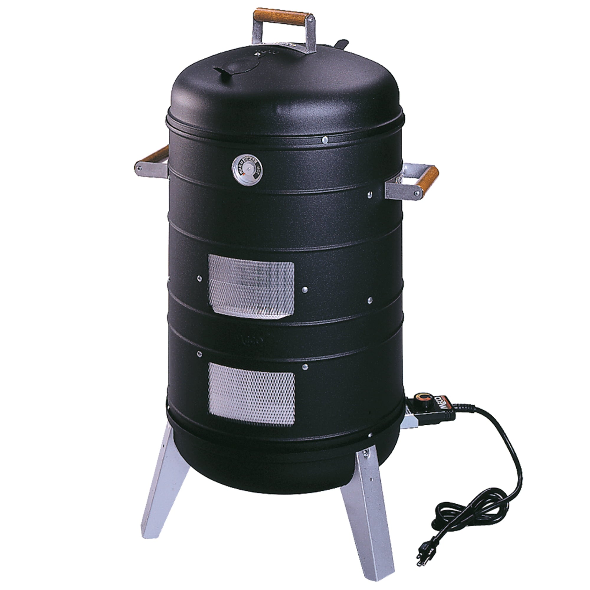 Perfect your back yard barbecuing with the Americana 2-in-1 Electric Water Smoker. This chimney-style smoker offers easy side access doors to monitor water and wood chips. Keep careful track of the temperature with the built-in temperature gauge. The 5.5 quart water pan and flavor channels ensure tender, moist, delicious smoked foods. When you are on the go the base and the hood of the smoker interlock to convert into a Lock ‘N Go electric grill. This electric smoker/grill can plug into any standard outlet. Savor slow-cooked foods or enjoy burgers at the lake with this versatile smoker and grill.