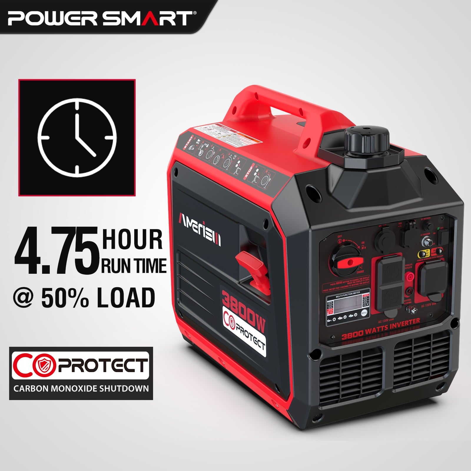 The Amerisun Inverter Generator, your ideal power solution for outdoor adventures and emergency use. With a rated wattage of 3,300W and a surge capacity of 3,800W, it’s powerful enough to run essential appliances during blackouts or on camping trips. Stay informed with the 5-in-1 digital display, which tracks vital stats like voltage, frequency, running hours, and more. Built-in alerts for low oil and overload protection ensure smooth, worry-free operation. Enjoy up to 4.75 hours of runtime at 50% load, thanks to its efficient fuel-saving inverter technology. Its compact, lightweight design makes it easy to transport and store, offering maximum convenience. Rely on the Amerisun Inverter Generator for dependable power when you need it most. Get yours today and feel secure with a reliable backup power source always at hand.