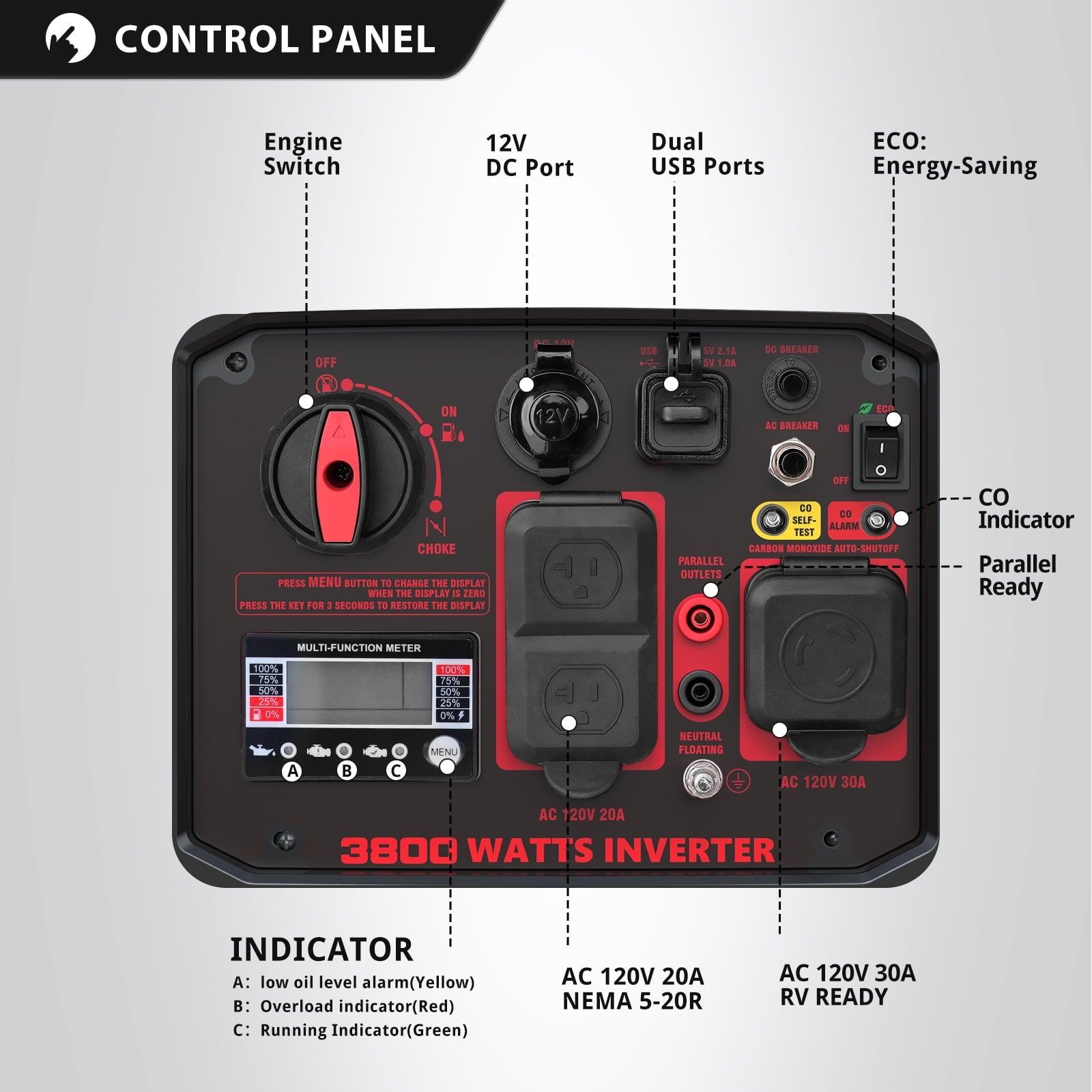 - Comprehensive Digital Display: Features a 5-in-1 digital display showing voltage, frequency, runtime hours, and alerts for low oil and overload protection, ensuring clear operational monitoring.