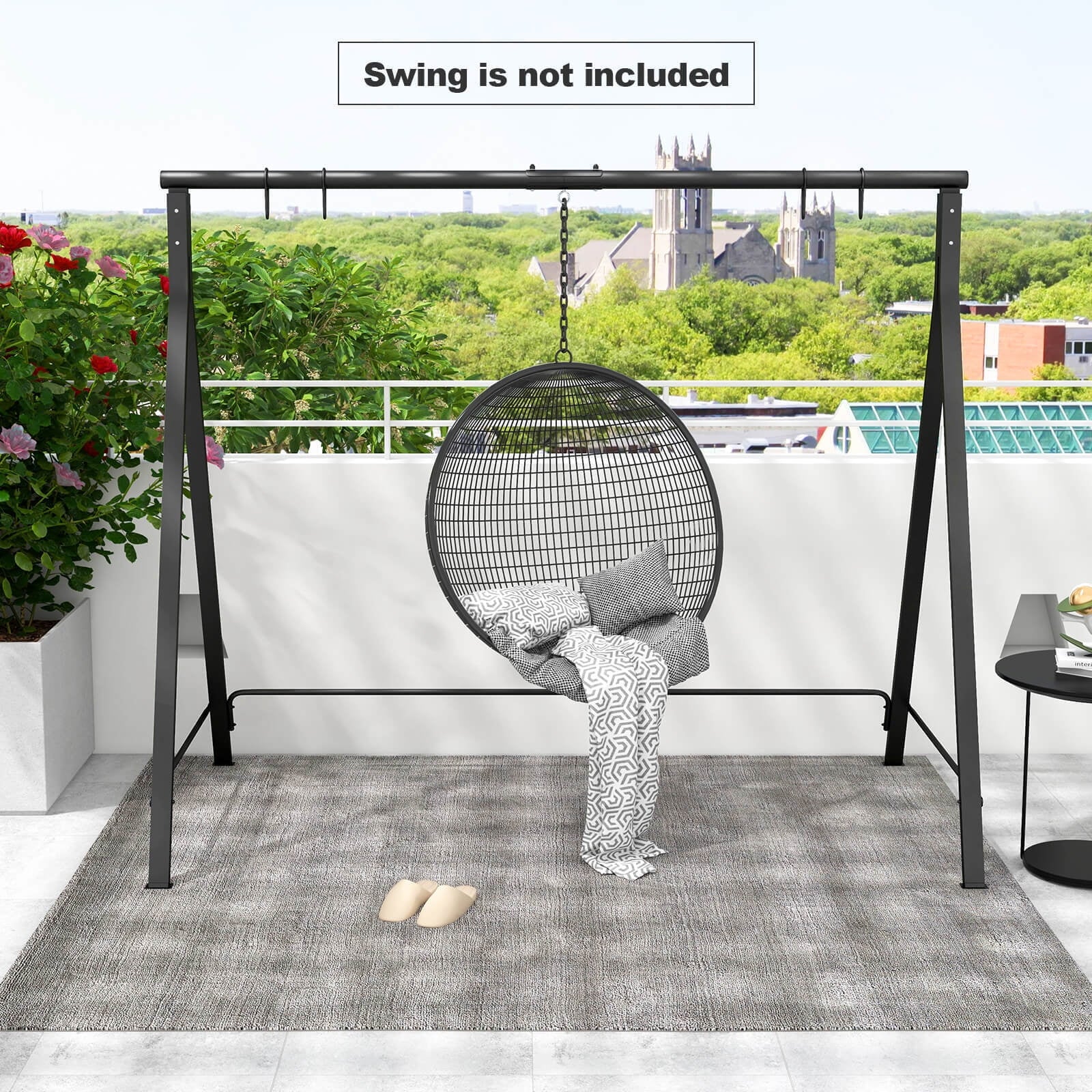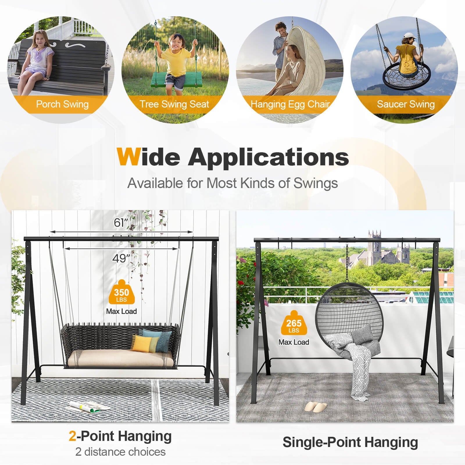 This 2-in-1 swing is the perfect addition to any outdoor space and will bring you exceptional fun. The swing is designed with 2 adjusting rings on each side to achieve two-point suspension, and our swing frames are durable and can withstand even the most intense rocking motion, ensuring maximum safety and stability. The A-frame construction features a bottom bracket connection, stable tight connection, and dual frame stabilizers that not only increase its durability, but also provide a sturdy support system for multiple swings for carefree play. The swing set saves installation trouble. With its versatile design, this swing rack offers 2-point suspension and single-point suspension options to suit your different needs. Our A-frame swing sets are designed to provide stable and durable support for your swing. Built of high-quality metal, this A-frame swing can withstand large weights and provide endless outdoor fun.