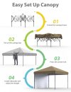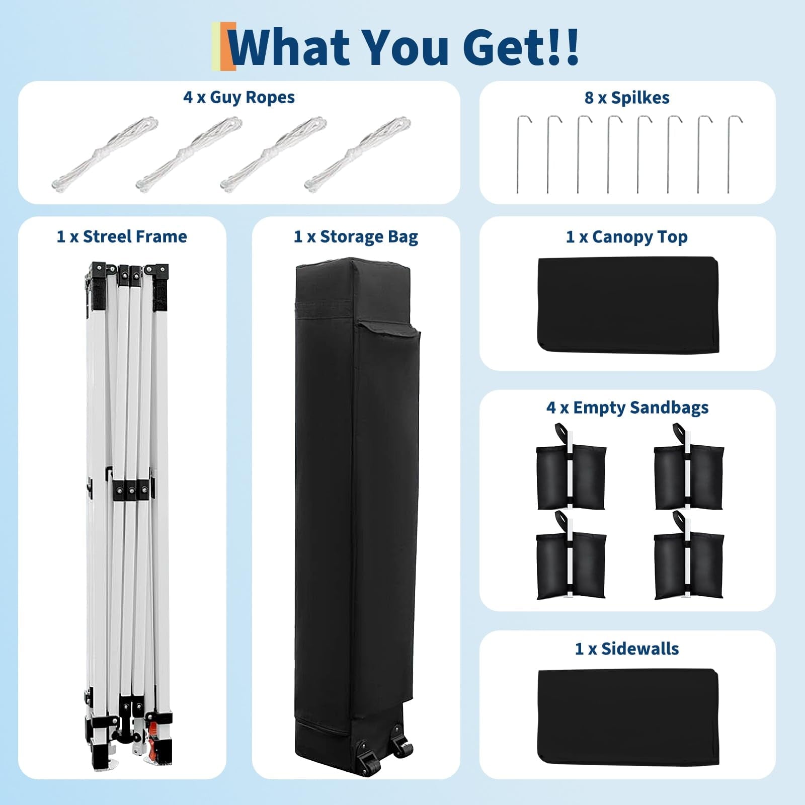3.Quick & Easy Setup: With a unique one-touch deployment system, this pop-up canopy can be set up solo in under 10 minutes. The included wheeled carry bag makes transportation and storage of all accessories effortless.