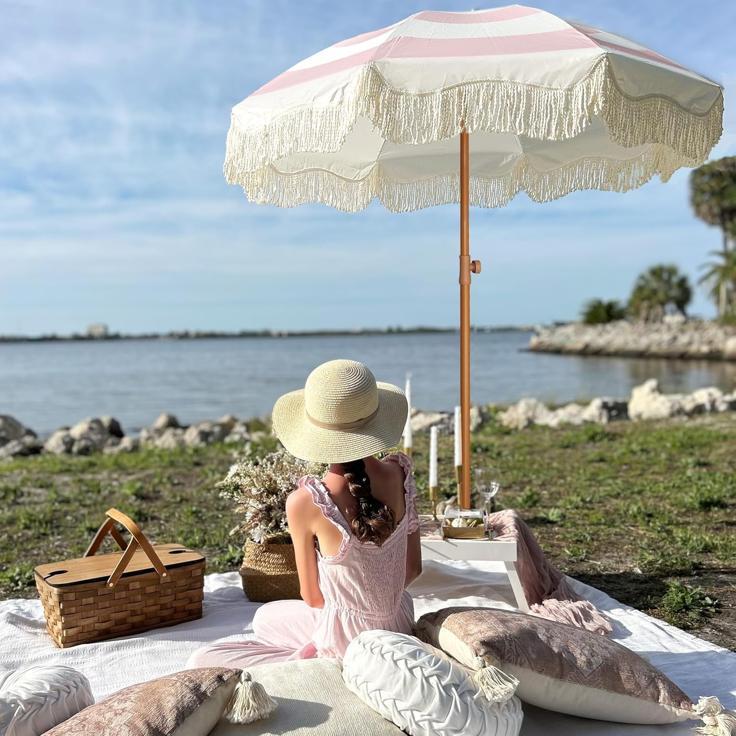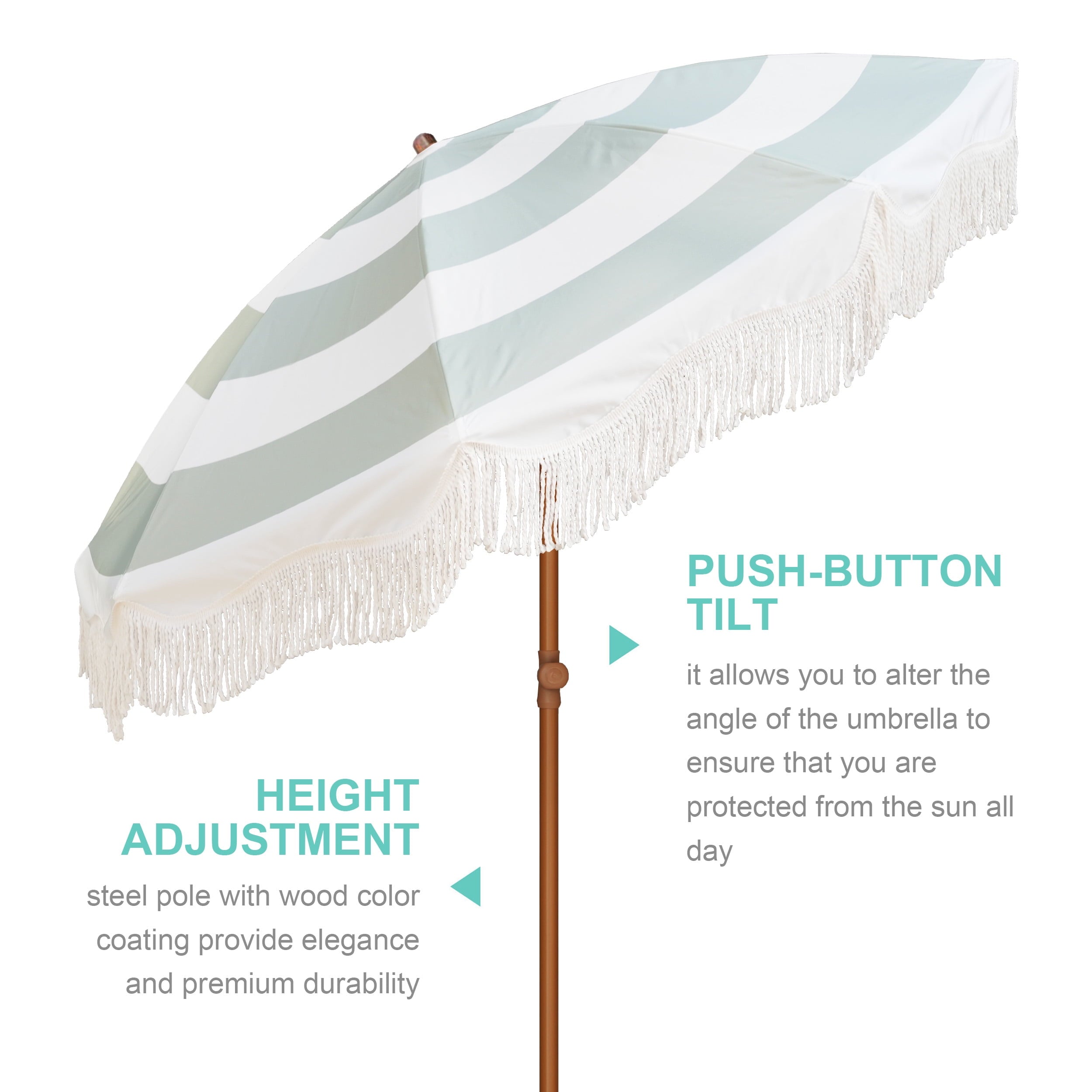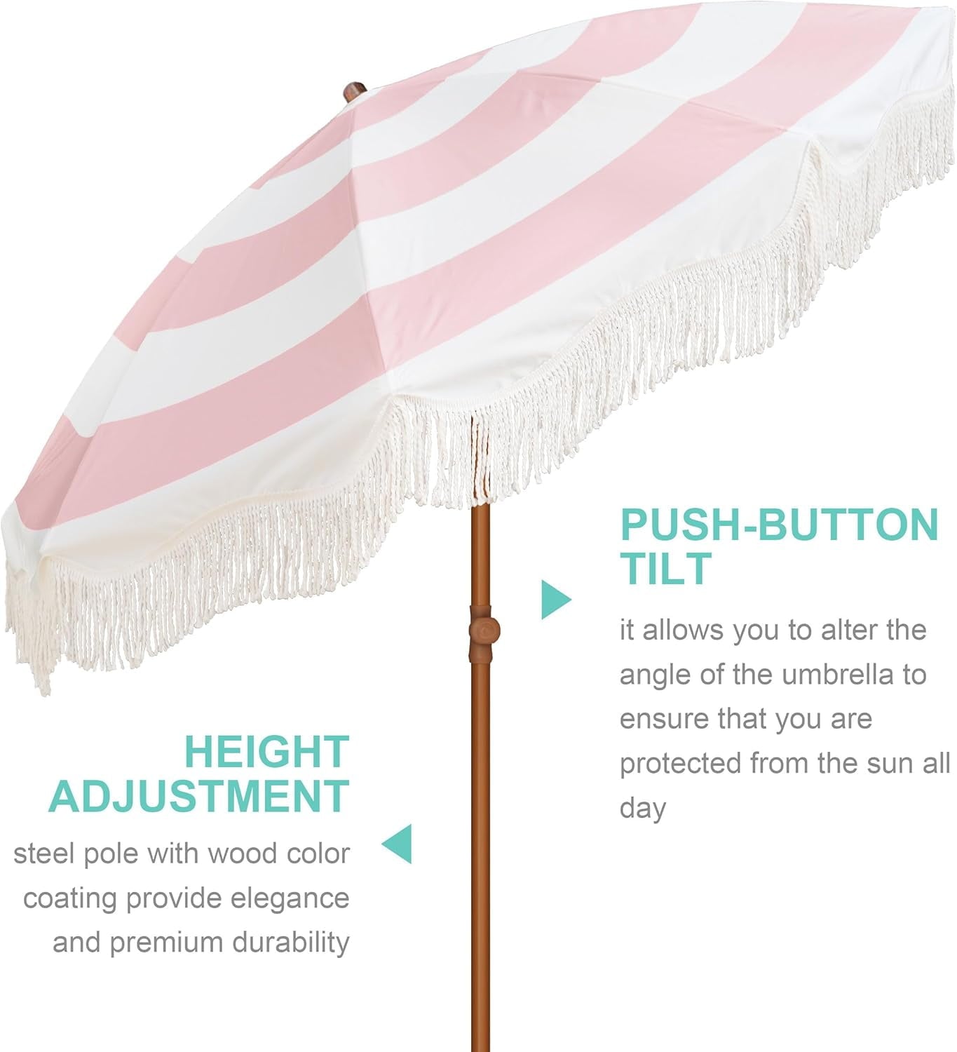 Add a chic touch to your outdoor space with this AMMSUN 6.5′ Boho Tassel Fringe Umbrella. Perfect for the beach, patio, backyard, pool, lawn, and picnic, it offers UPF50+ sun protection, blocking over 98% of UV rays. The push-button tilt allows easy angle adjustment for all-day shade. Built with a strong steel pole and 8 fiberglass ribs, it stays stable in windy conditions. Lightweight and portable, it weighs just 7.15 lbs. and includes a bag for effortless transport. Easy to install and store.