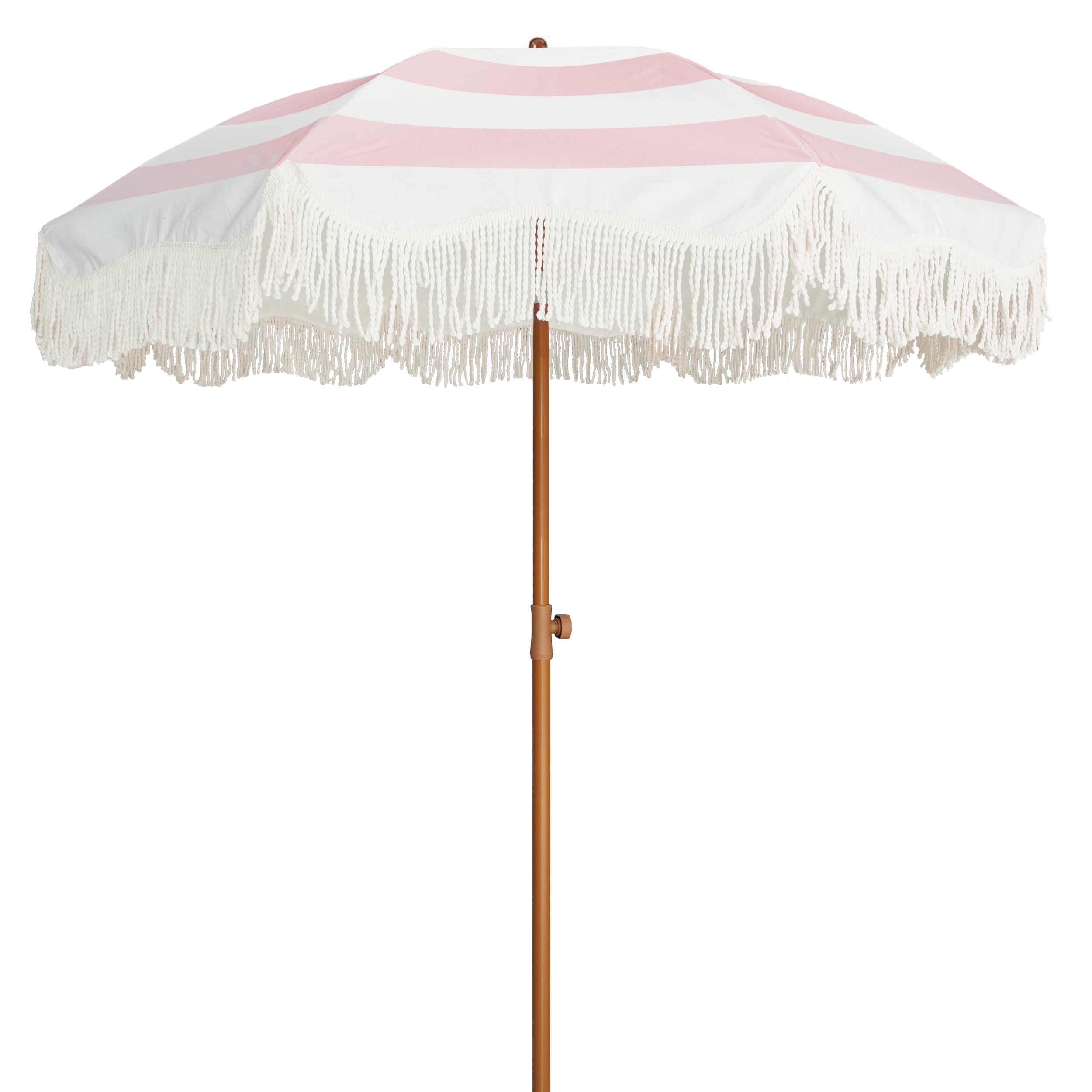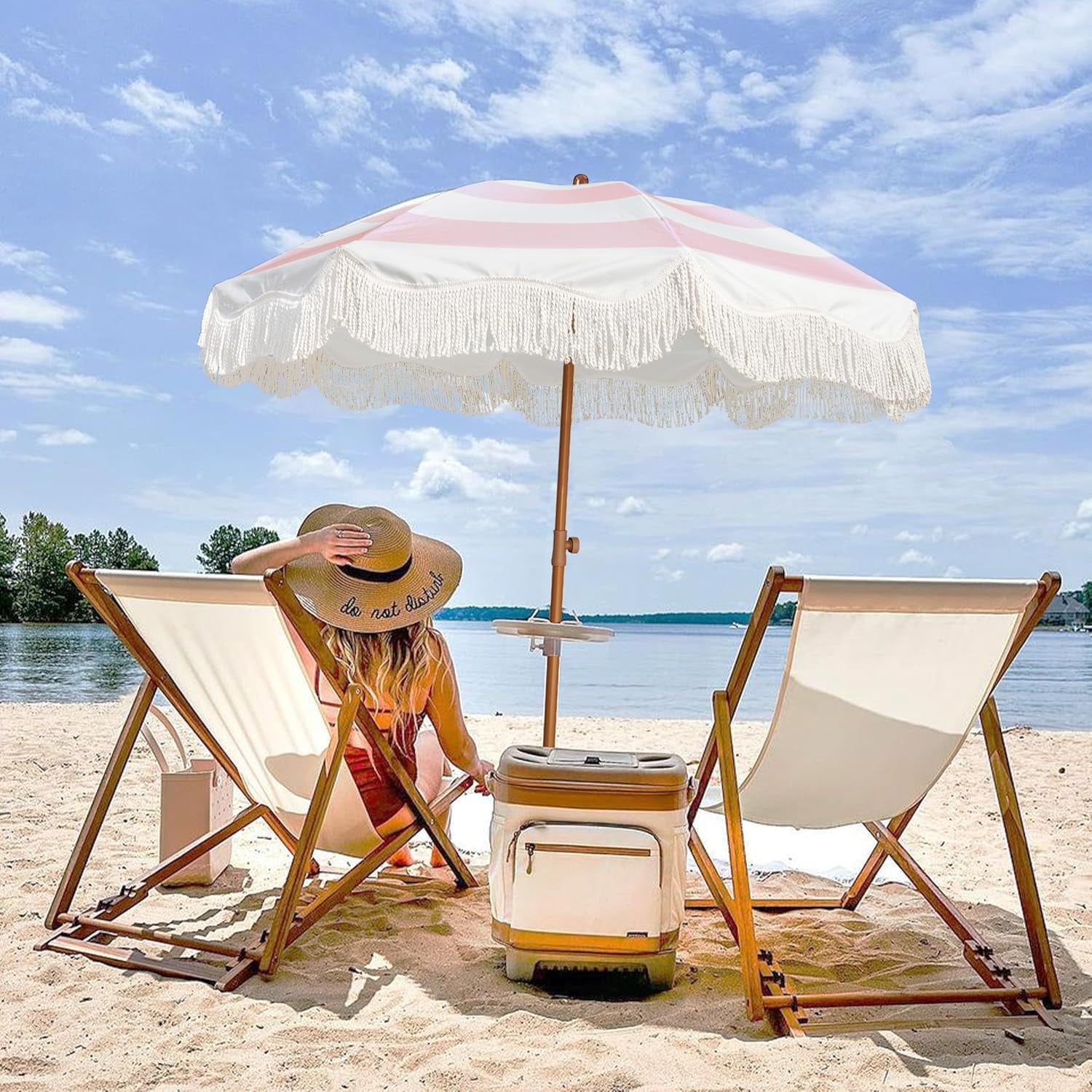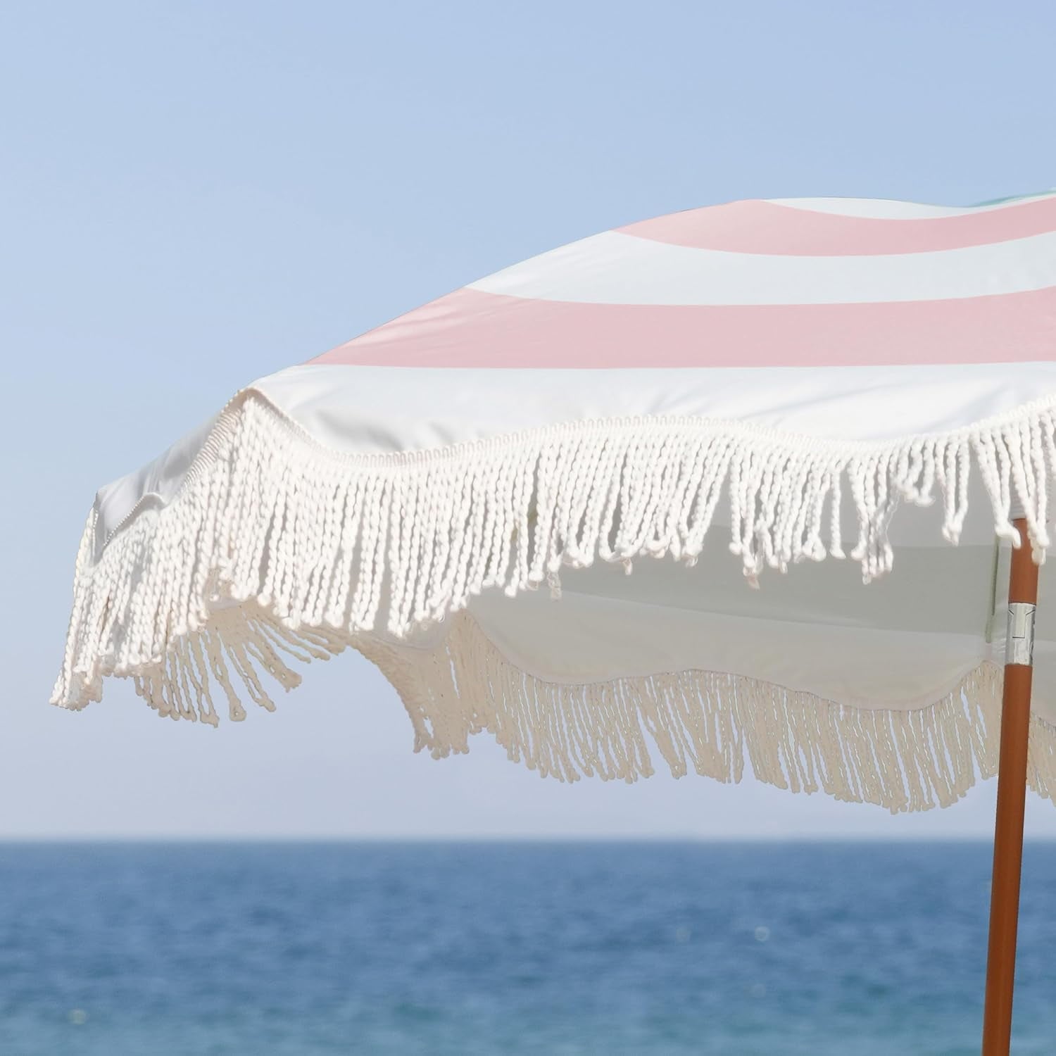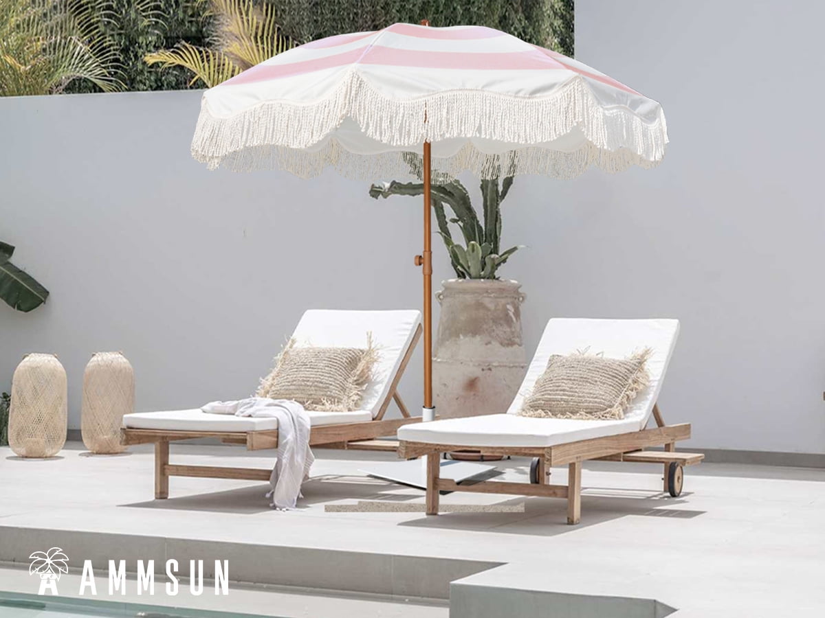 Add a chic touch to your outdoor space with this AMMSUN 6.5′ Boho Tassel Fringe Umbrella. Perfect for the beach, patio, backyard, pool, lawn, and picnic, it offers UPF50+ sun protection, blocking over 98% of UV rays. The push-button tilt allows easy angle adjustment for all-day shade. Built with a strong steel pole and 8 fiberglass ribs, it stays stable in windy conditions. Lightweight and portable, it weighs just 7.15 lbs. and includes a bag for effortless transport. Easy to install and store.