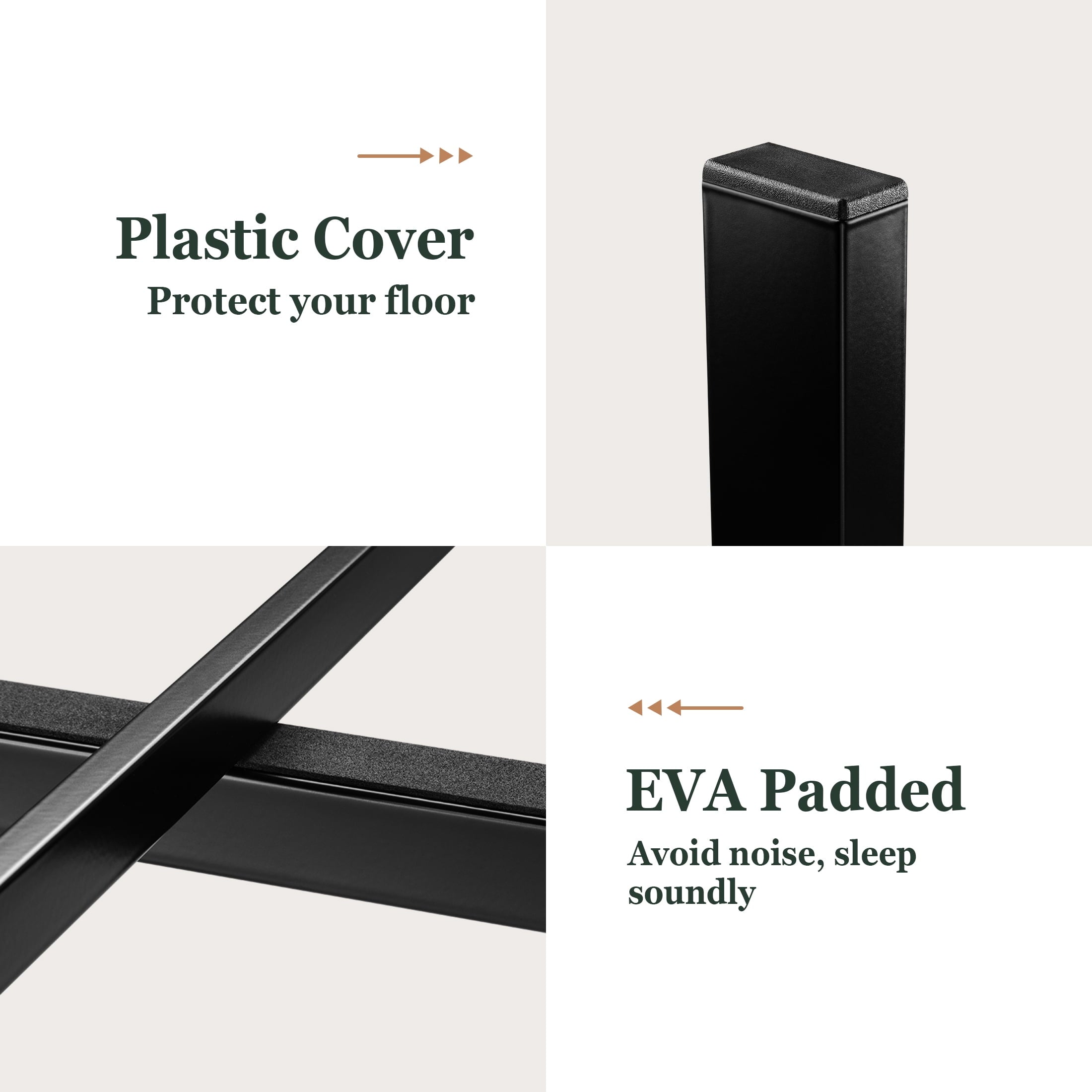 – We increase the thickness of the steel tube and improve the support legs to a square tube, using top-quality screws and non-slip around the leg support, making the whole iron bed more durable and safer than a traditional metal bed.